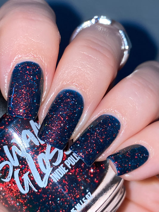 Ingredients: Nitrocelluose, Ethyl Acetate, Butyl Acetate, Isopropyl Alcohol, Ethyl Alcohol, Triphenyl Phosphate, and can contain: Aluminum Powder, Mica, Iron Oxide, Ferric Ferrocyanide, Ultramarines, Red 6, Red 22, Red 30, Red 28, Red 34 , Red 7, Orange 5, Yellow 5, Yellow 11, Yellow 6, Yellow 10, Blue 1, Black 2, Violet 2 Ext , Titanium Dioxide, Synthetic Fluorophylogopite, Calcium Sodium Borosilicate, Polyethylene Terephthalate, Polyurethane 33, Silver, Chromium, Magnesium Fluoride, Bismuth Oxychloride