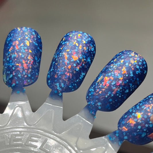 Ingredients: Nitrocelluose, Ethyl Acetate, Butyl Acetate, Isopropyl Alcohol, Ethyl Alcohol, Triphenyl Phosphate, and can contain: Aluminum Powder, Mica, Iron Oxide, Ferric Ferrocyanide, Ultramarines, Red 6, Red 22, Red 30, Red 28, Red 34 , Red 7, Orange 5, Yellow 5, Yellow 11, Yellow 6, Yellow 10, Blue 1, Black 2, Violet 2 Ext , Titanium Dioxide, Synthetic Fluorophylogopite, Calcium Sodium Borosilicate, Polyethylene Terephthalate, Polyurethane 33, Silver, Chromium, Magnesium Fluoride, Bismuth Oxychloride