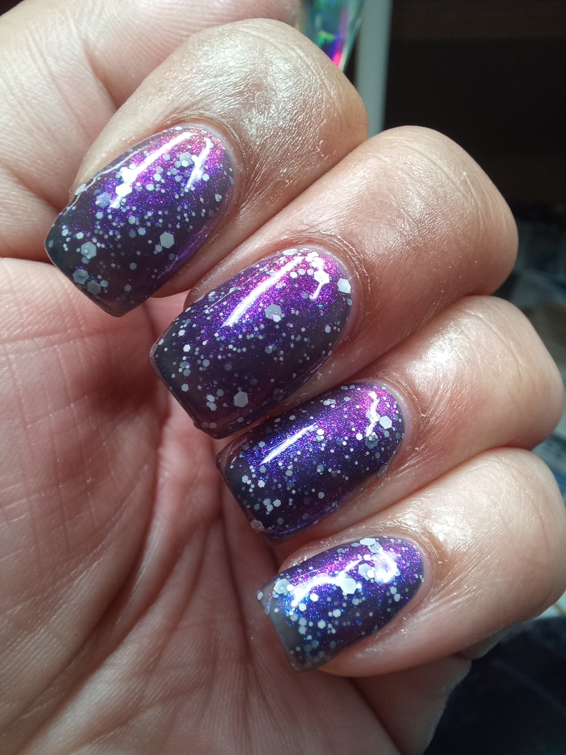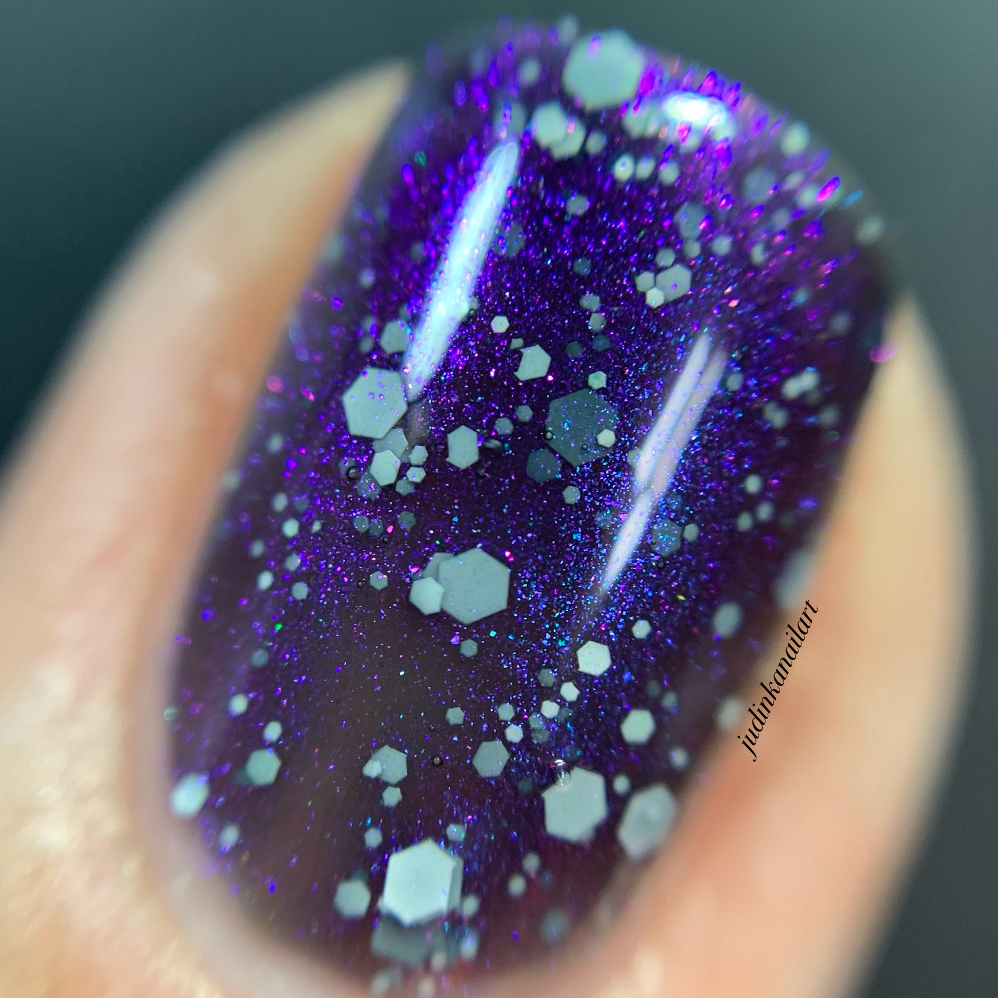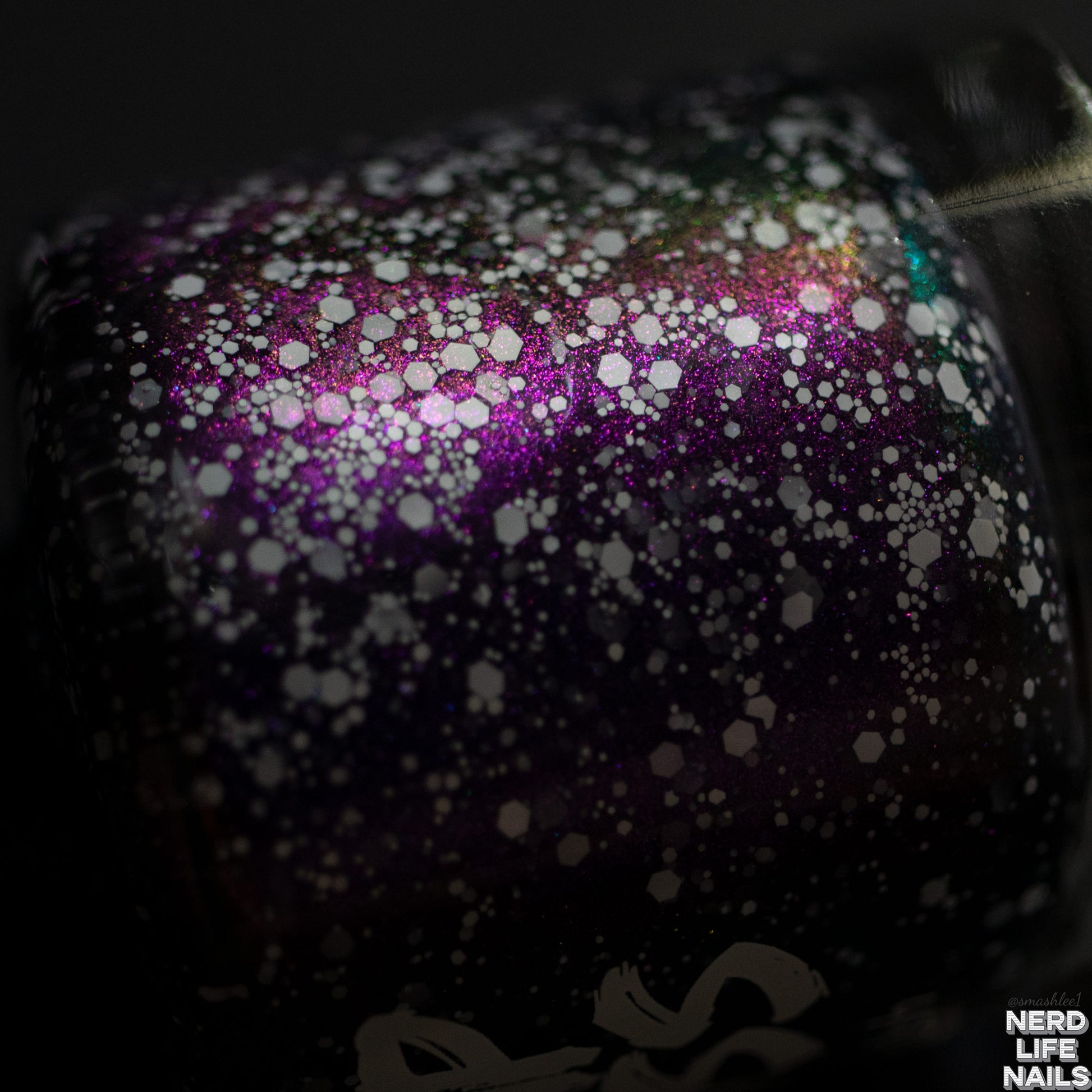 a black jelly swimming with shifting shimmer and white matte hexes