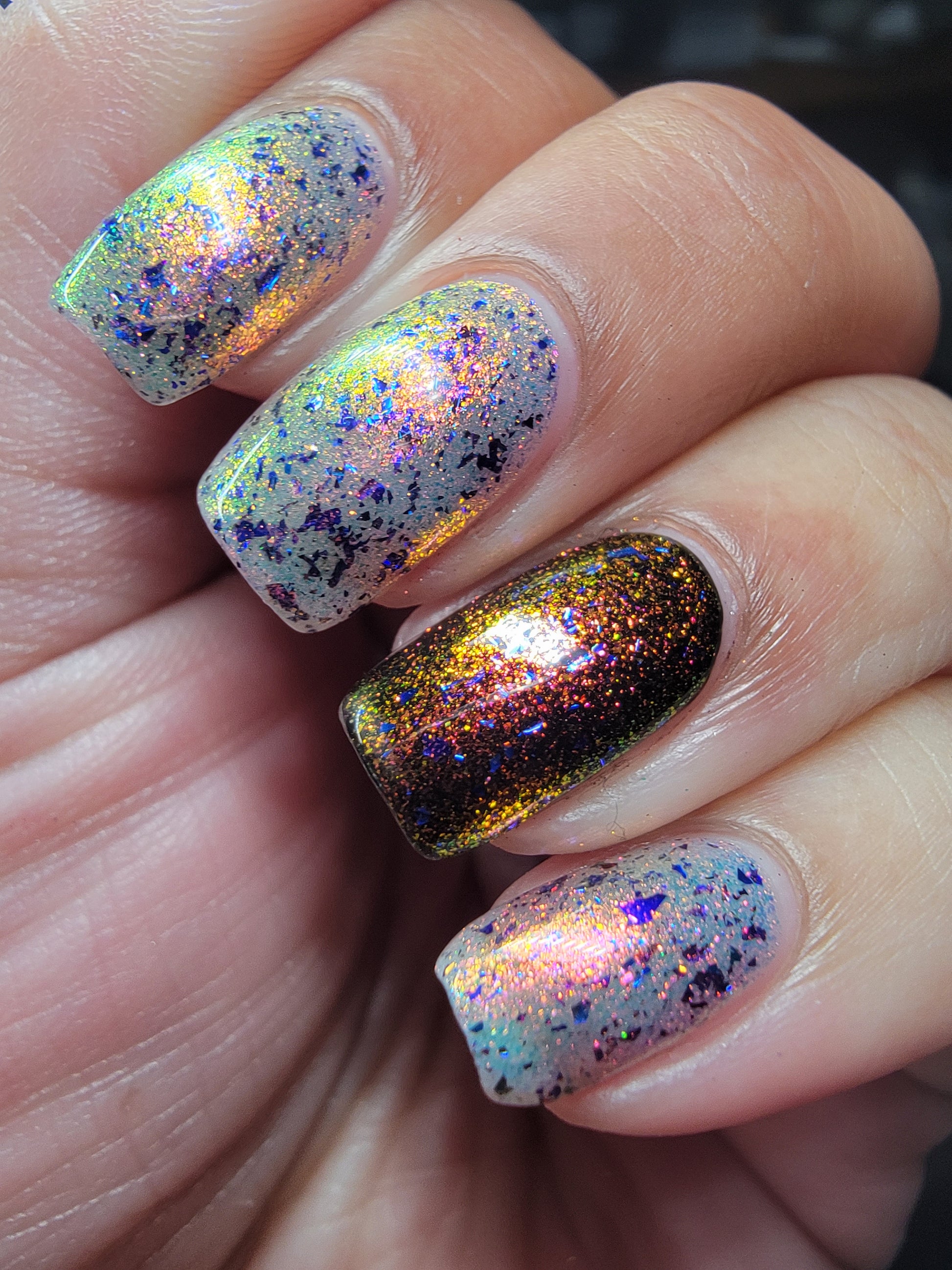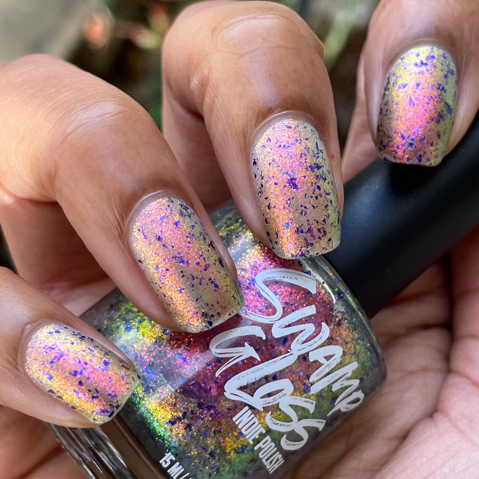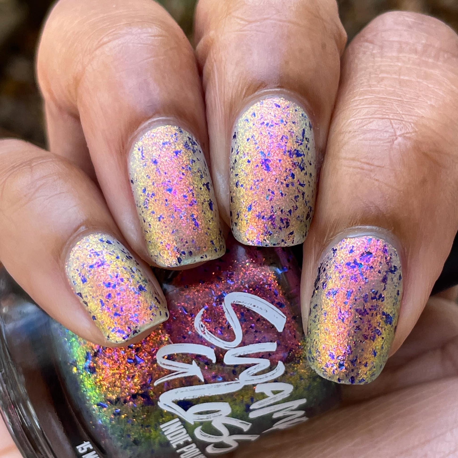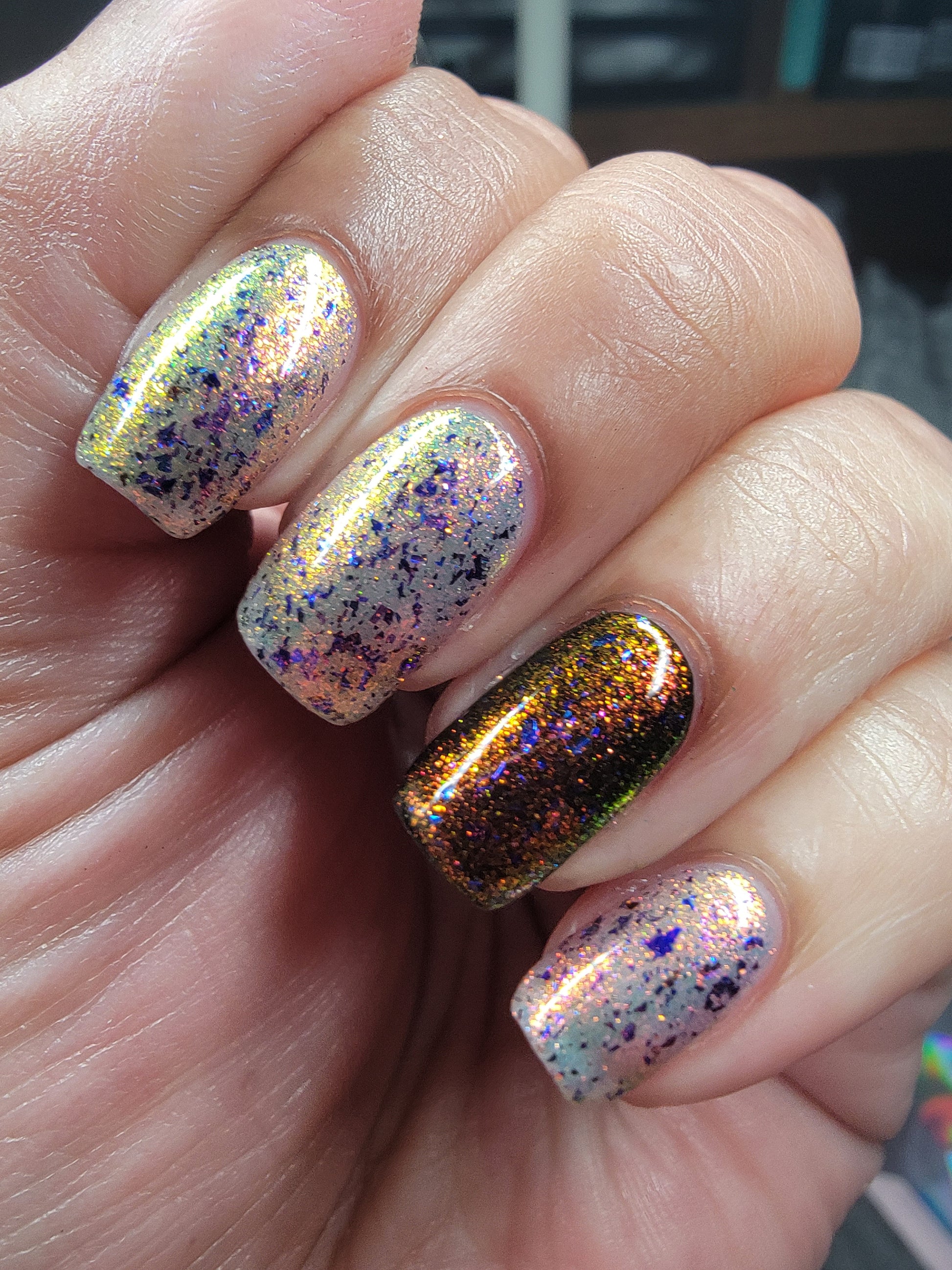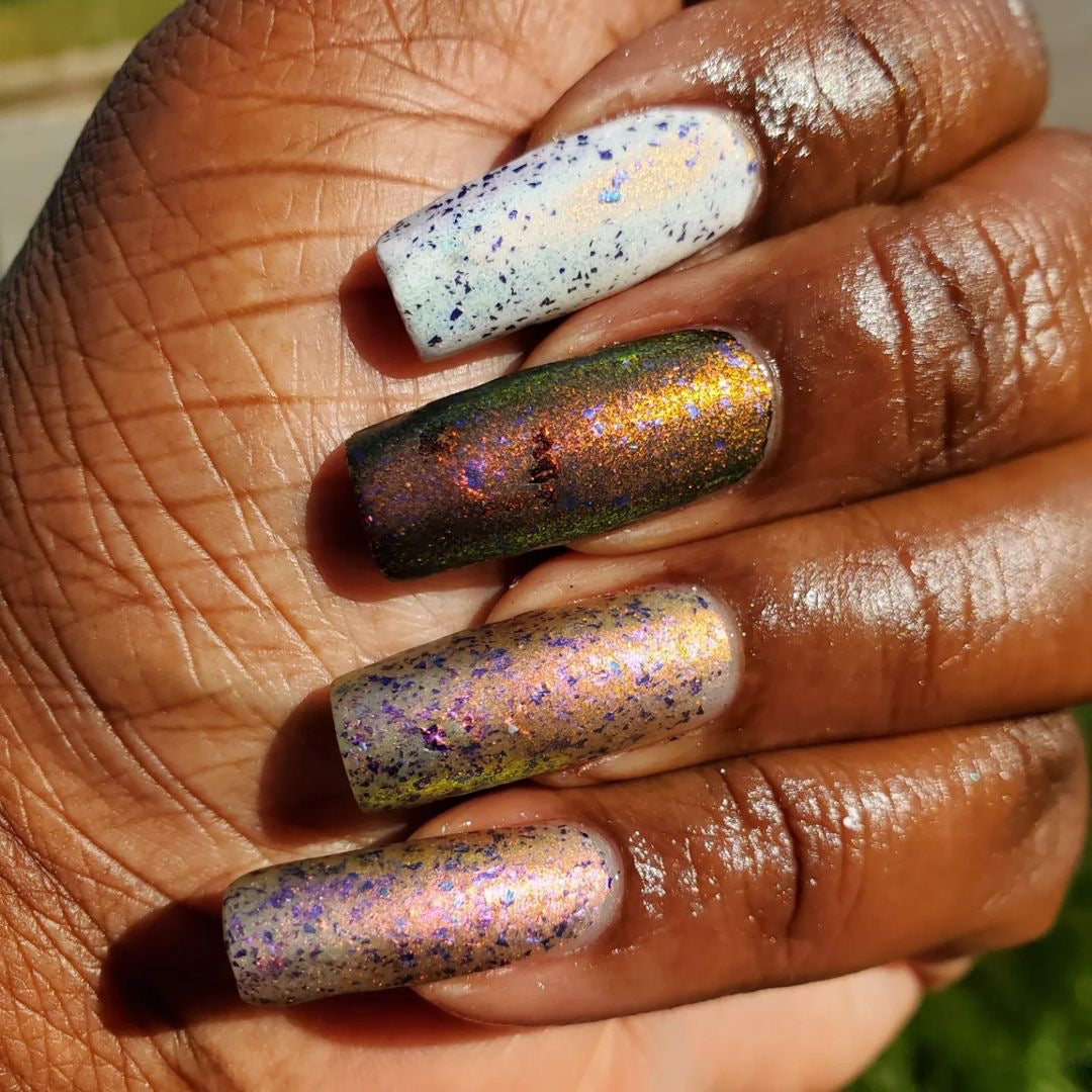 But Elijah Wood - a sheer base stacked with metallic shifting shimmer and violet metallic flakes