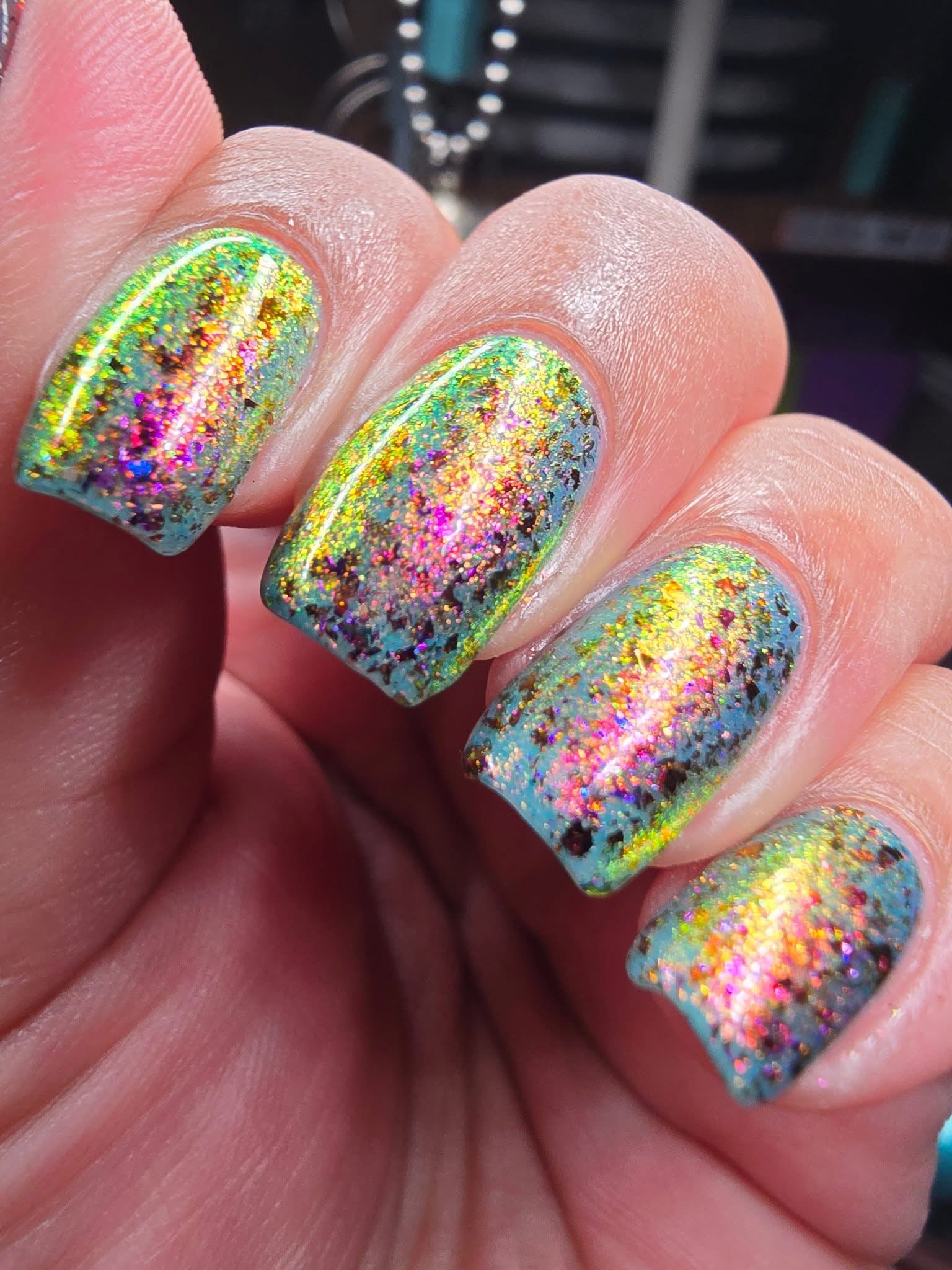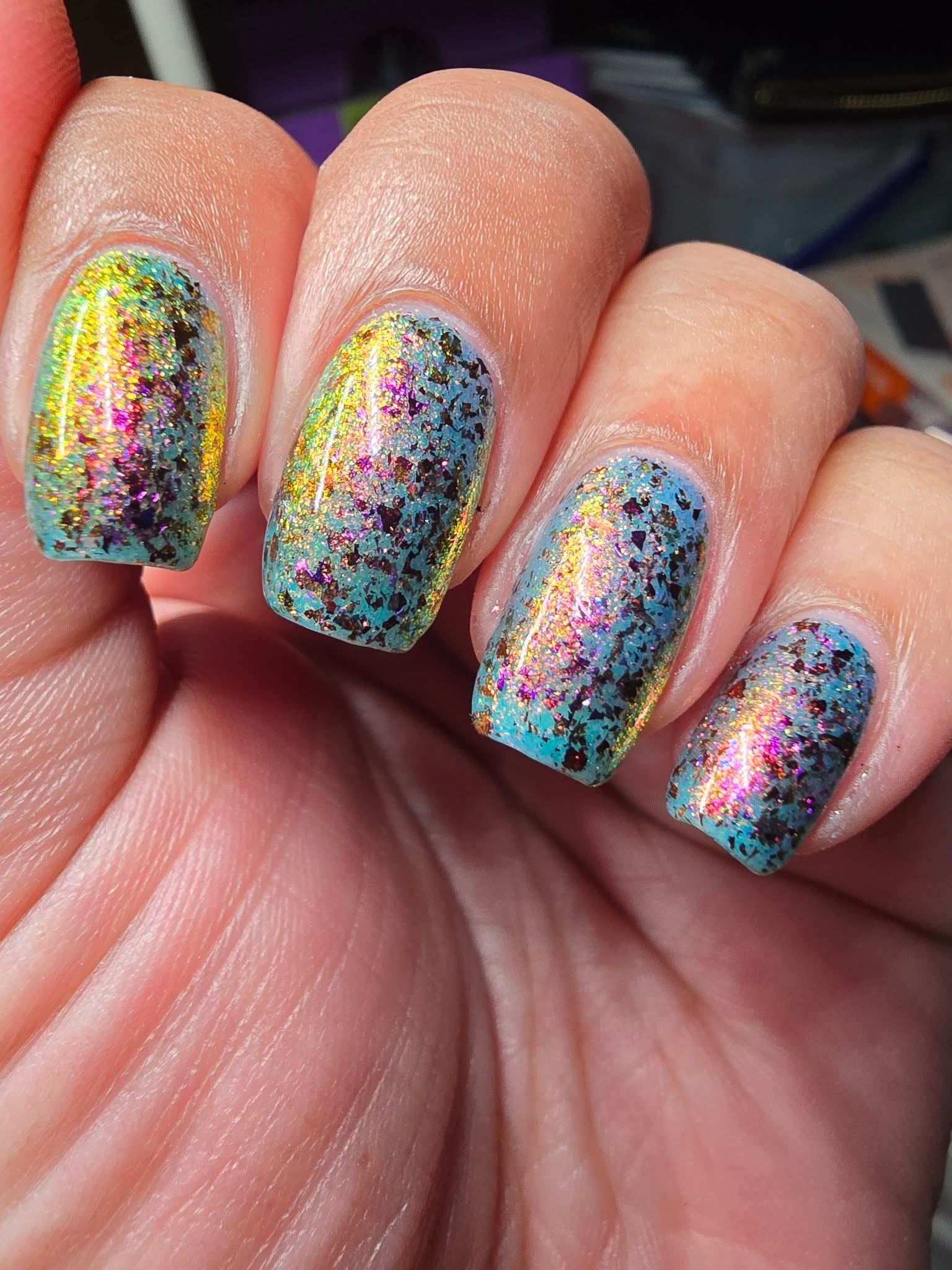A sheer periwinkle base, packed with candy Aurora shifting shimmer and metallic multichrome and iridescent shifting flakes