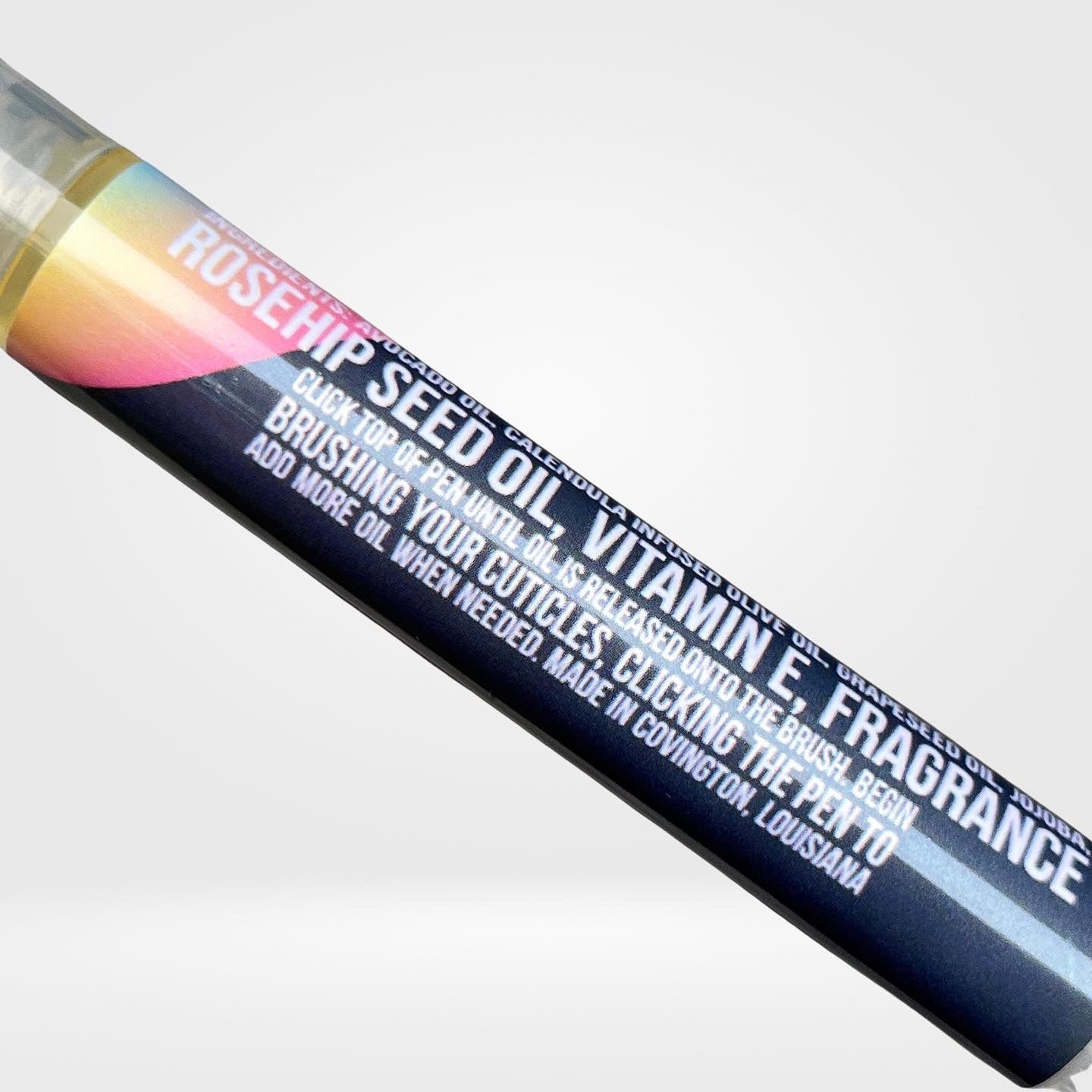 Cuticle Oil - avocado oil, calendula infused olive oil, Grapeseed oil, jojoba, rosehip seed oil, tocopherol (vitamin e) in a 3ml click pen (actual oil volume 3.7ml)