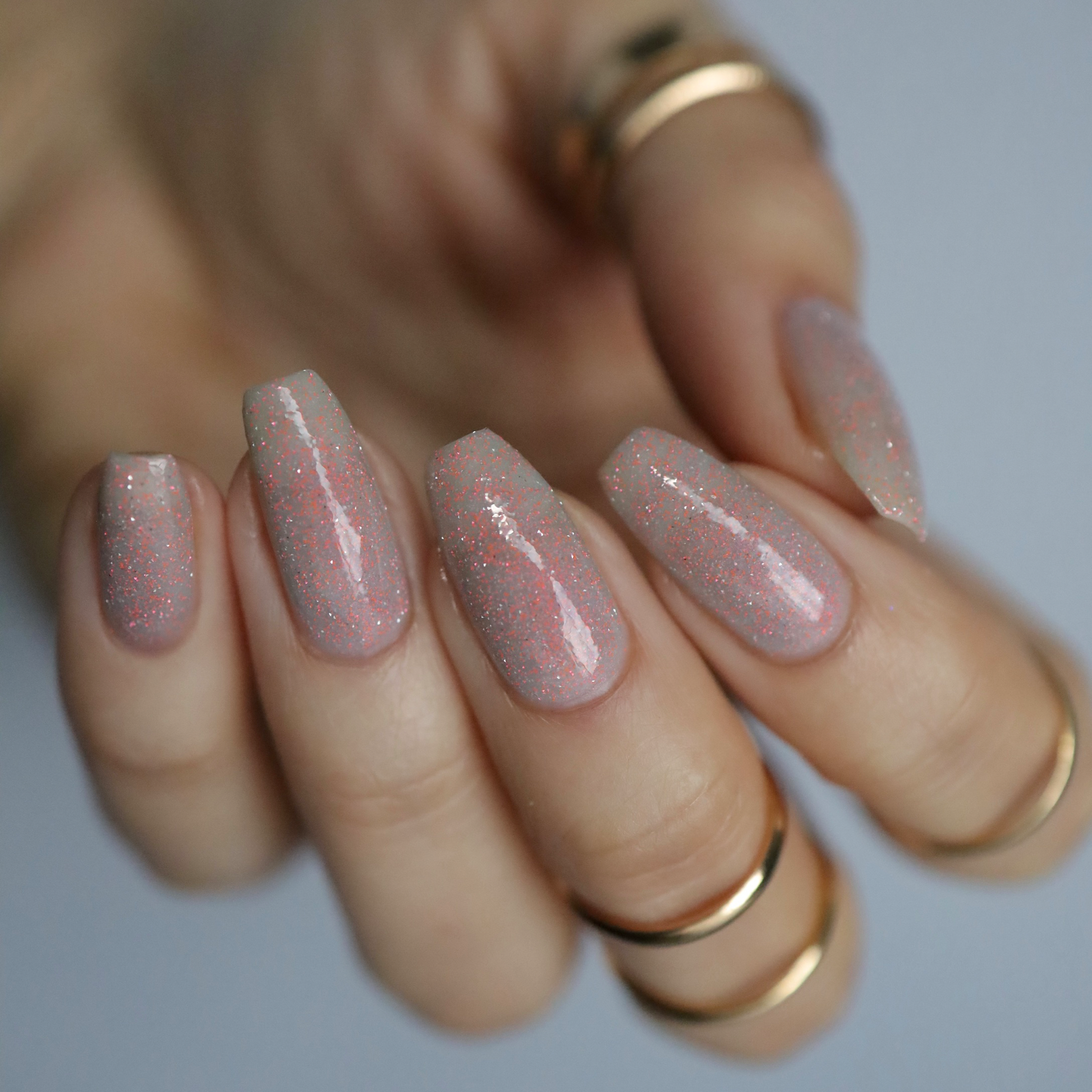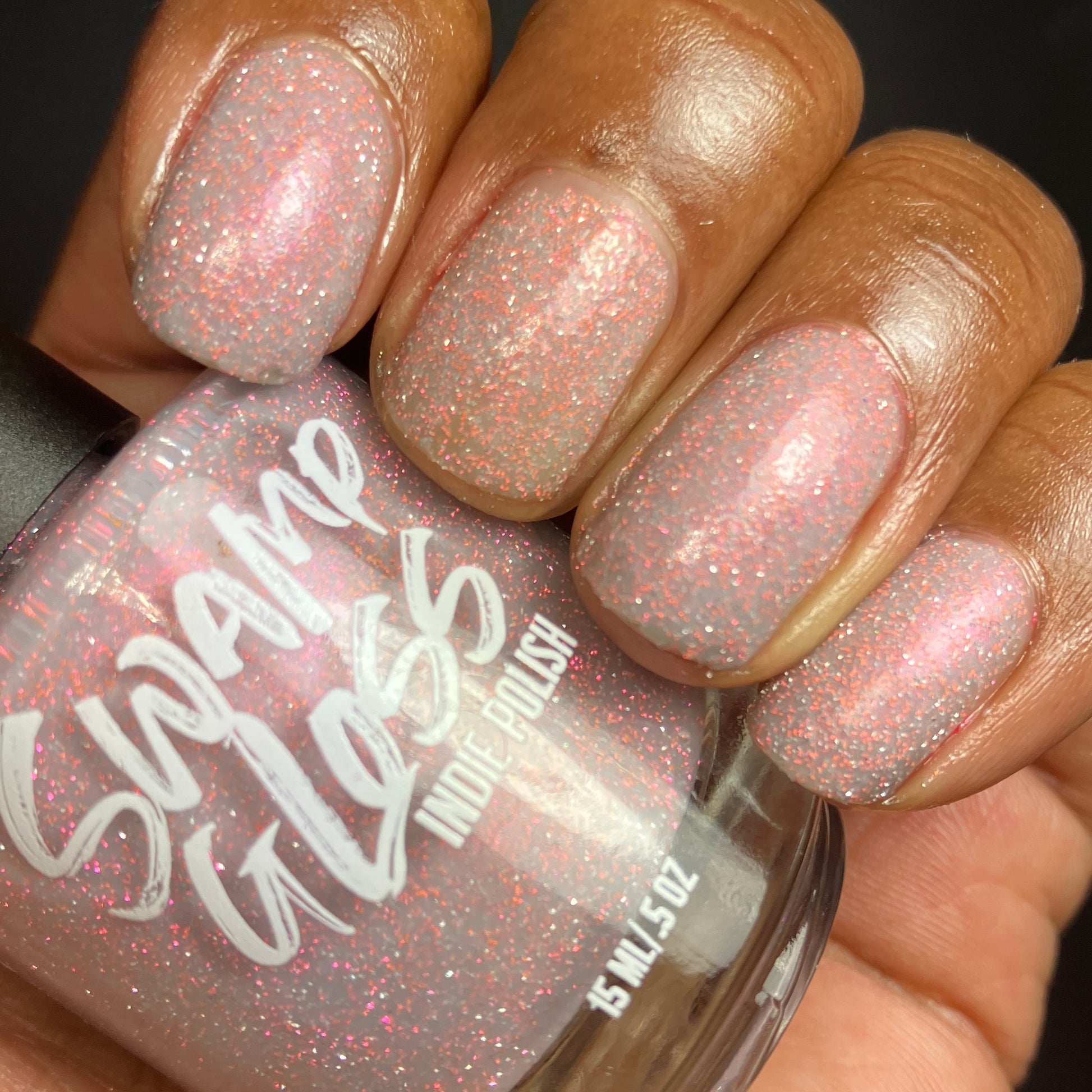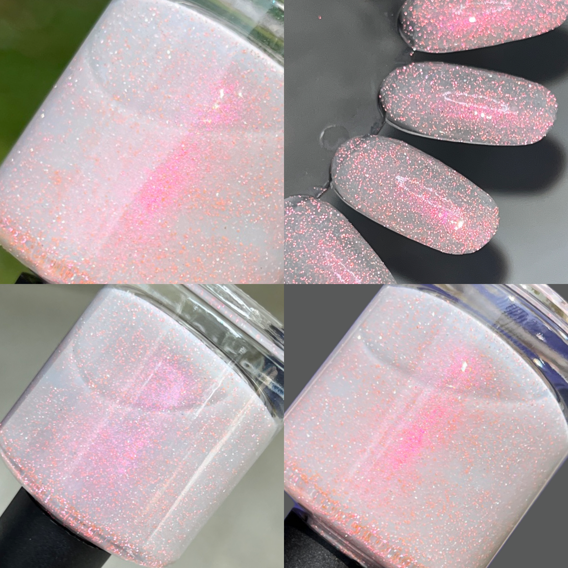 a sheer, tinted base with aurora shimmer and peachy reflective glitter and glow in the dark pigment