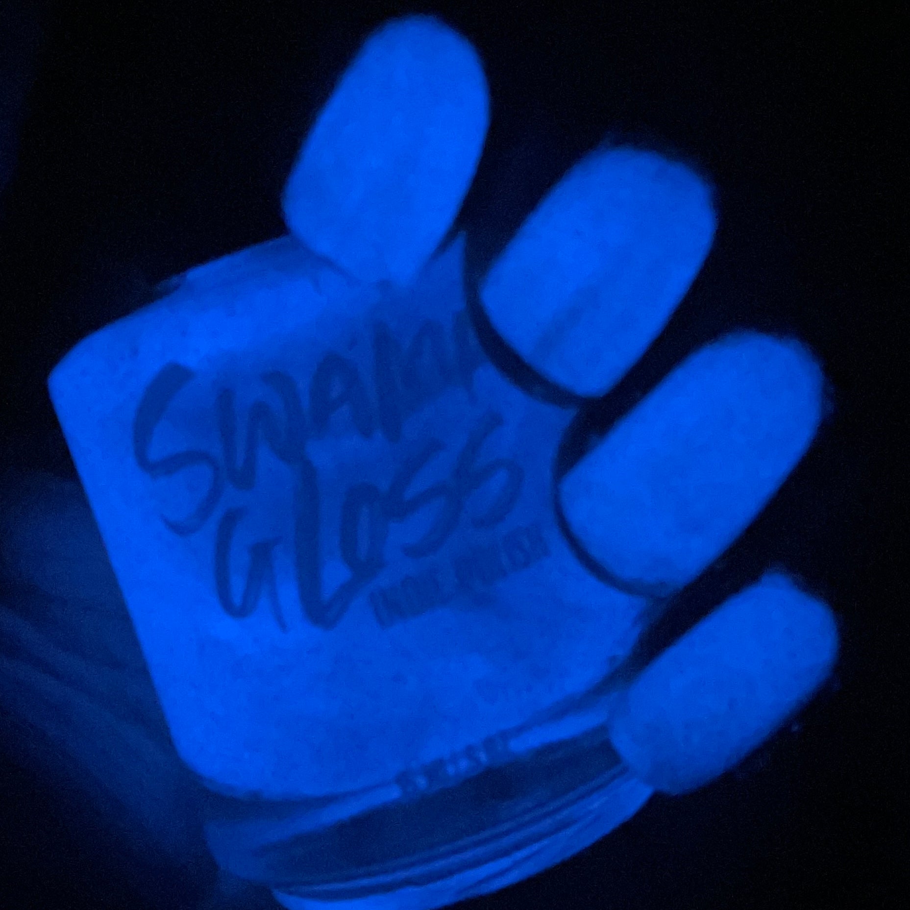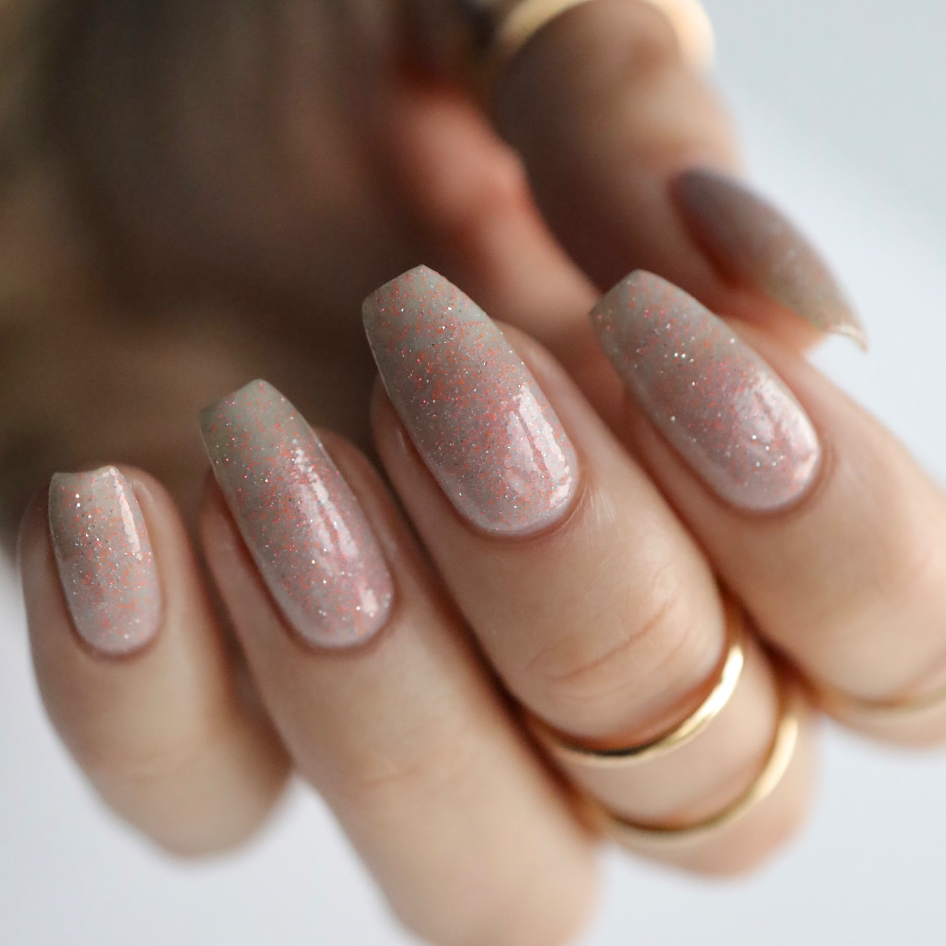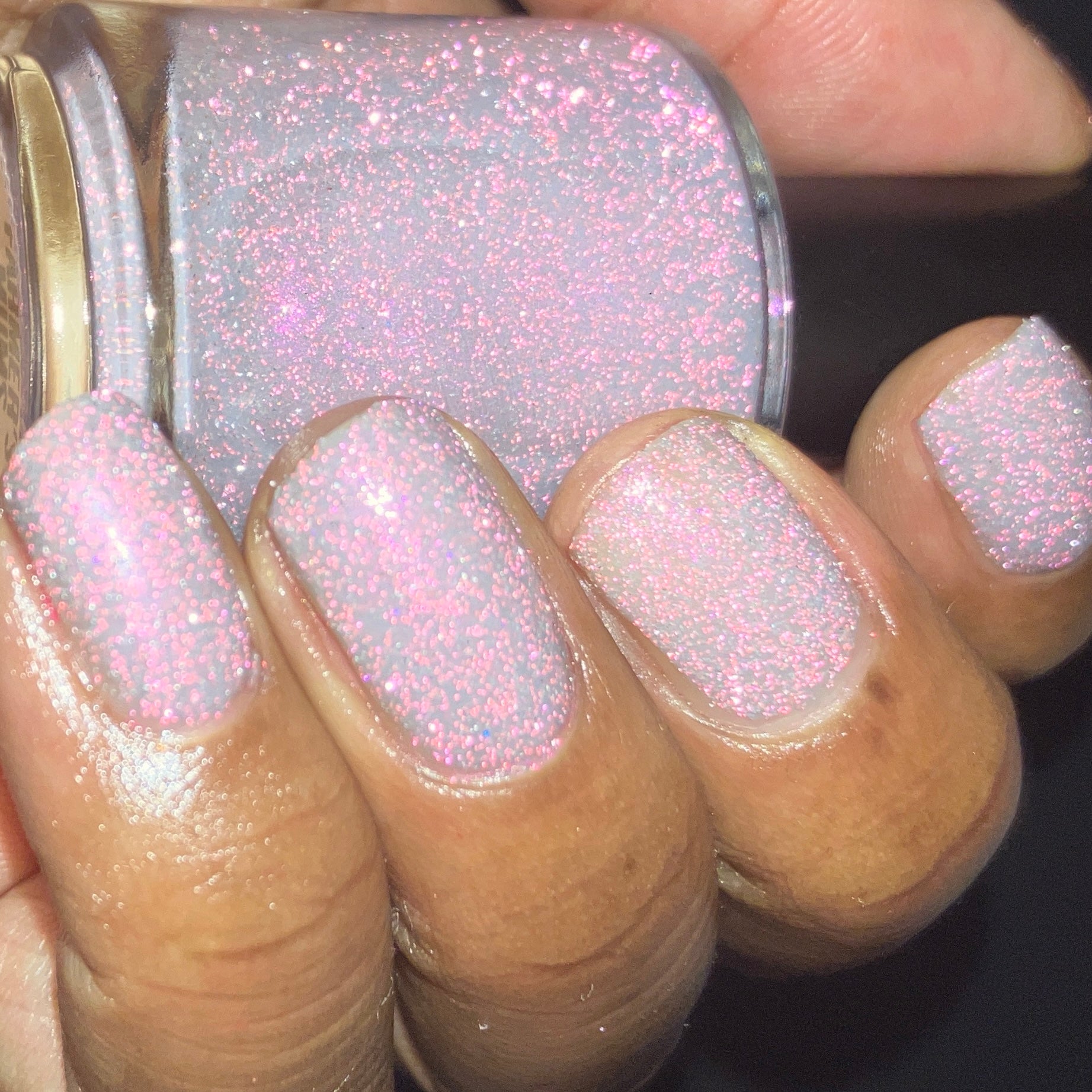 a sheer, tinted base with aurora shimmer and peachy reflective glitter and glow in the dark pigment