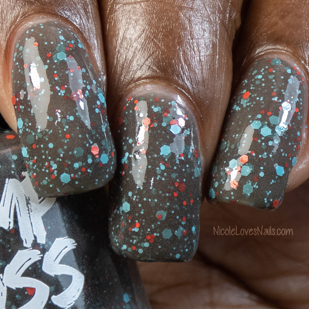 Ingredients: Nitrocelluose, Ethyl Acetate, Butyl Acetate, Isopropyl Alcohol, Ethyl Alcohol, Triphenyl Phosphate, and can contain: Aluminum Powder, Mica, Iron Oxide, Ferric Ferrocyanide, Ultramarines, Red 6, Red 22, Red 30, Red 28, Red 34 , Red 7, Orange 5, Yellow 5, Yellow 11, Yellow 6, Yellow 10, Blue 1, Black 2, Violet 2 Ext , Titanium Dioxide, Synthetic Fluorophylogopite, Calcium Sodium Borosilicate, Polyethylene Terephthalate, Polyurethane 33, Silver, Chromium, Magnesium Fluoride, Bismuth Oxychloride
