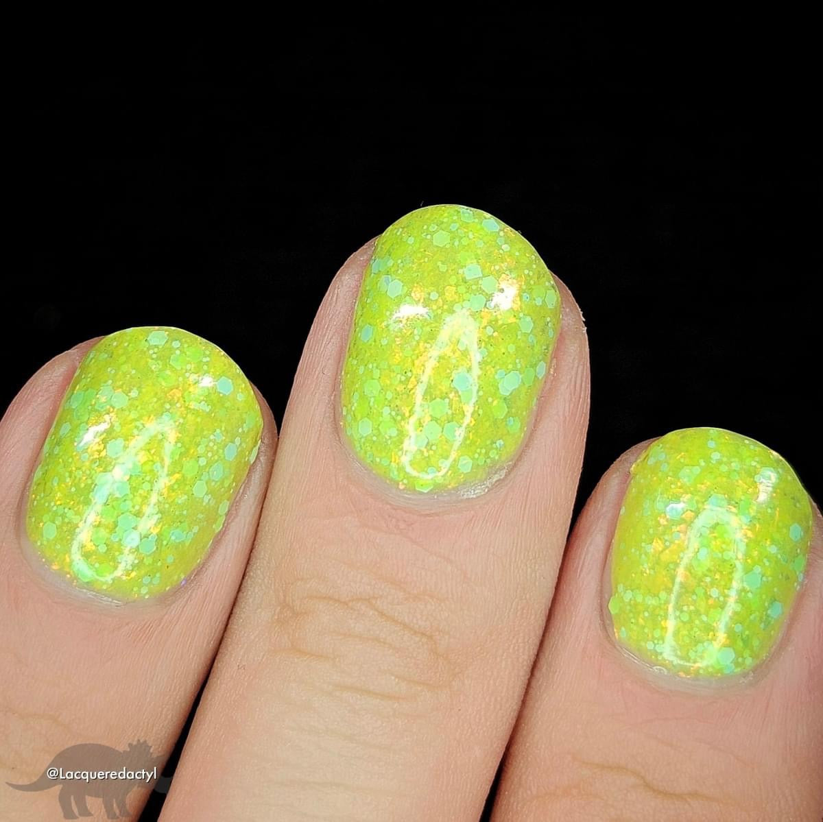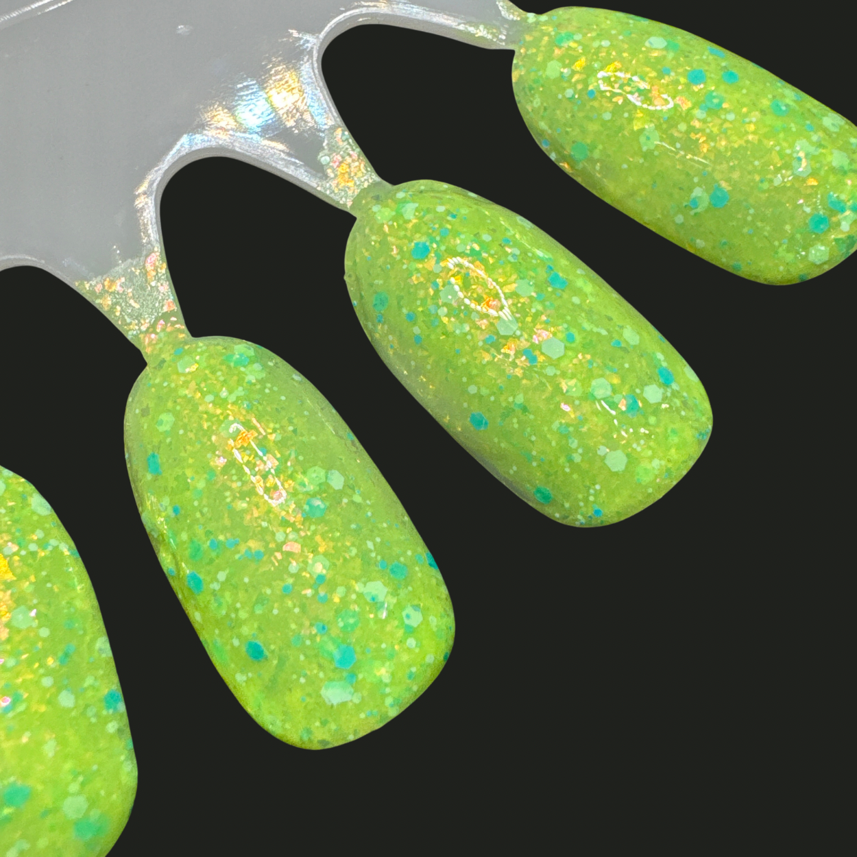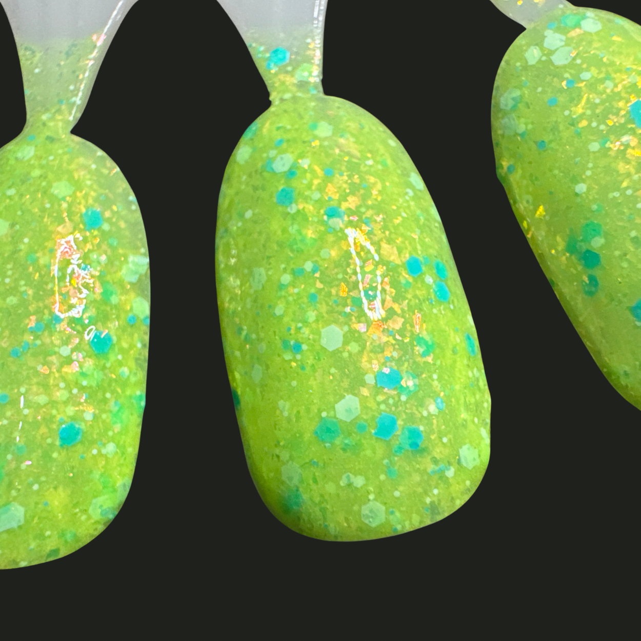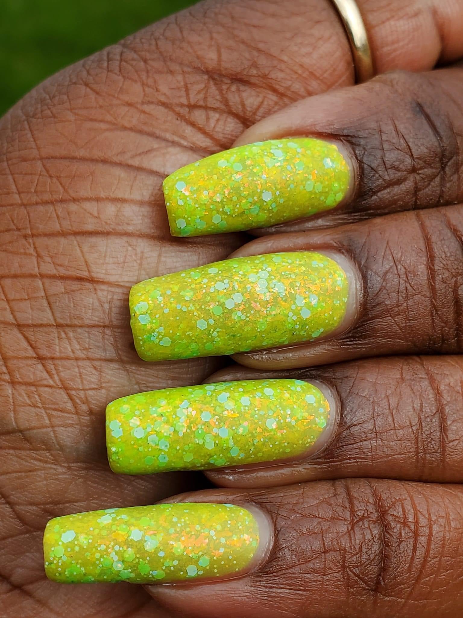 A very much lightened neon yellow with matte hexes and iridescent shifting flakes and glow pigment