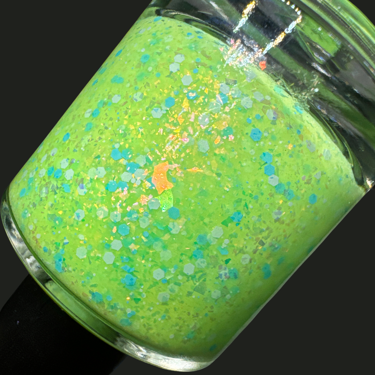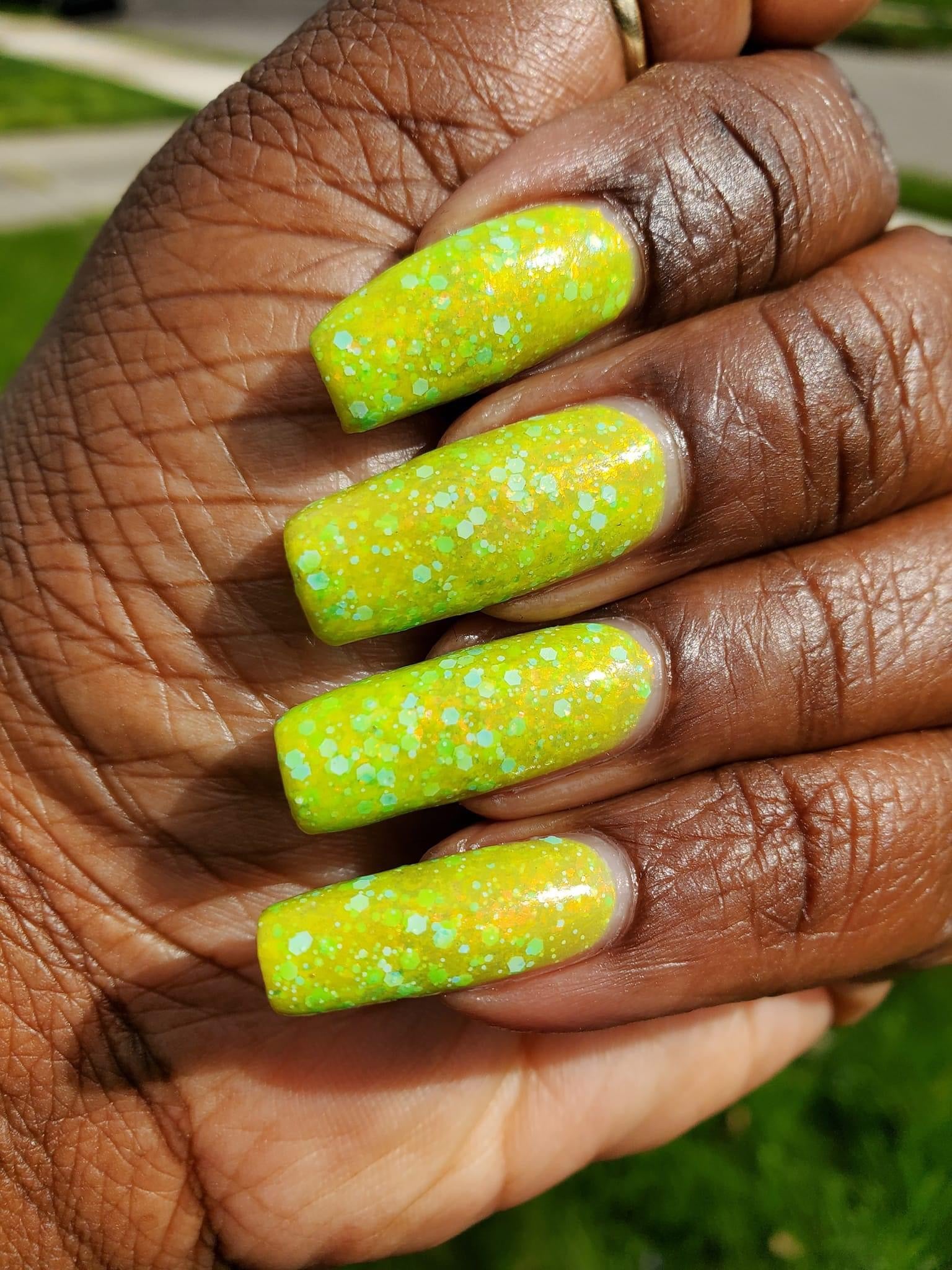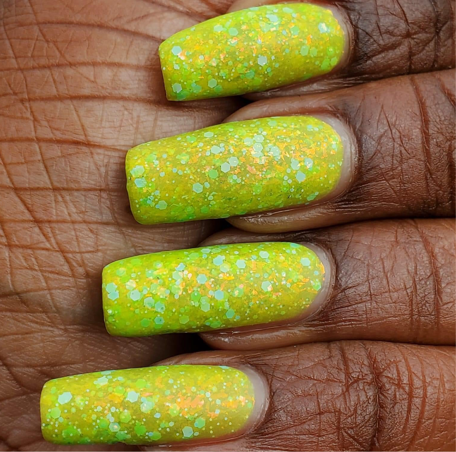 A very much lightened neon yellow with matte hexes and iridescent shifting flakes and glow pigment