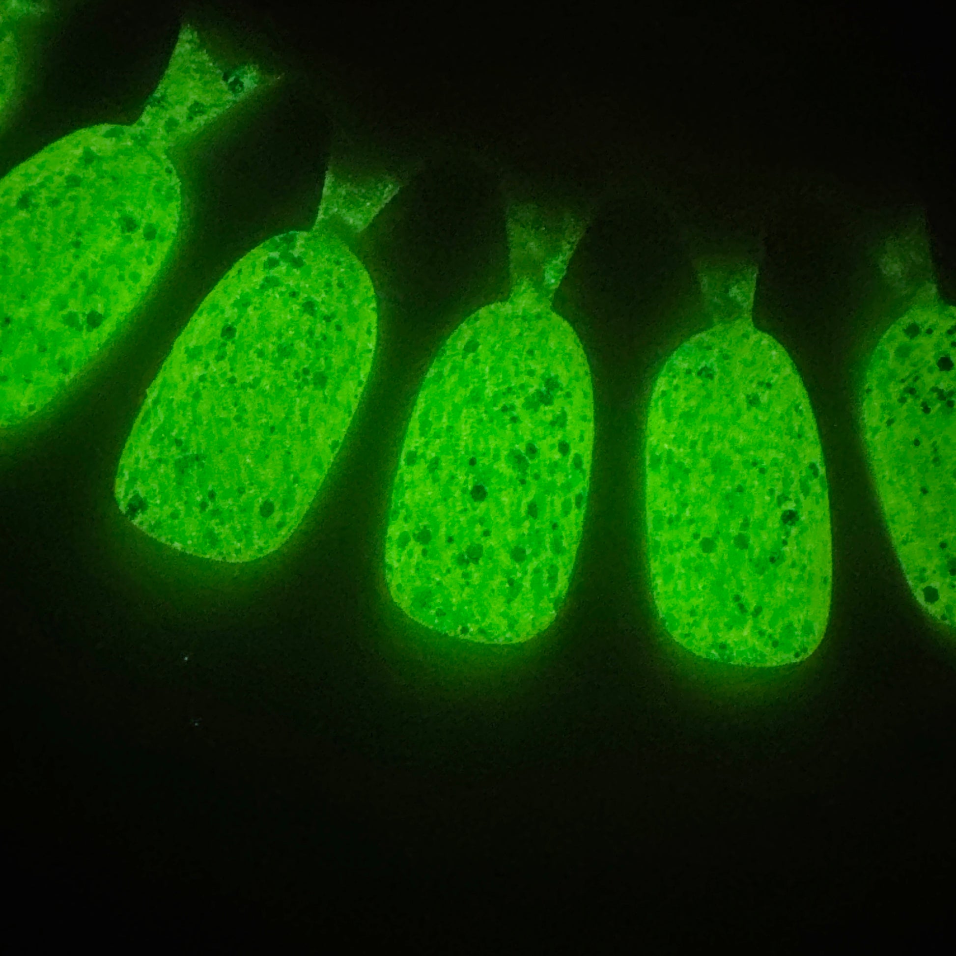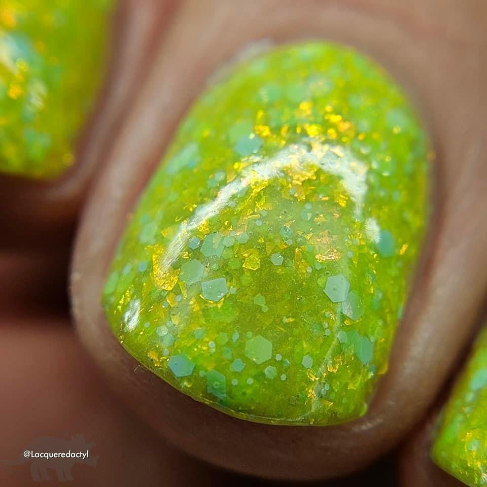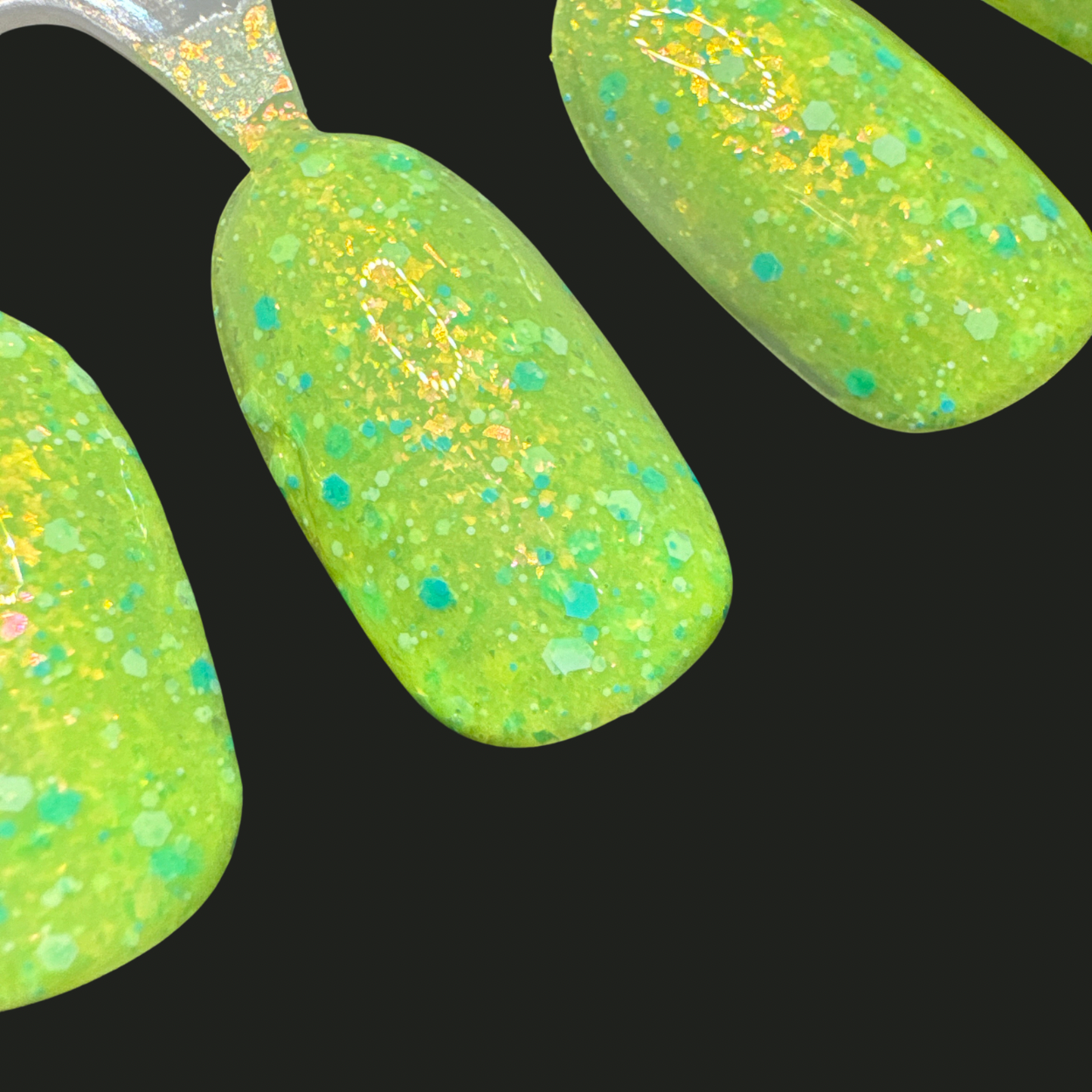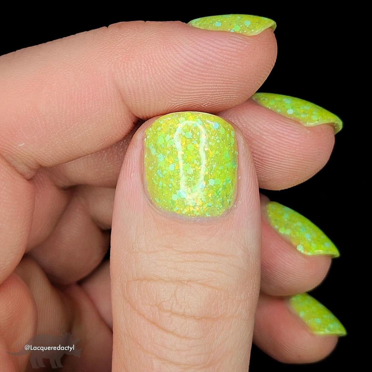 A very much lightened neon yellow with matte hexes and iridescent shifting flakes and glow pigment