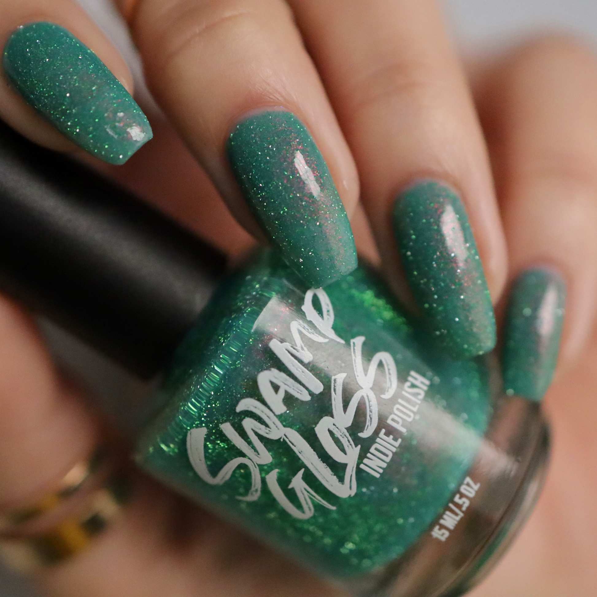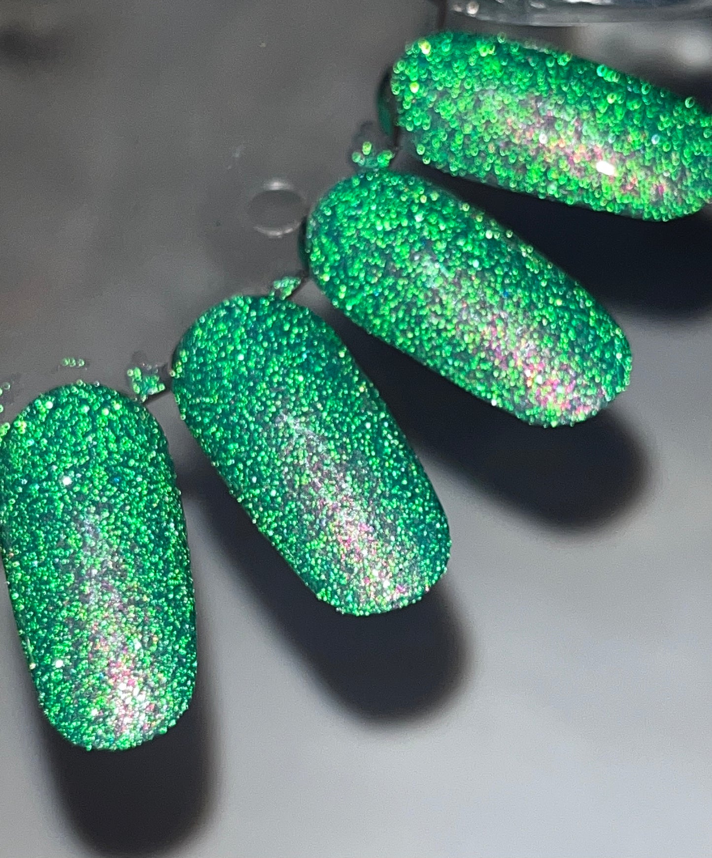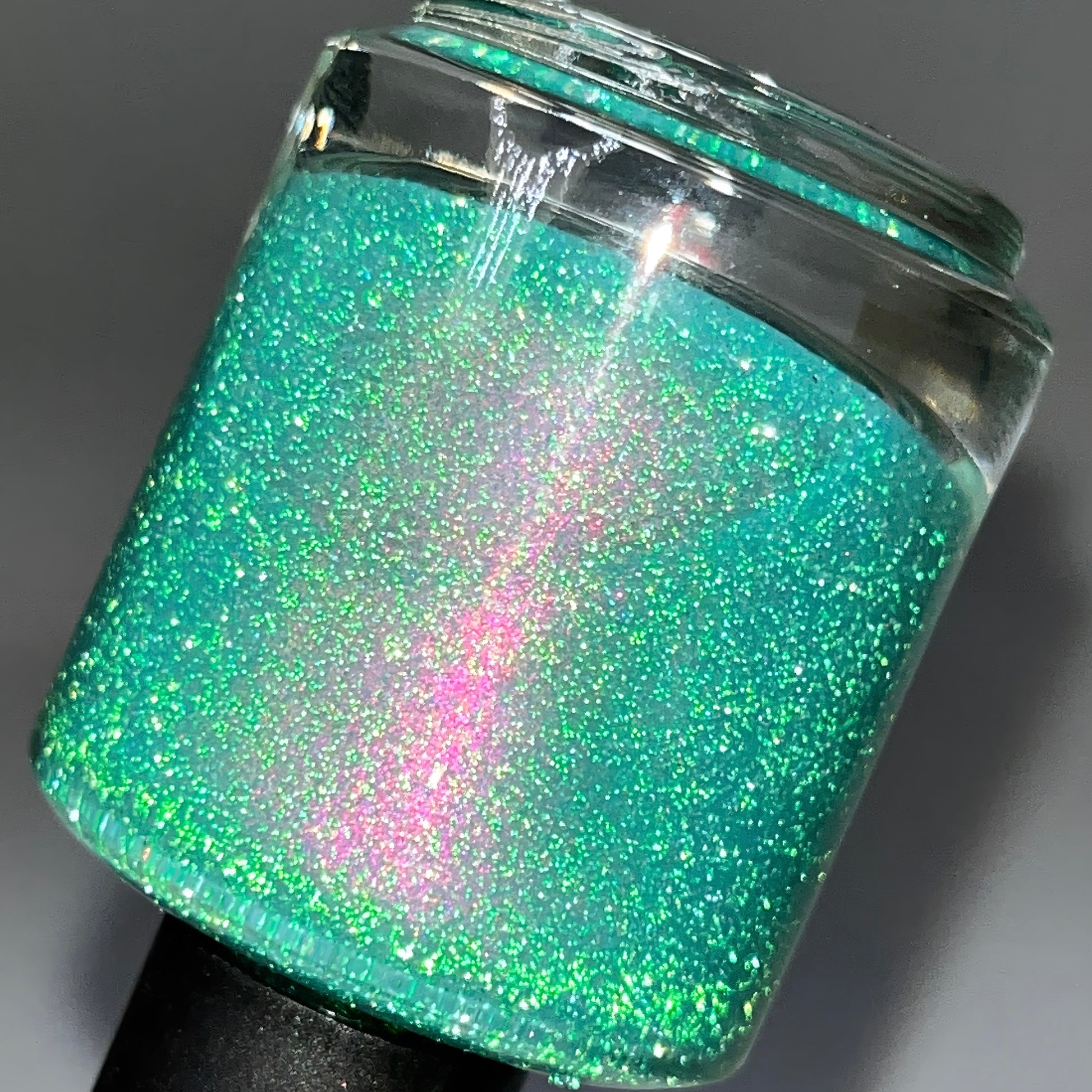 A lightened turquoise base, packed with aurora shimmer and bright green reflective glitter