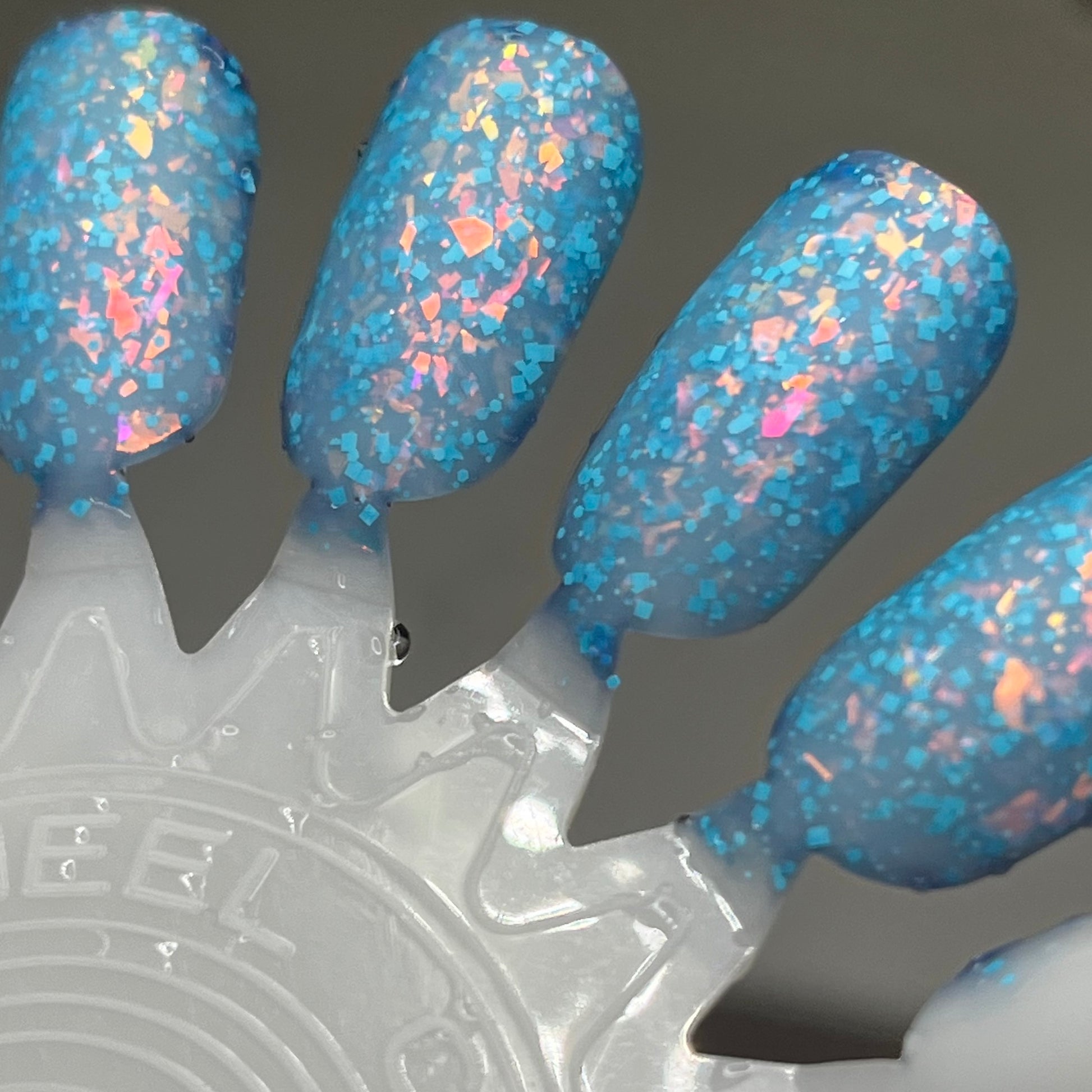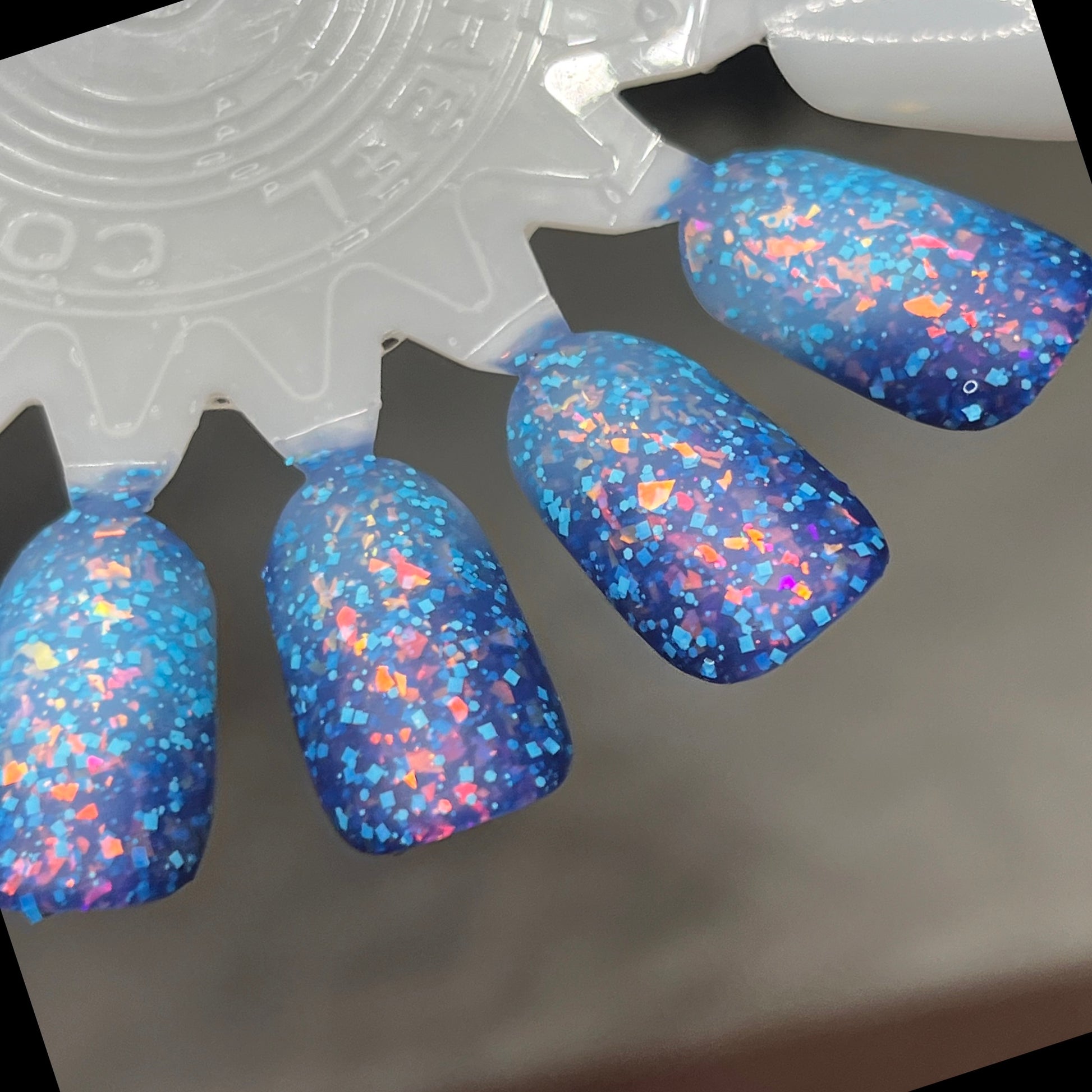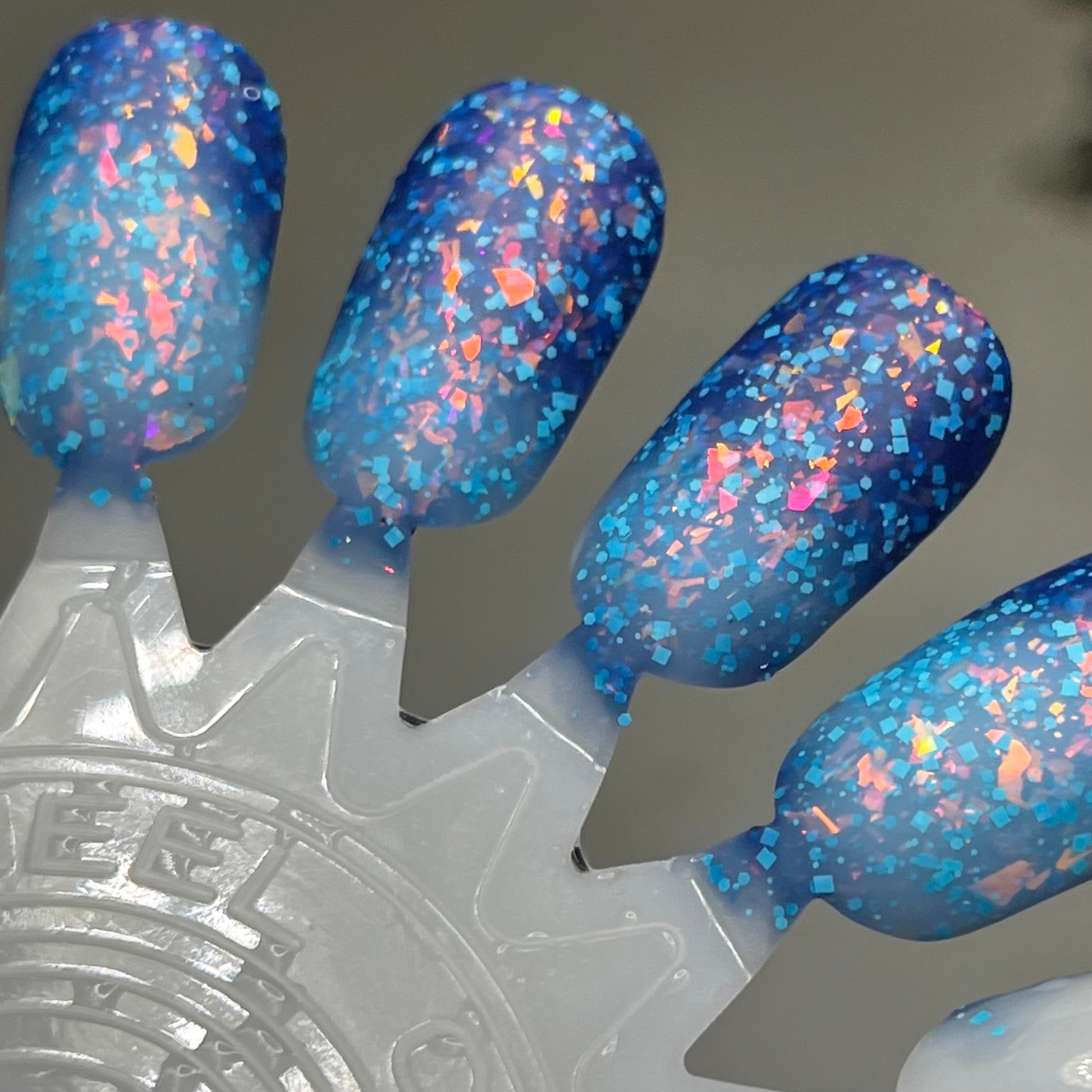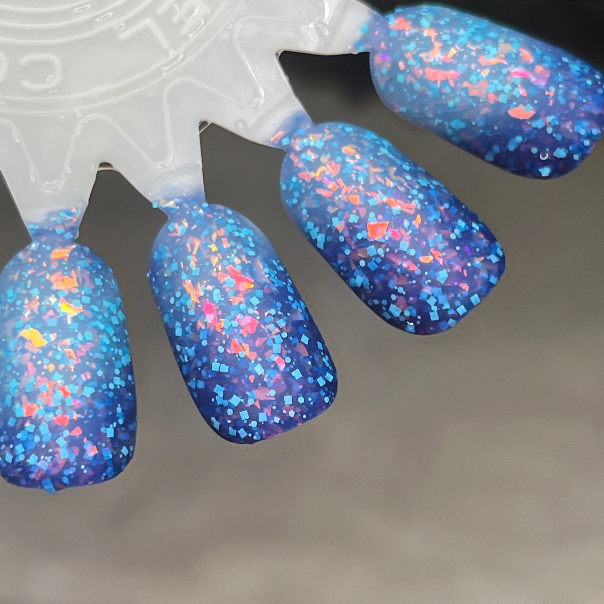 How can these legendary hands help you - a navy to sheer light blue thermal packed with red, pink, purple, orange iridescent flakes and matte hexes and squares