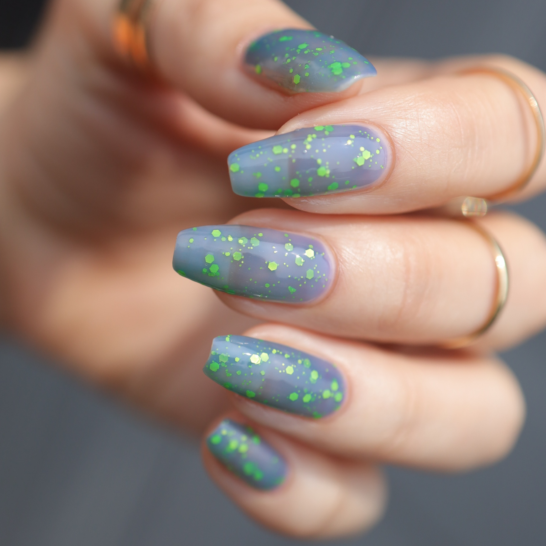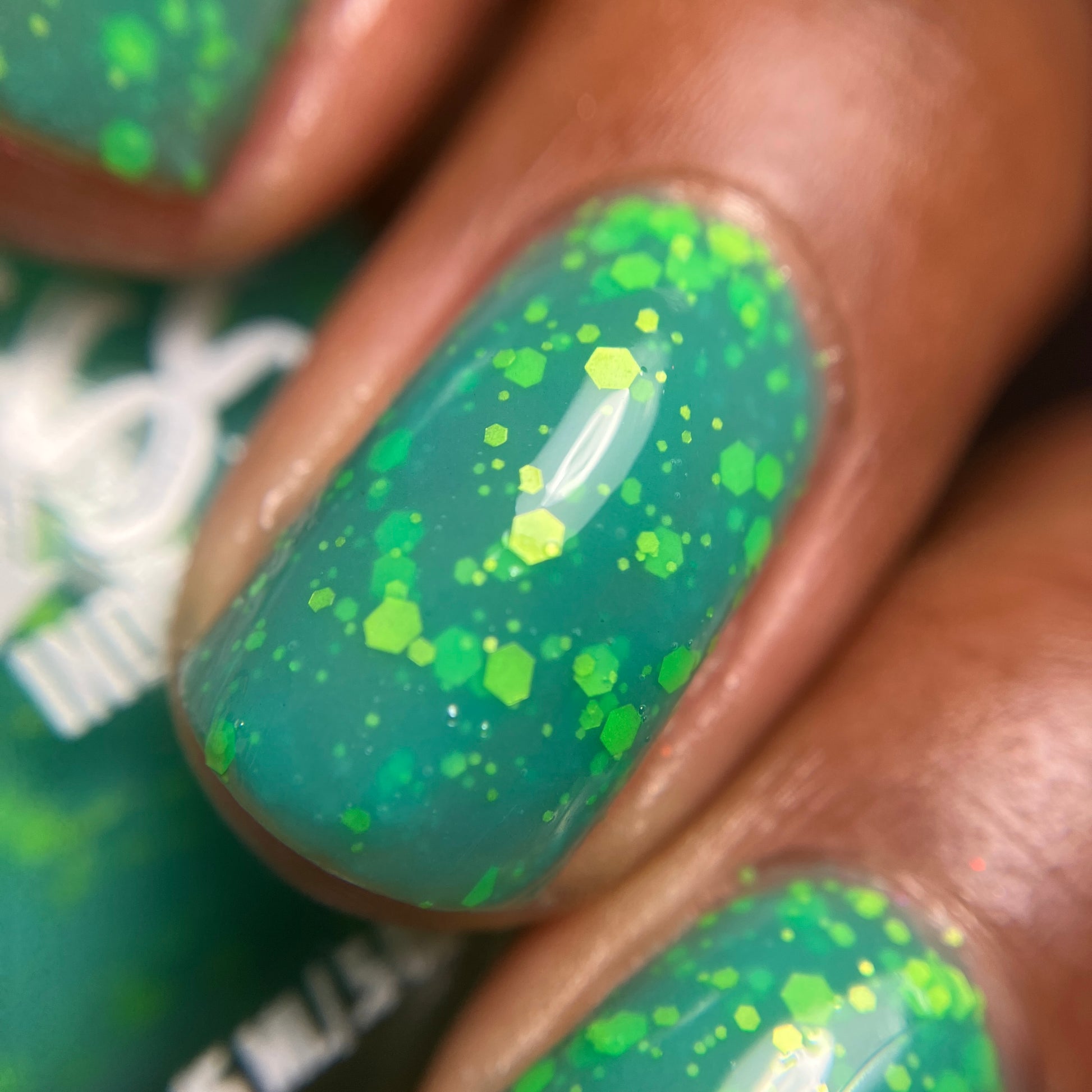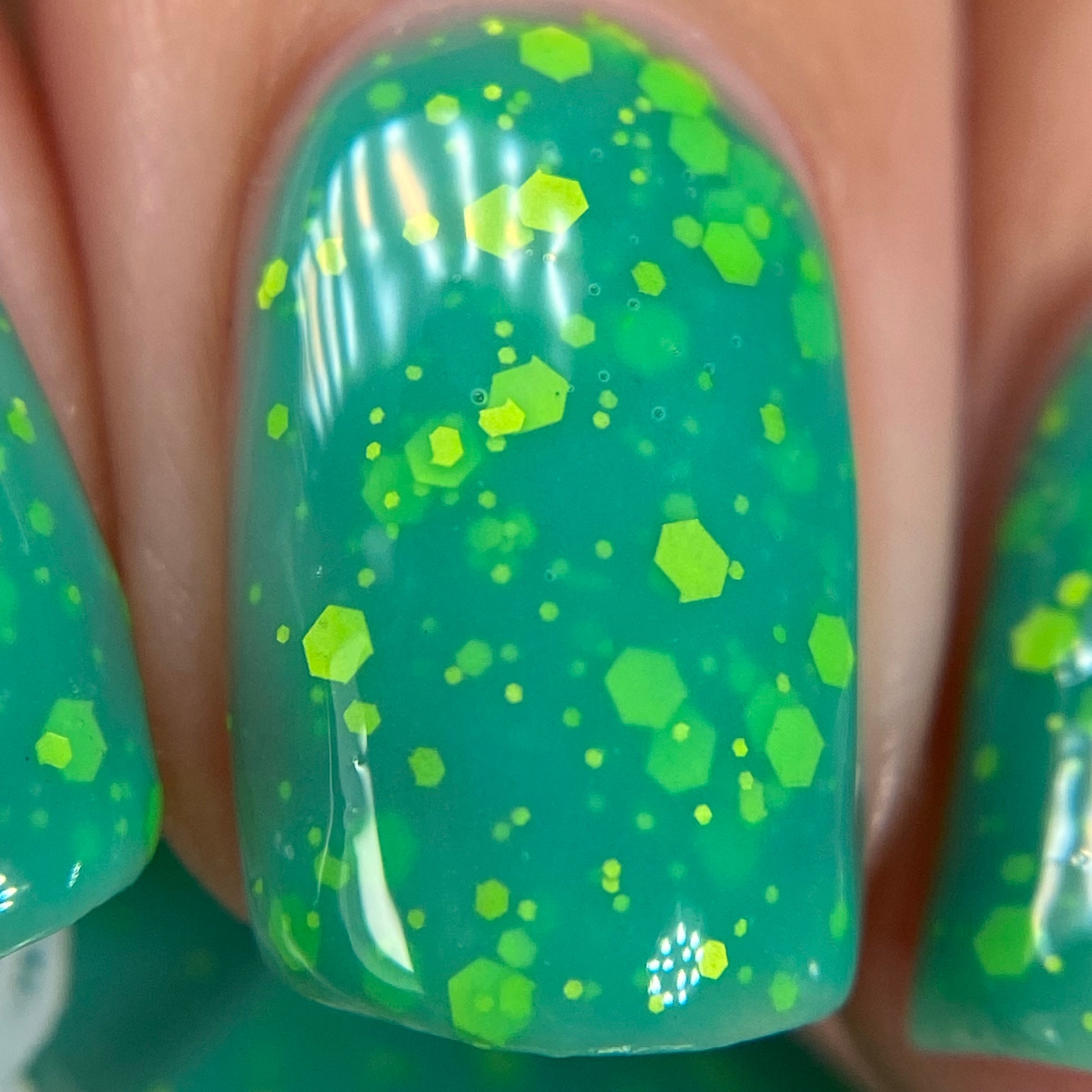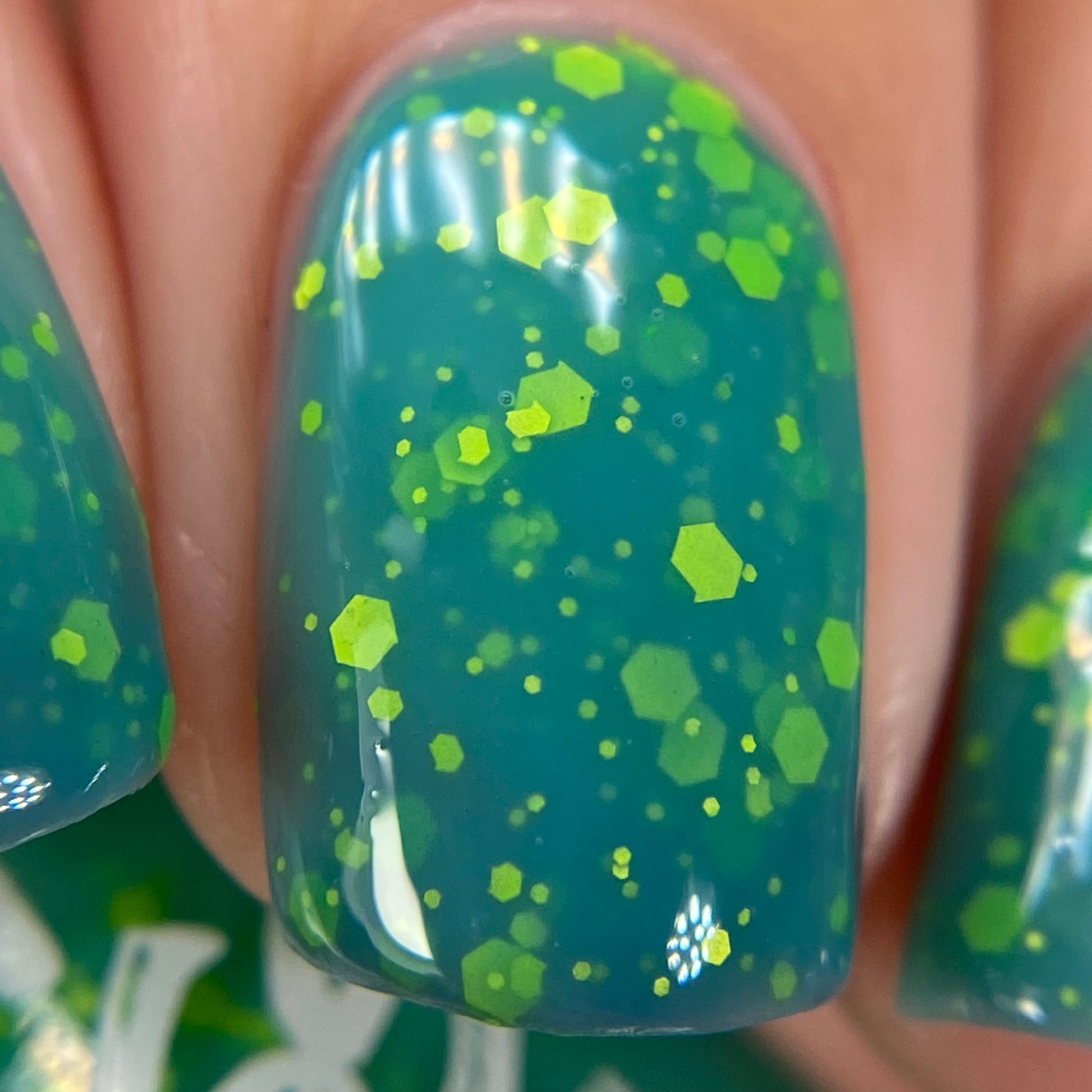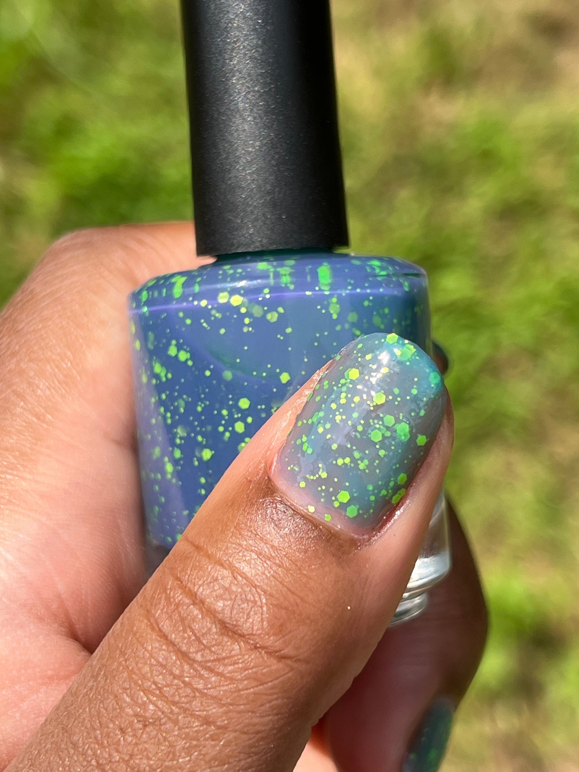 I’m not positive what my deal is - a light aqua to twilight blue solar polish with neon green hexes