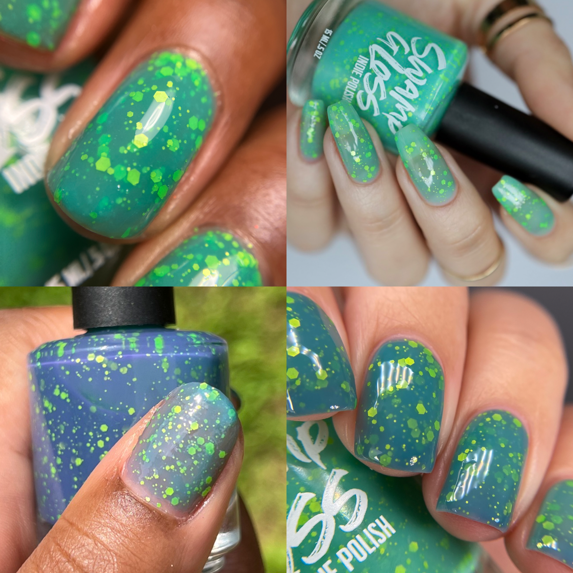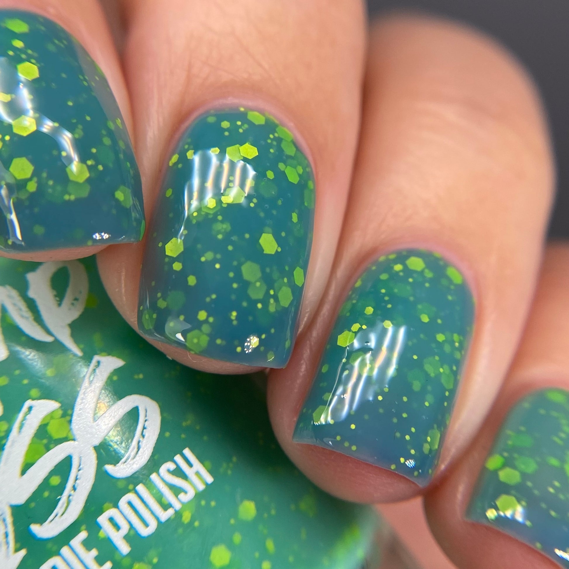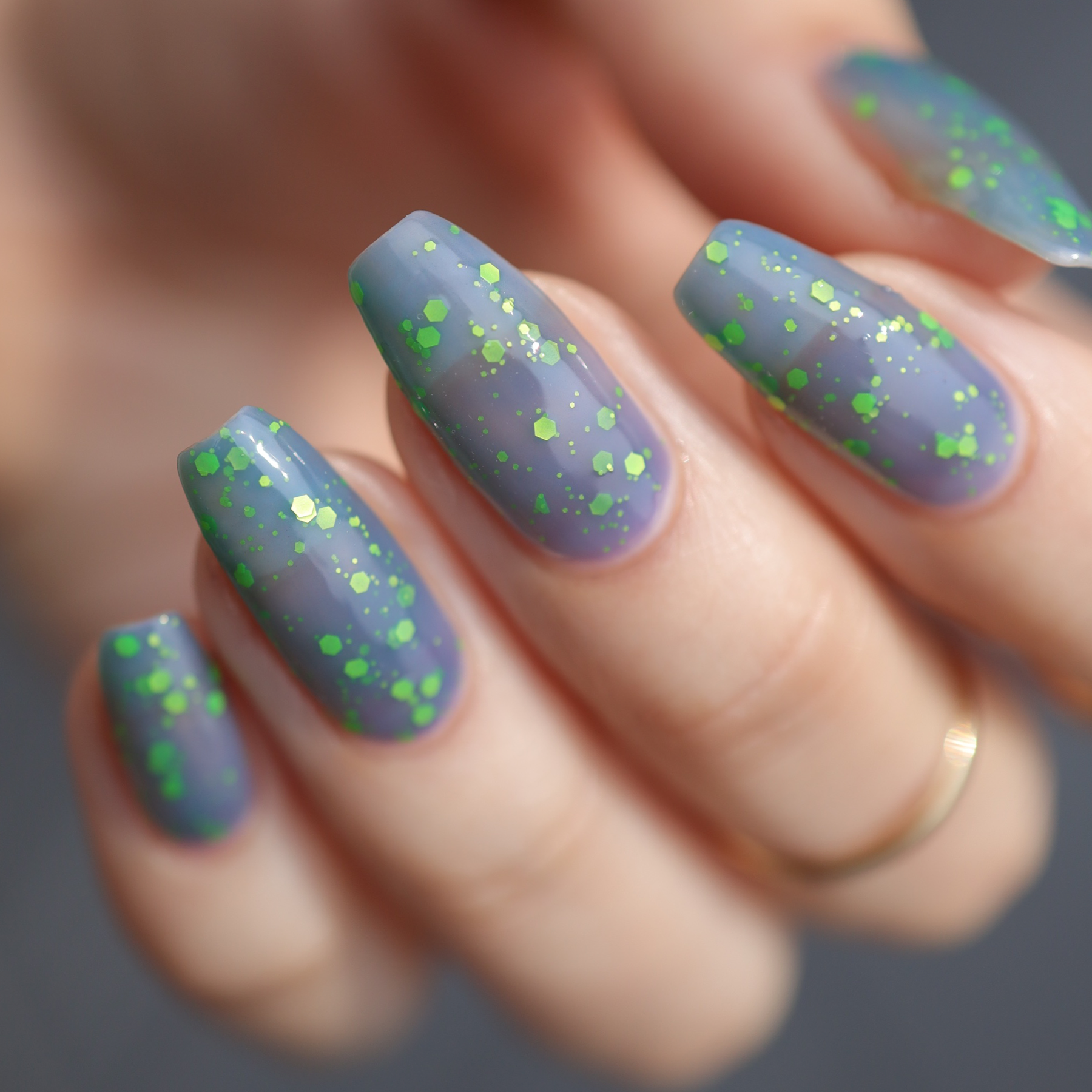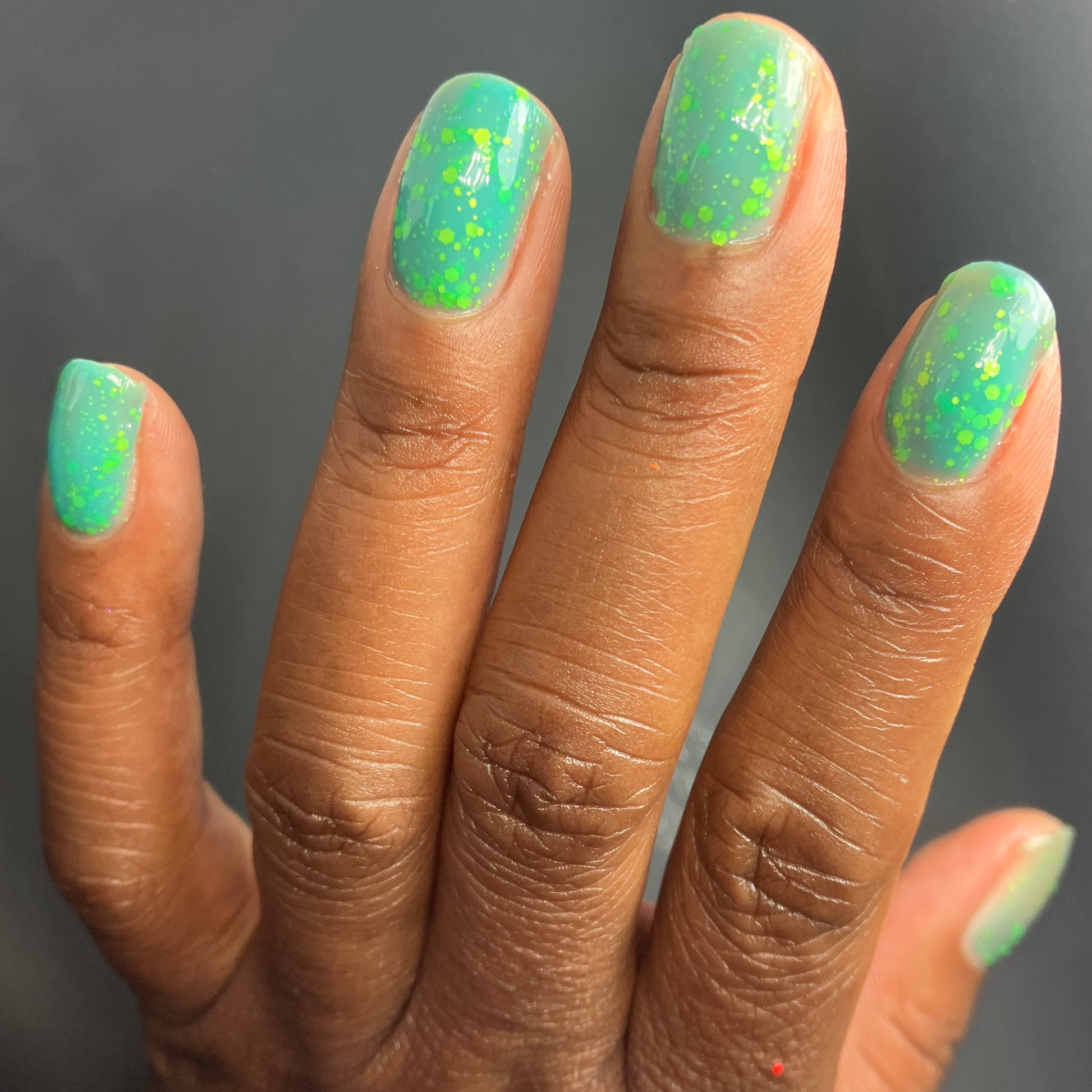 I’m not positive what my deal is - a light aqua to twilight blue solar polish with neon green hexes