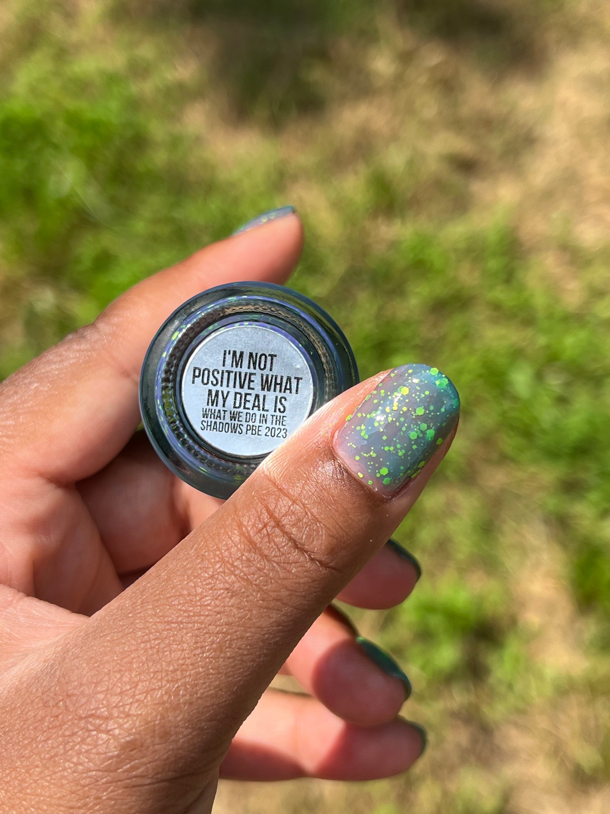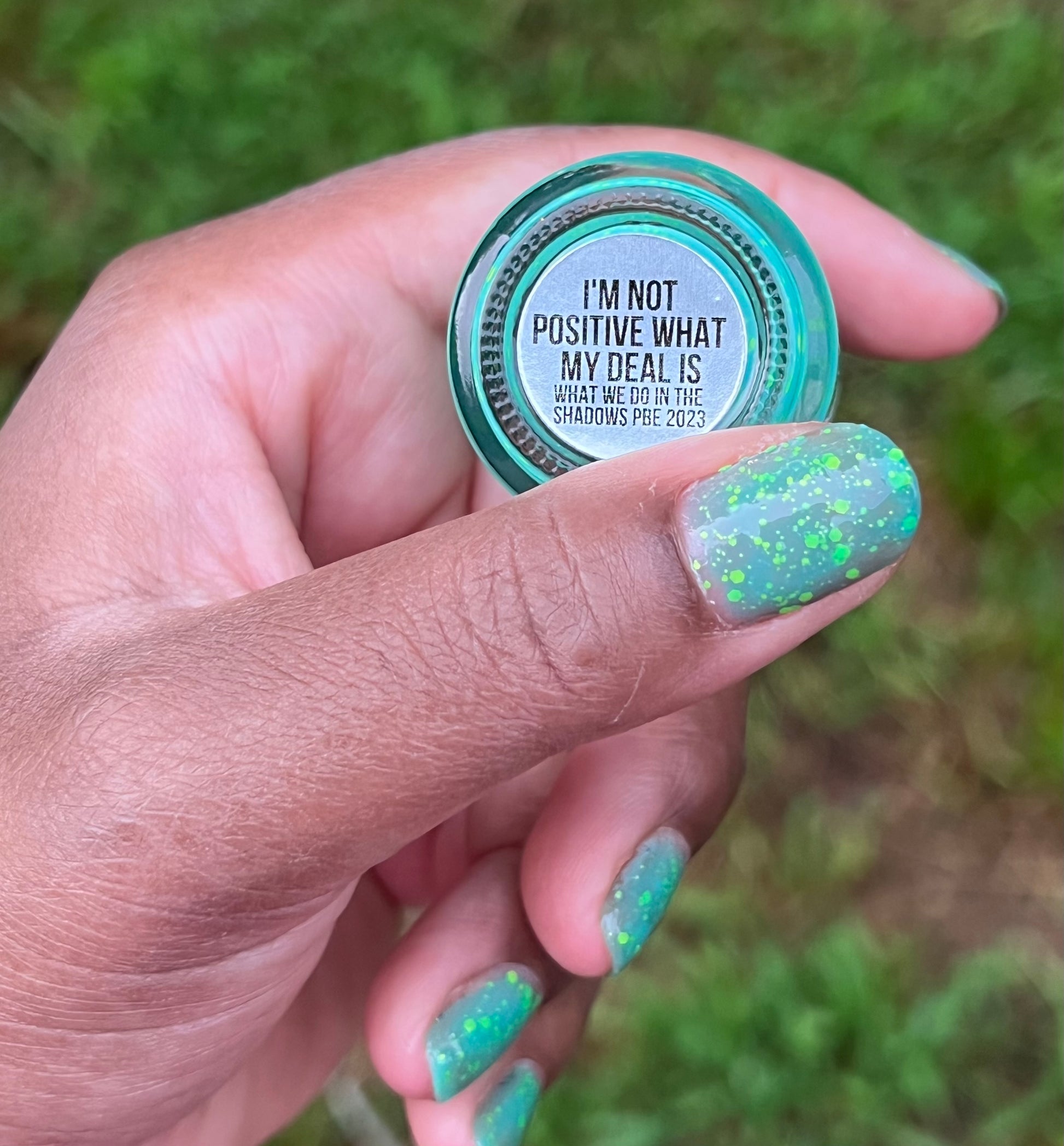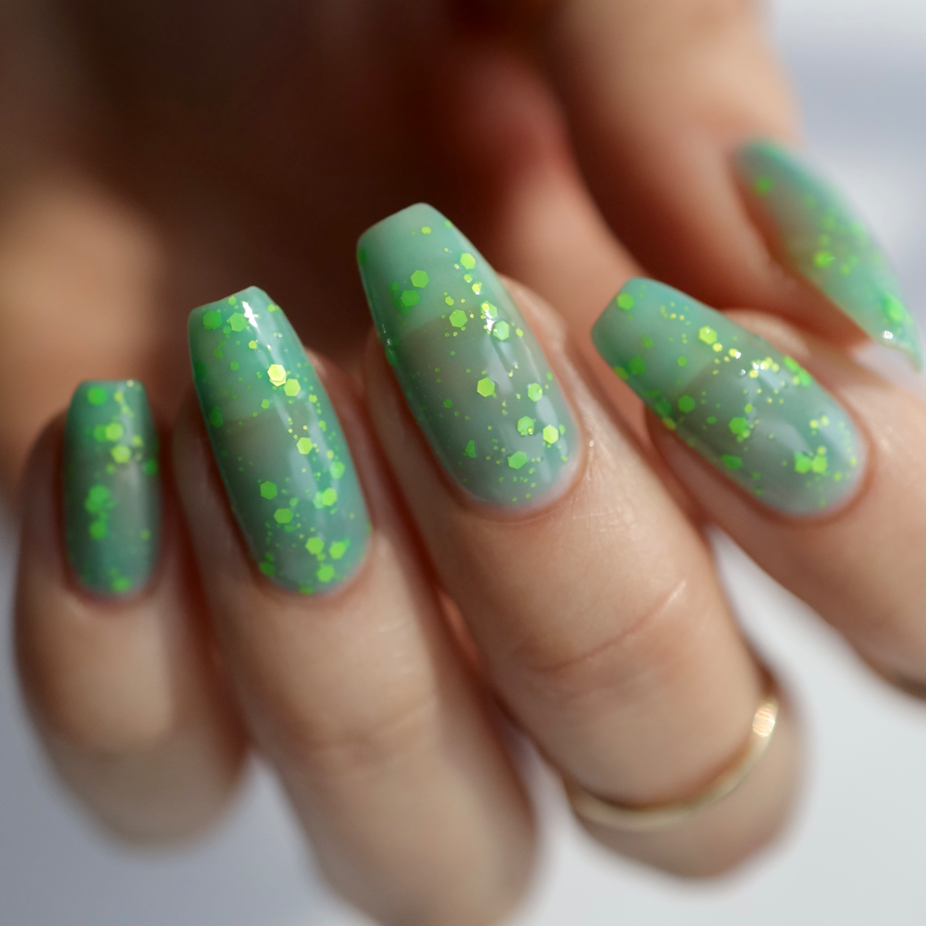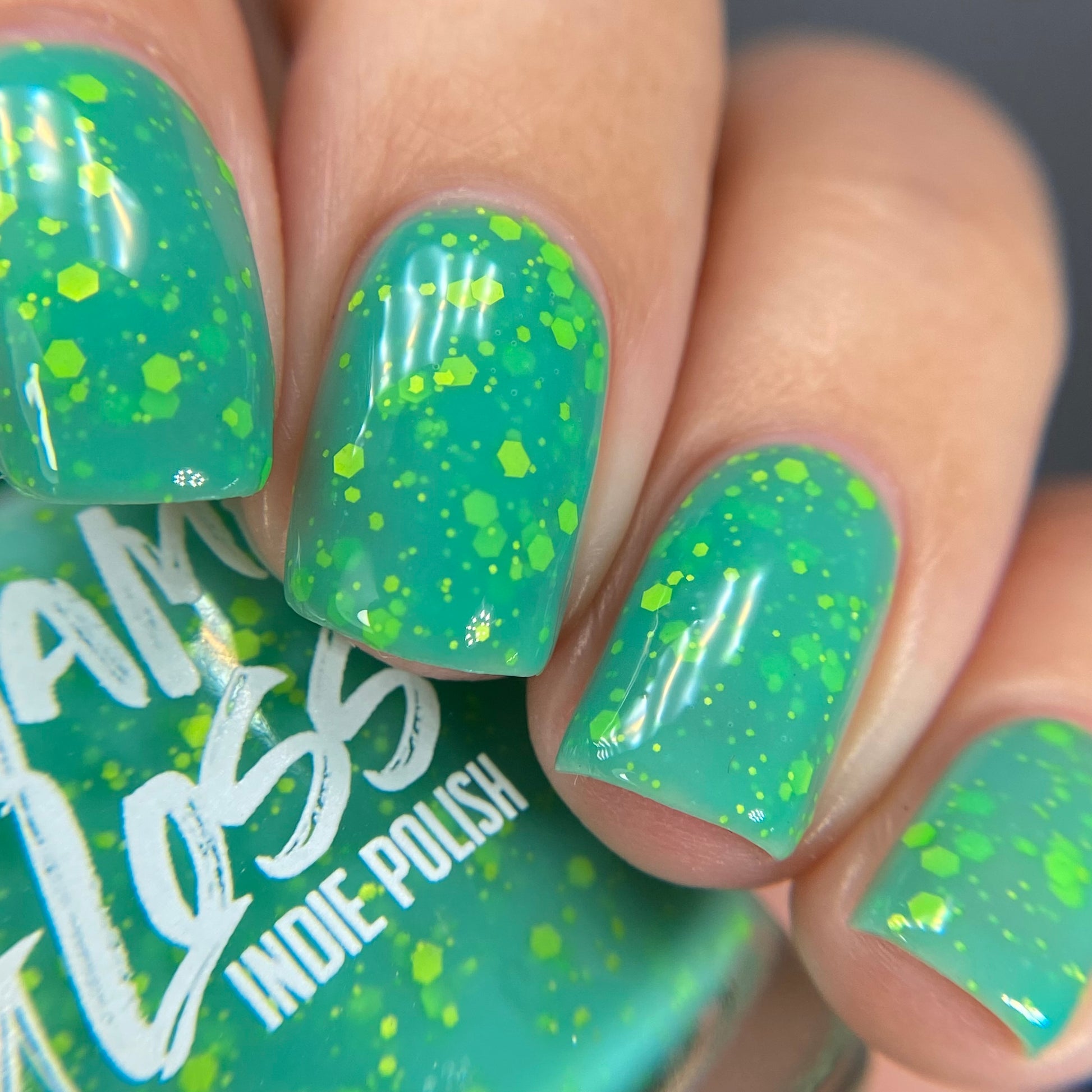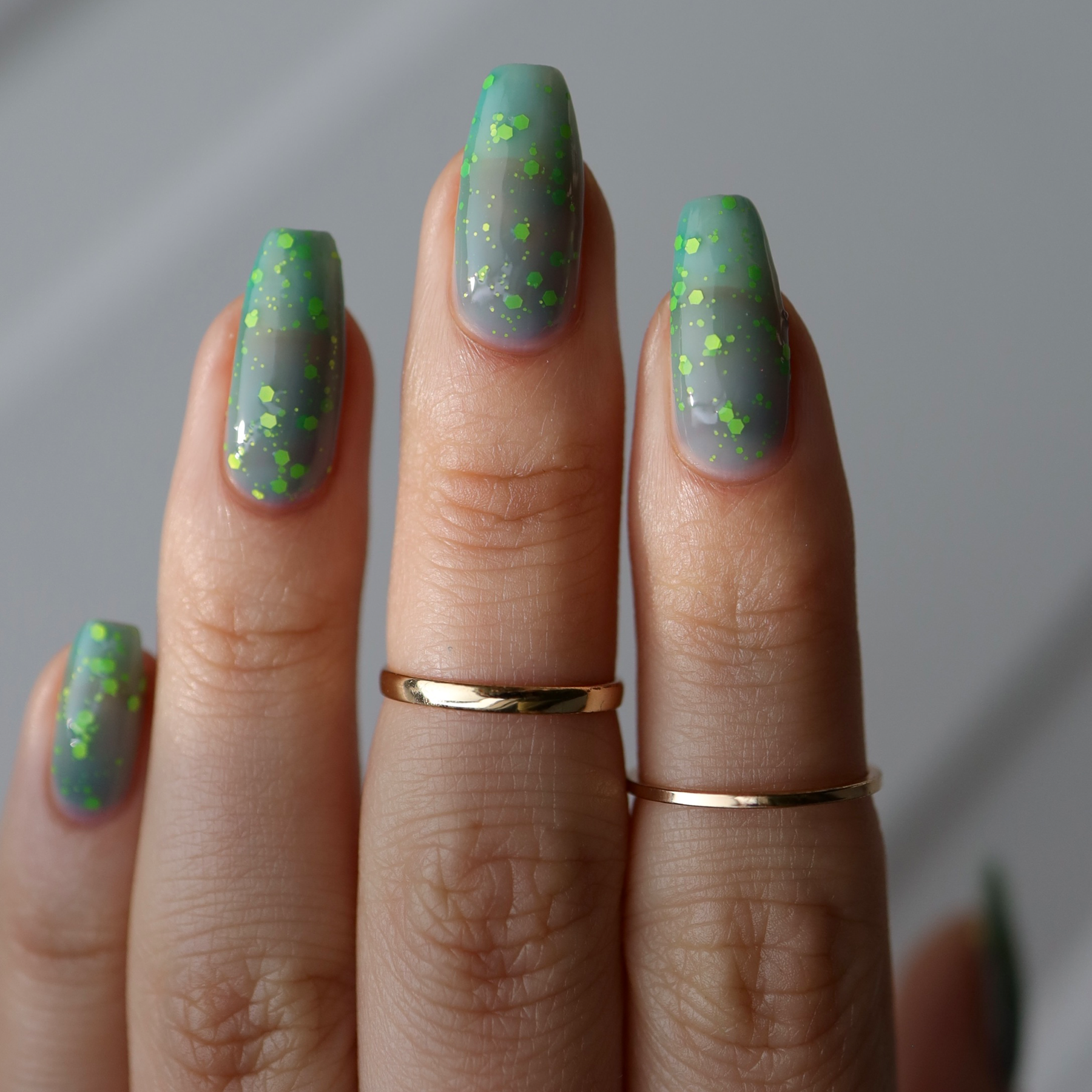 I’m not positive what my deal is - a light aqua to twilight blue solar polish with neon green hexes