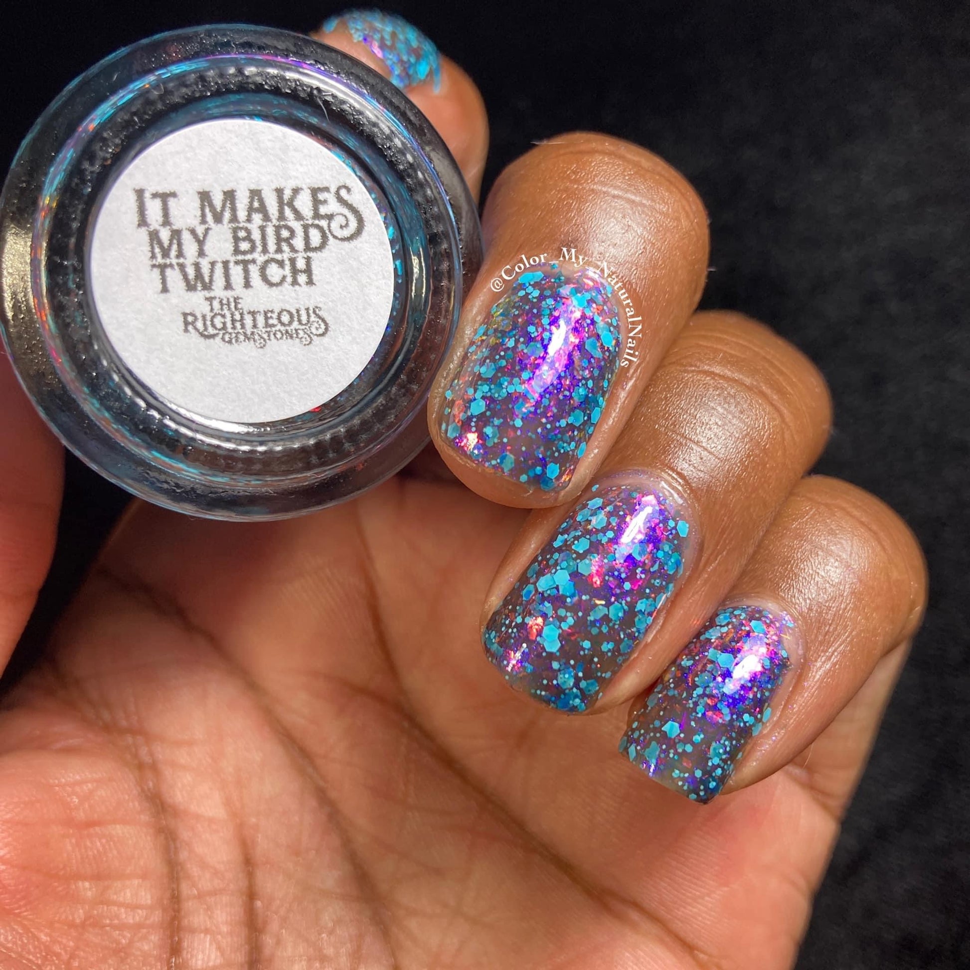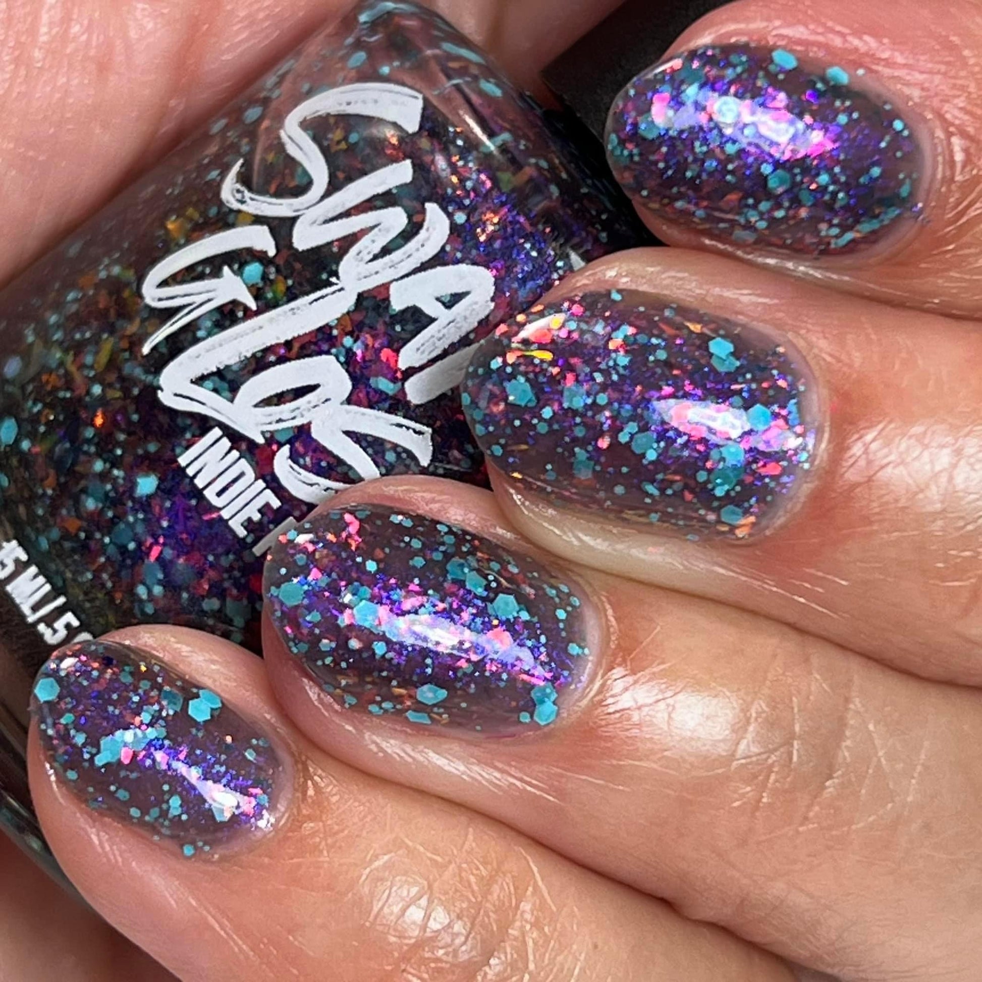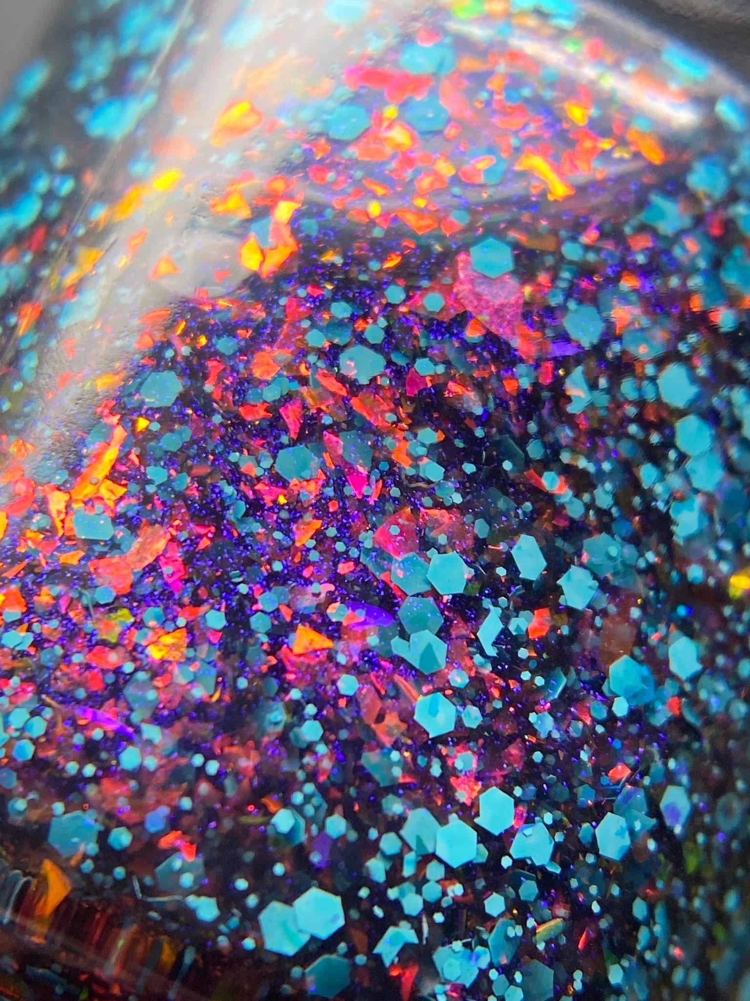 a large particle shifting shimmer in a deep violet jelly with aqua matte hexes and iridescent shifting flakes
