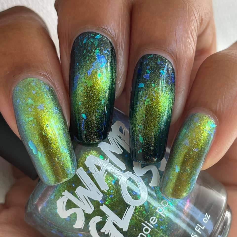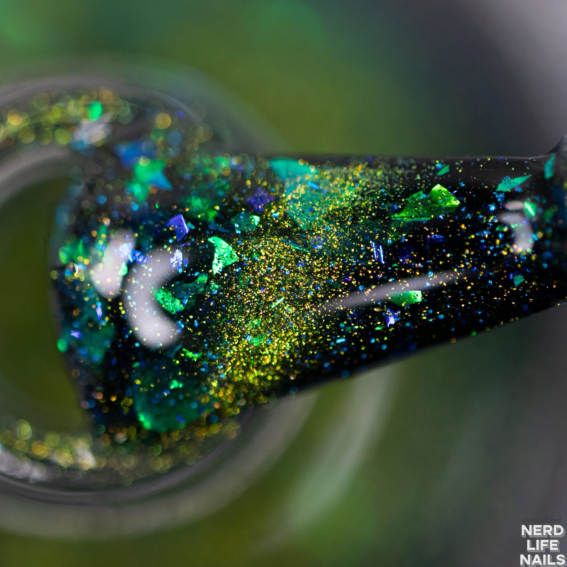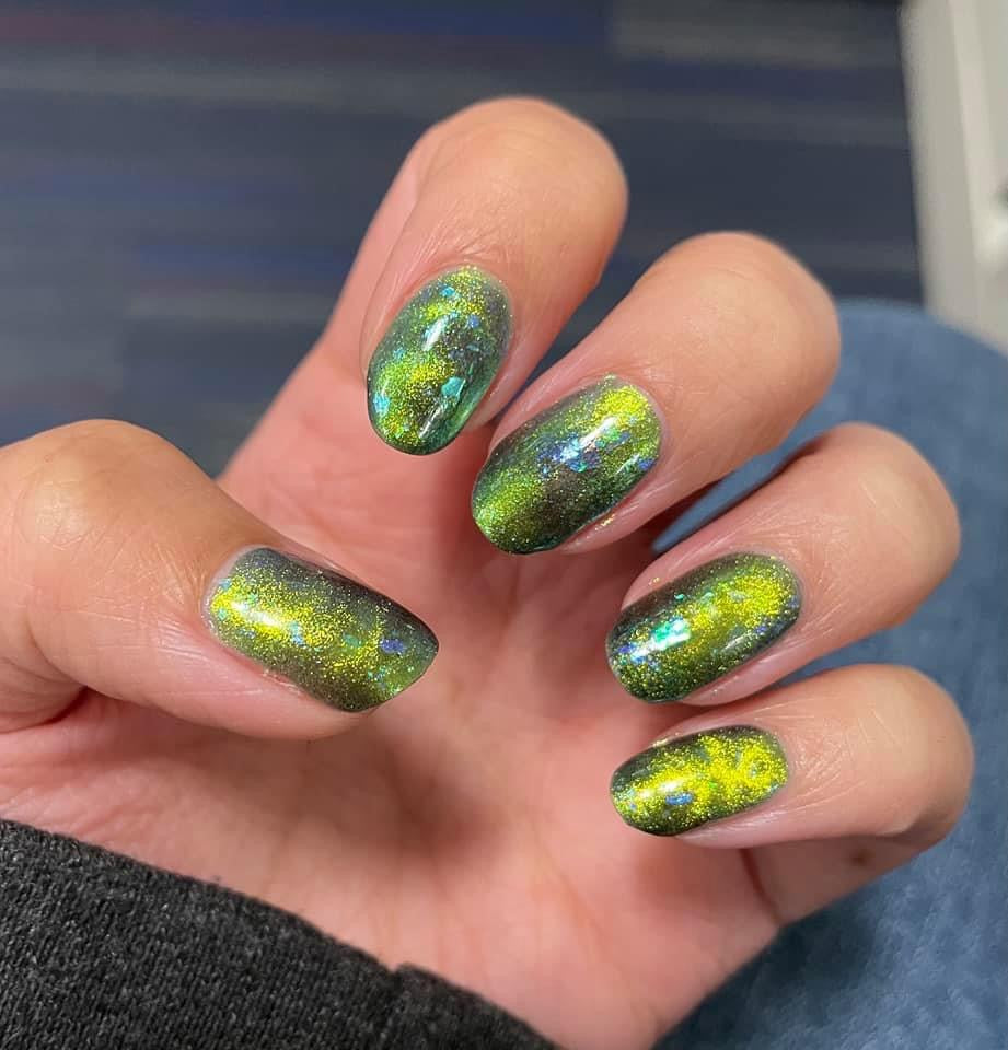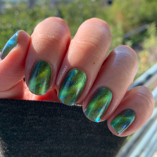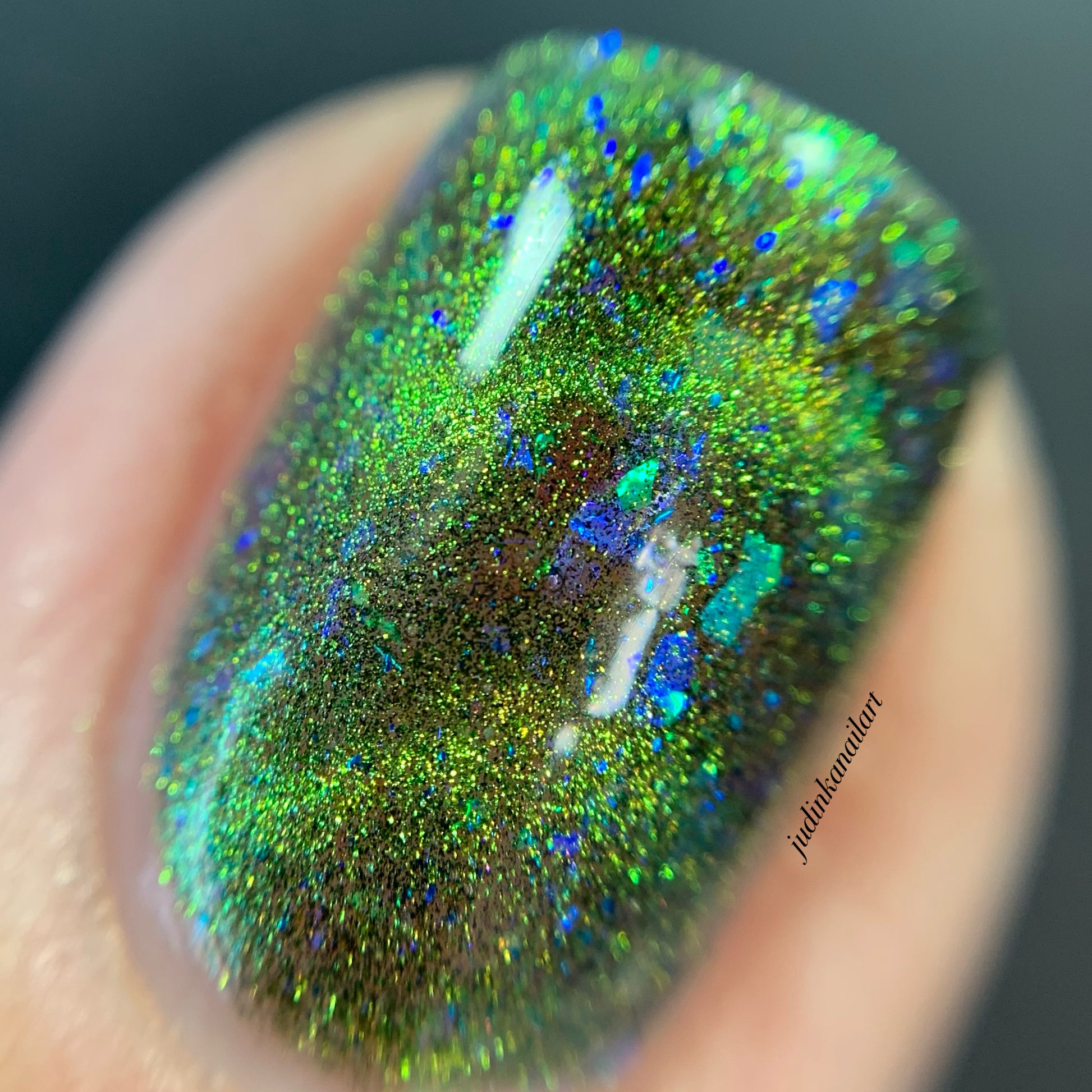 a multichrome magnetic, shifts of gold green, emerald and blue with metallic micro flakes and iridescent colorshifting flake