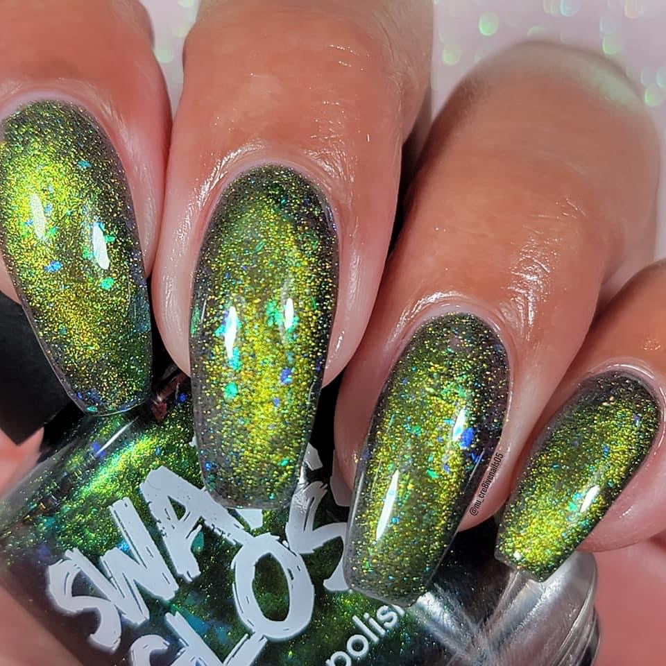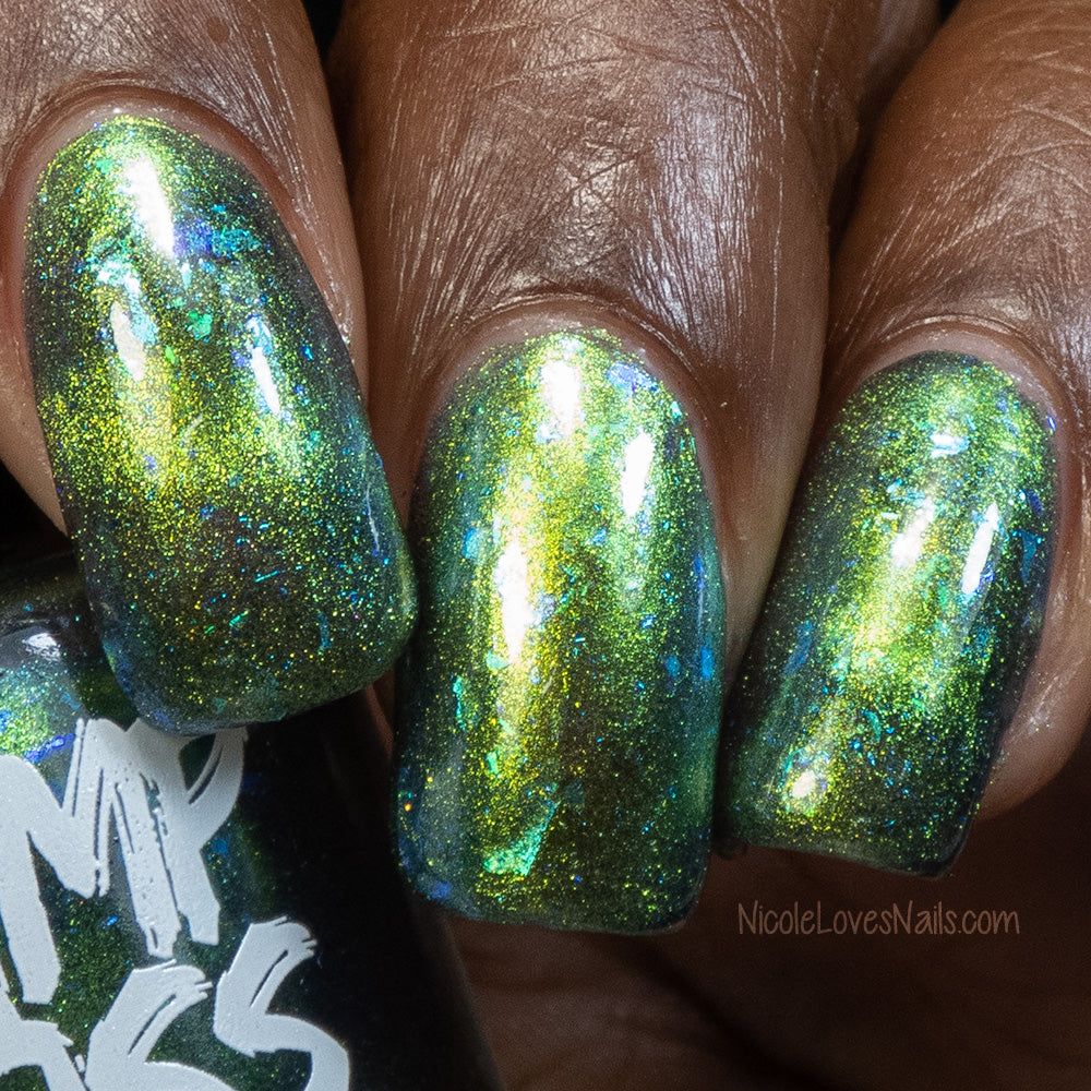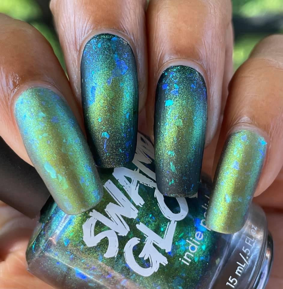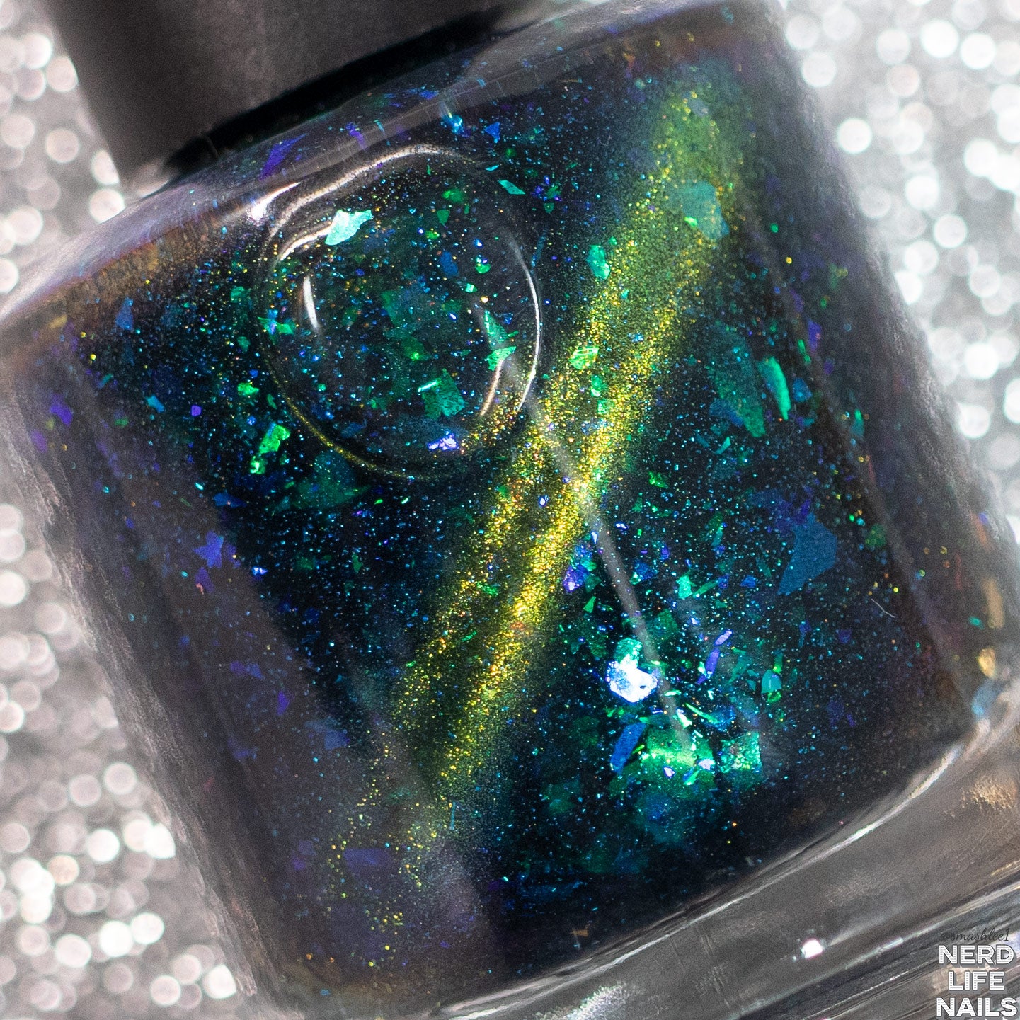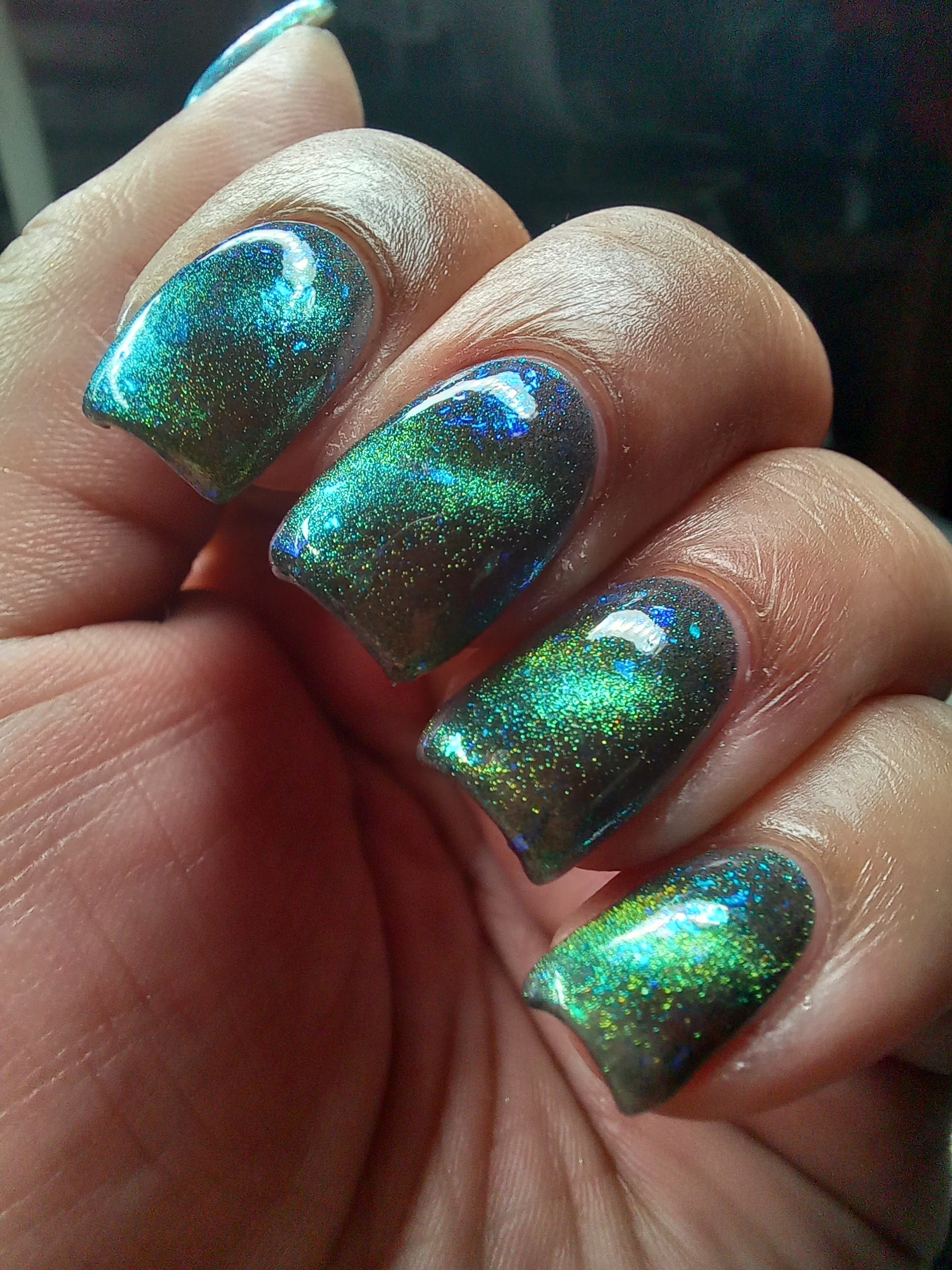 a multichrome magnetic, shifts of gold green, emerald and blue with metallic micro flakes and iridescent colorshifting flake