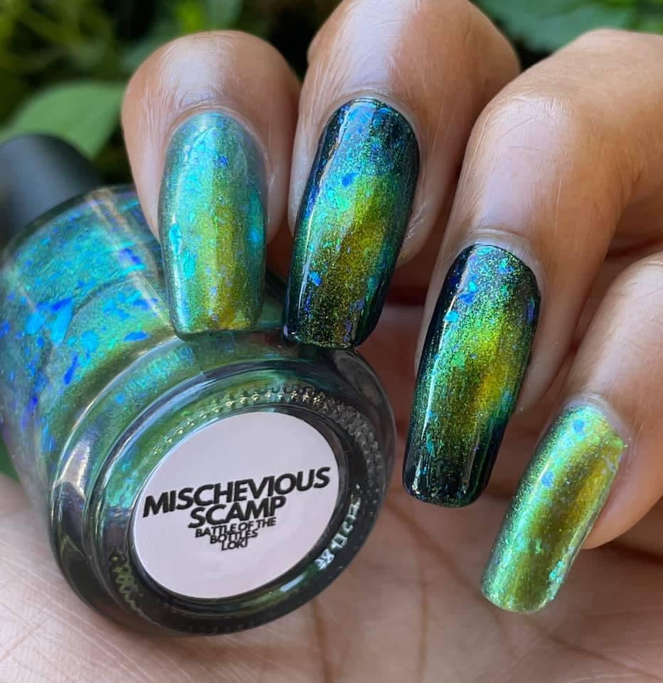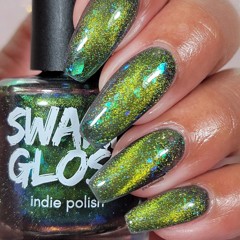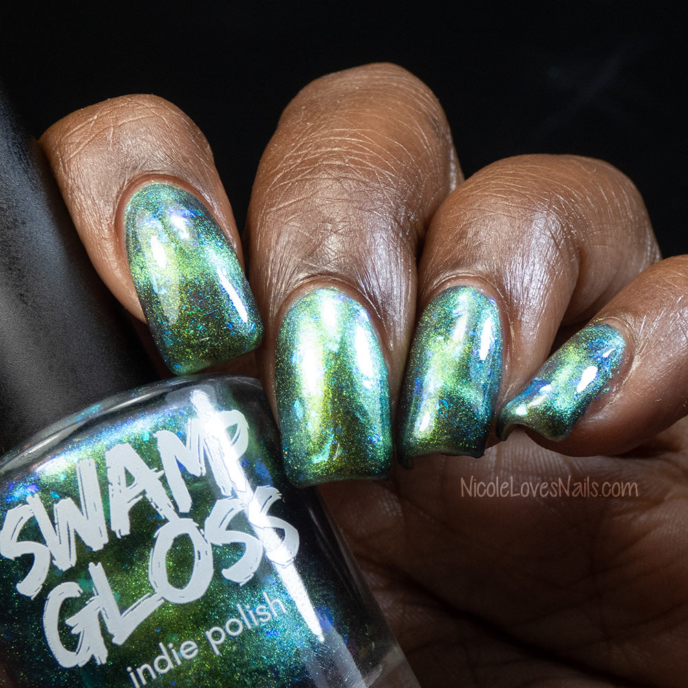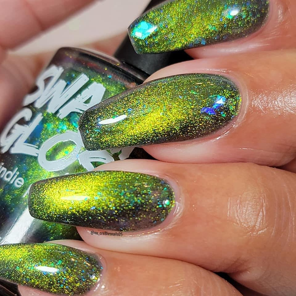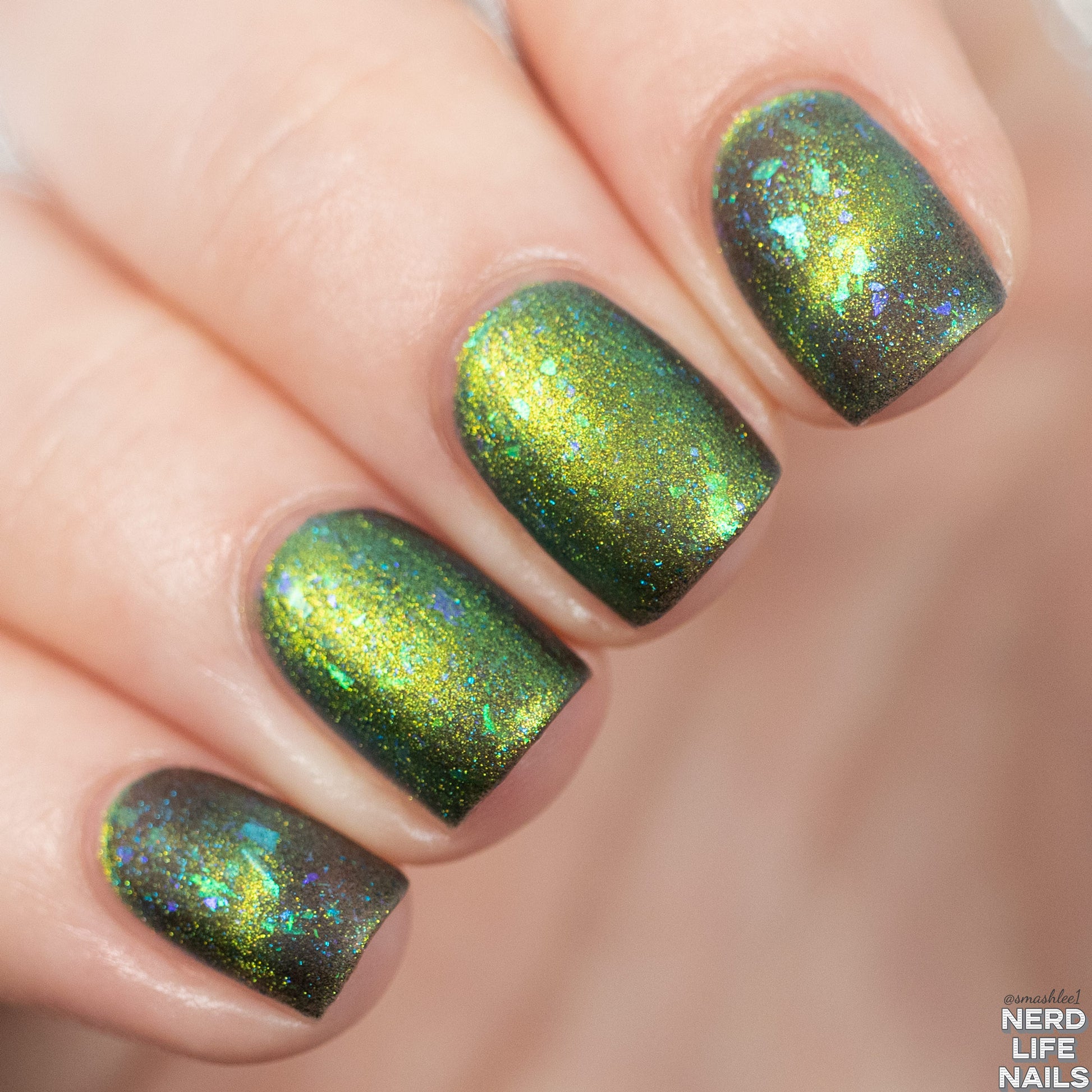 a multichrome magnetic, shifts of gold green, emerald and blue with metallic micro flakes and iridescent colorshifting flake