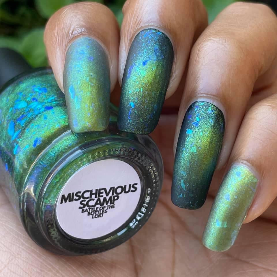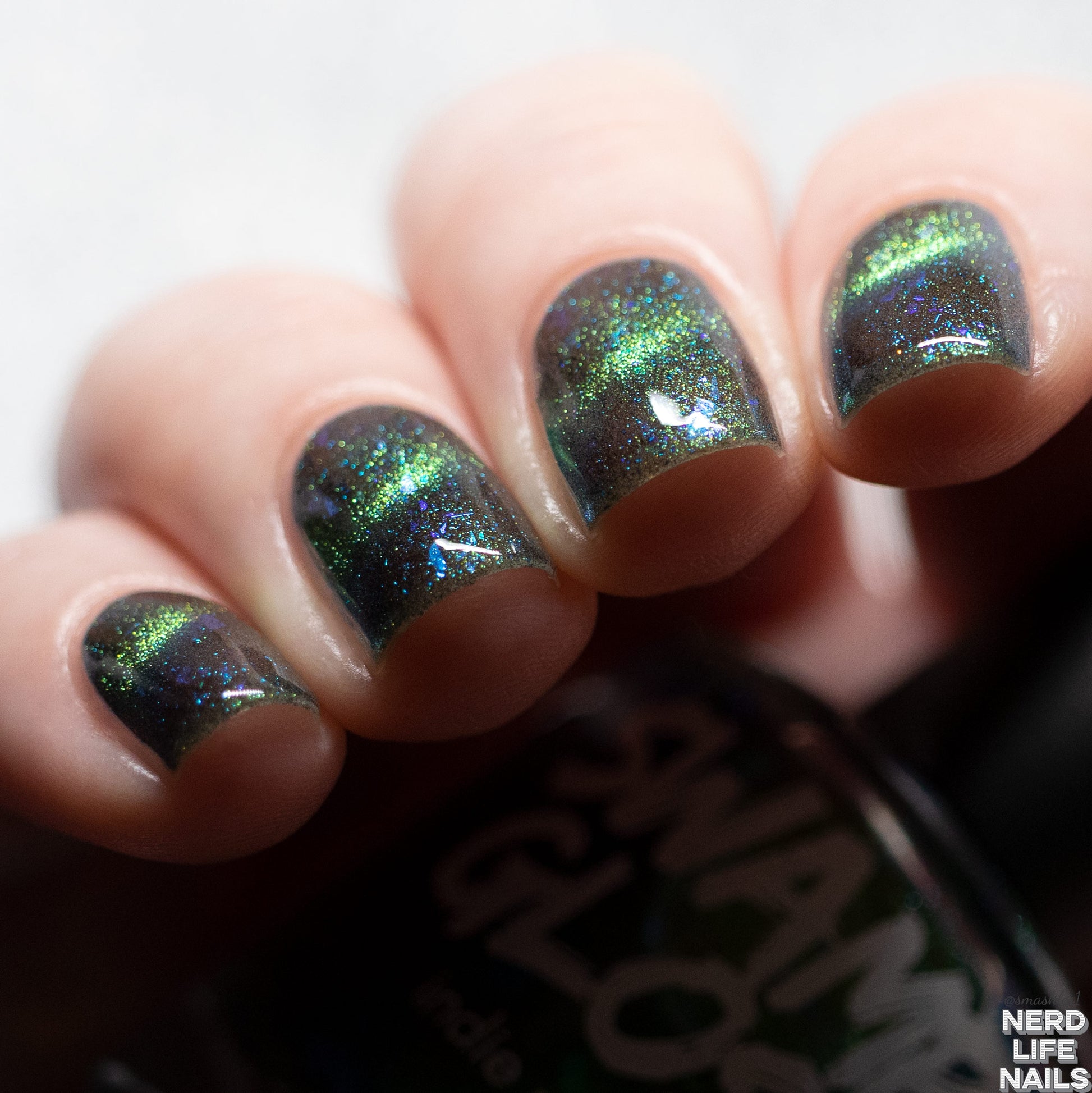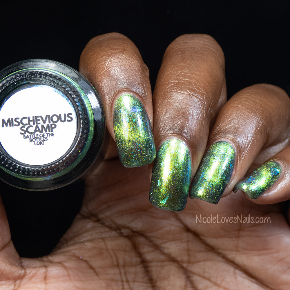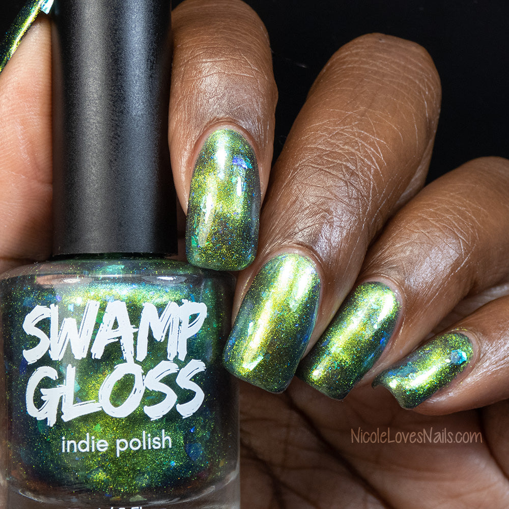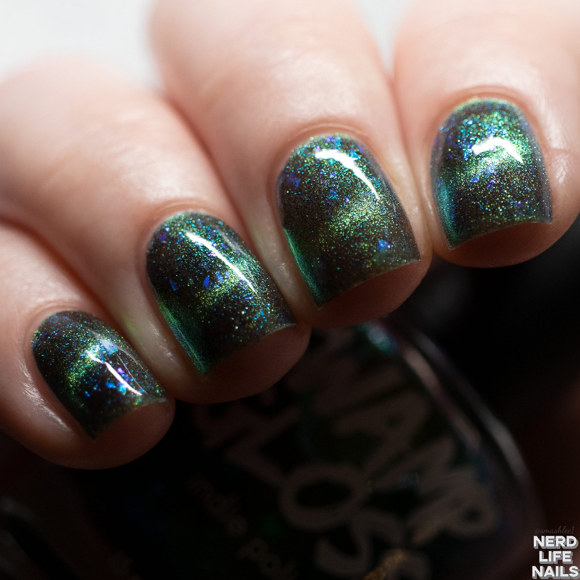 a multichrome magnetic, shifts of gold green, emerald and blue with metallic micro flakes and iridescent colorshifting flake