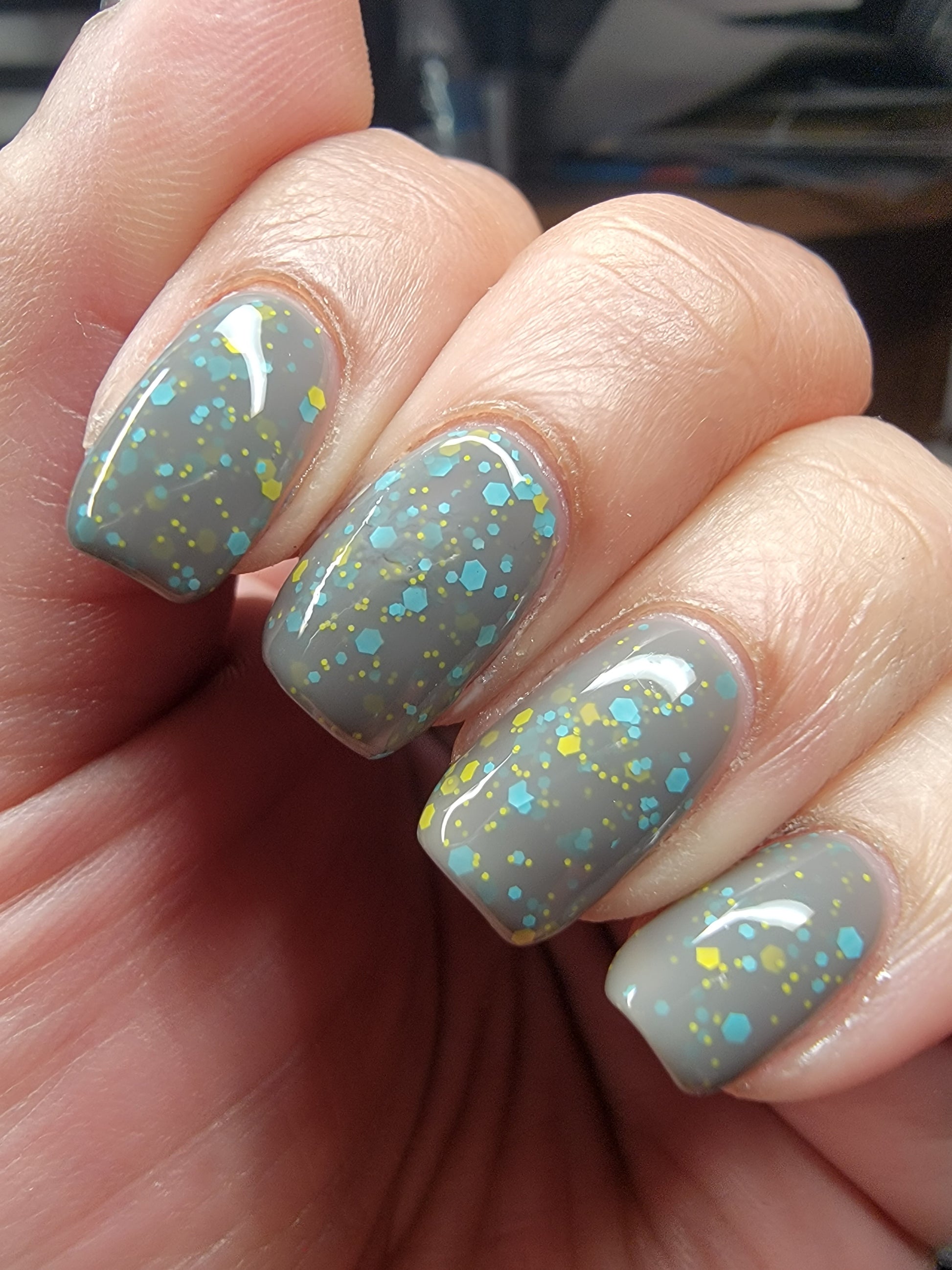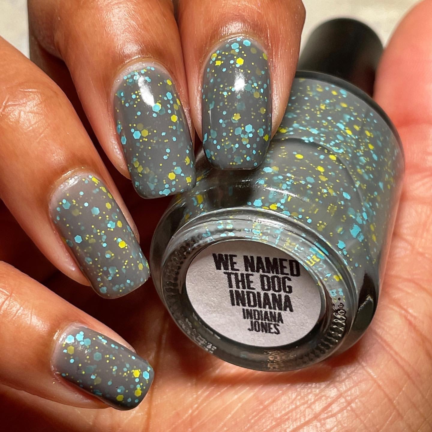 We Named the Dog Indiana - a grey crelly with yellow and aquamarine hexes