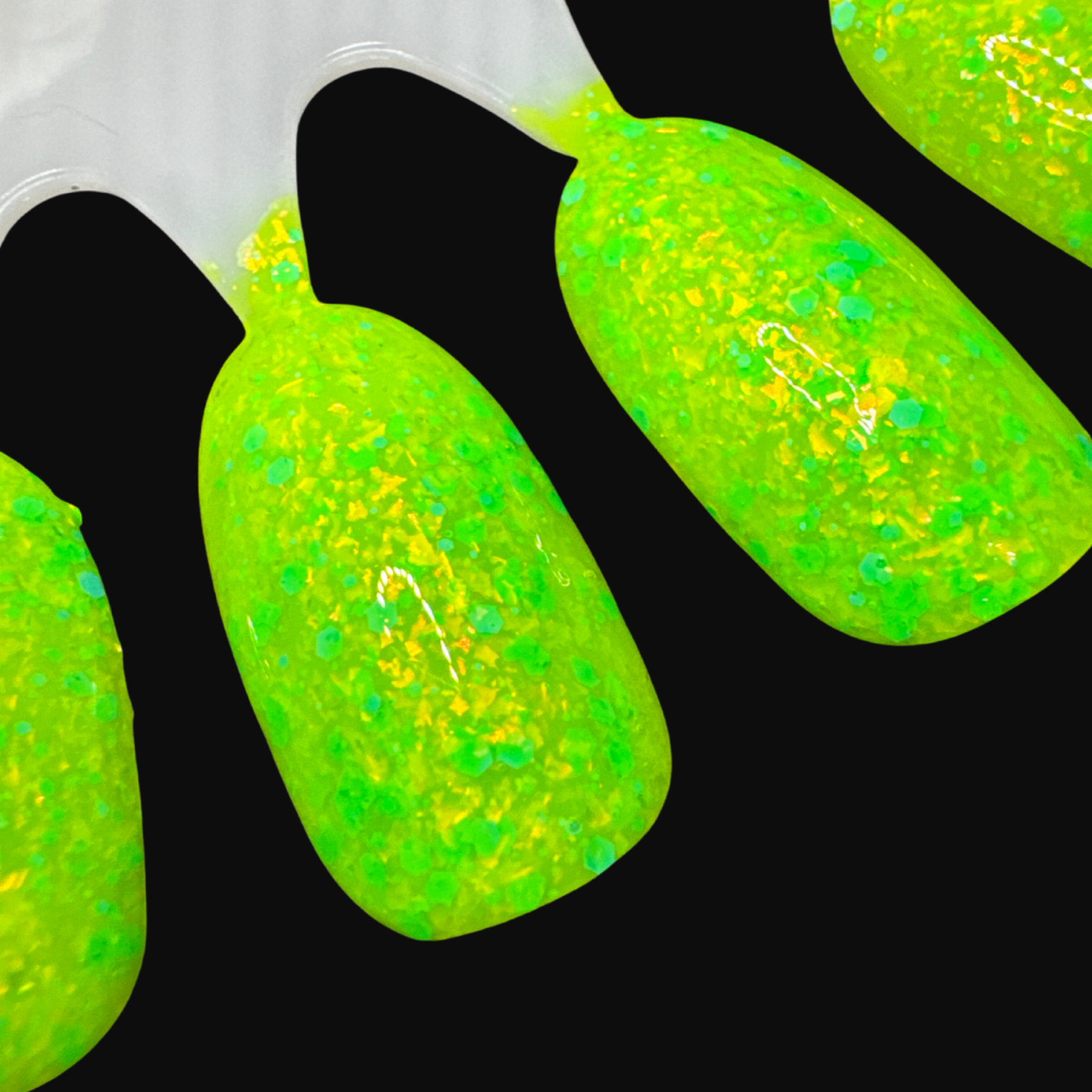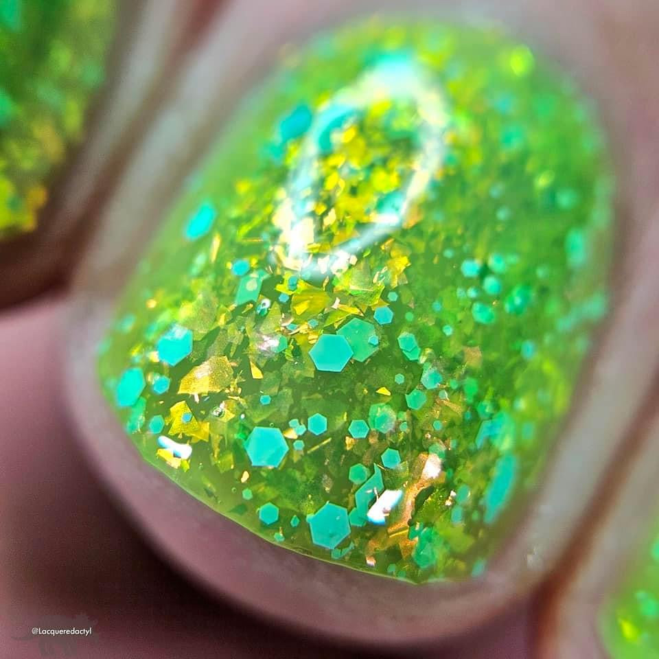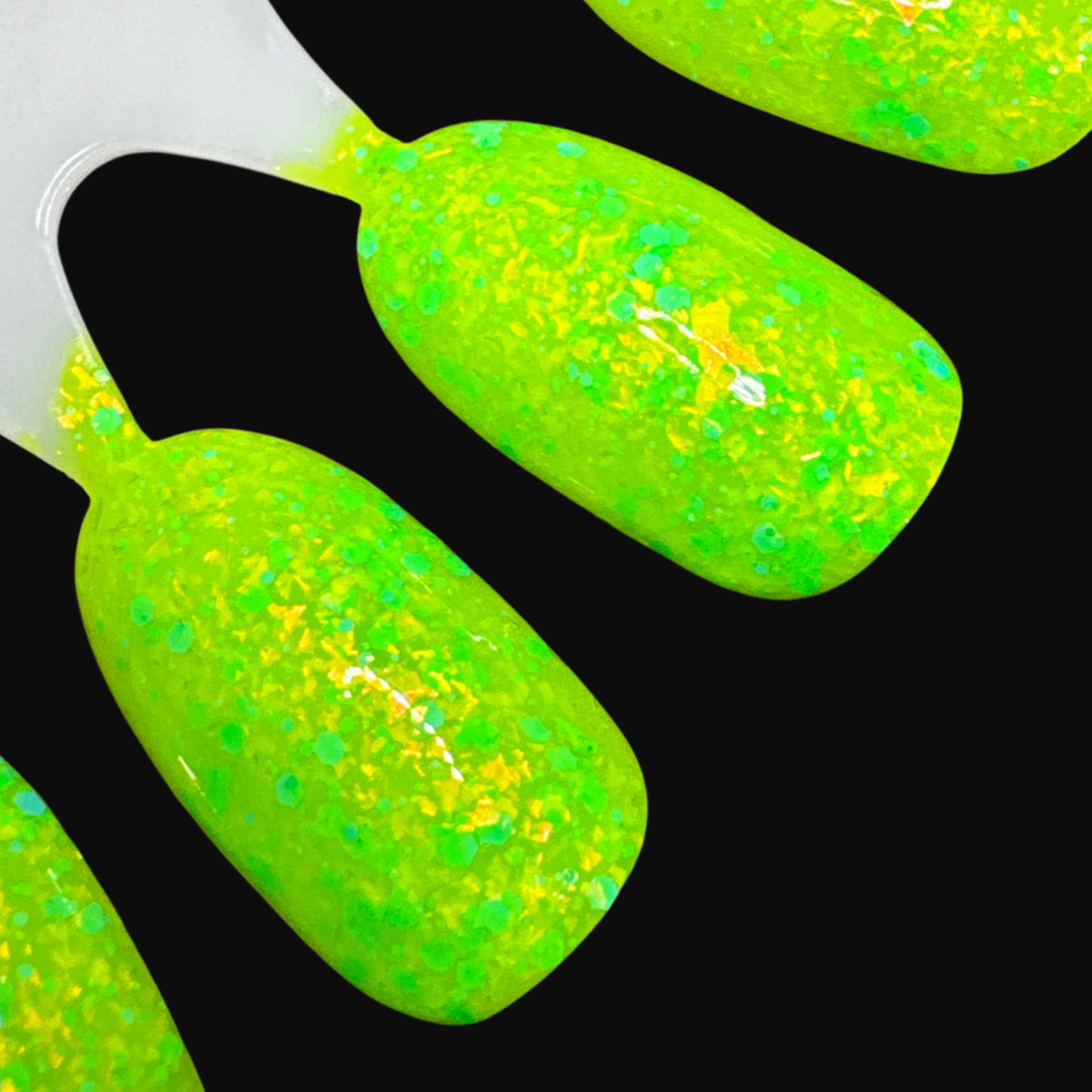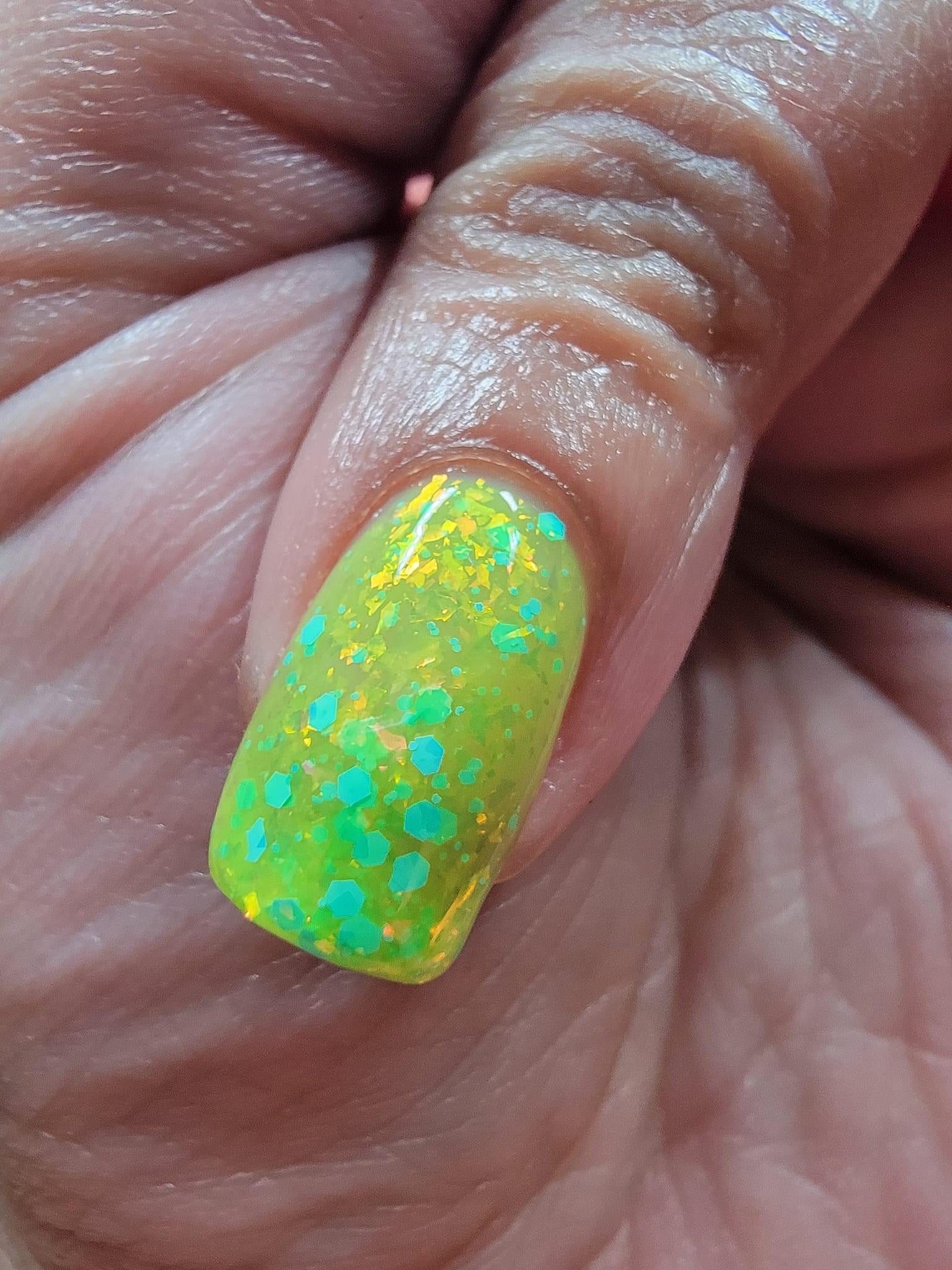 Neon yellow base with matte hexes and iridescent shifting flakes