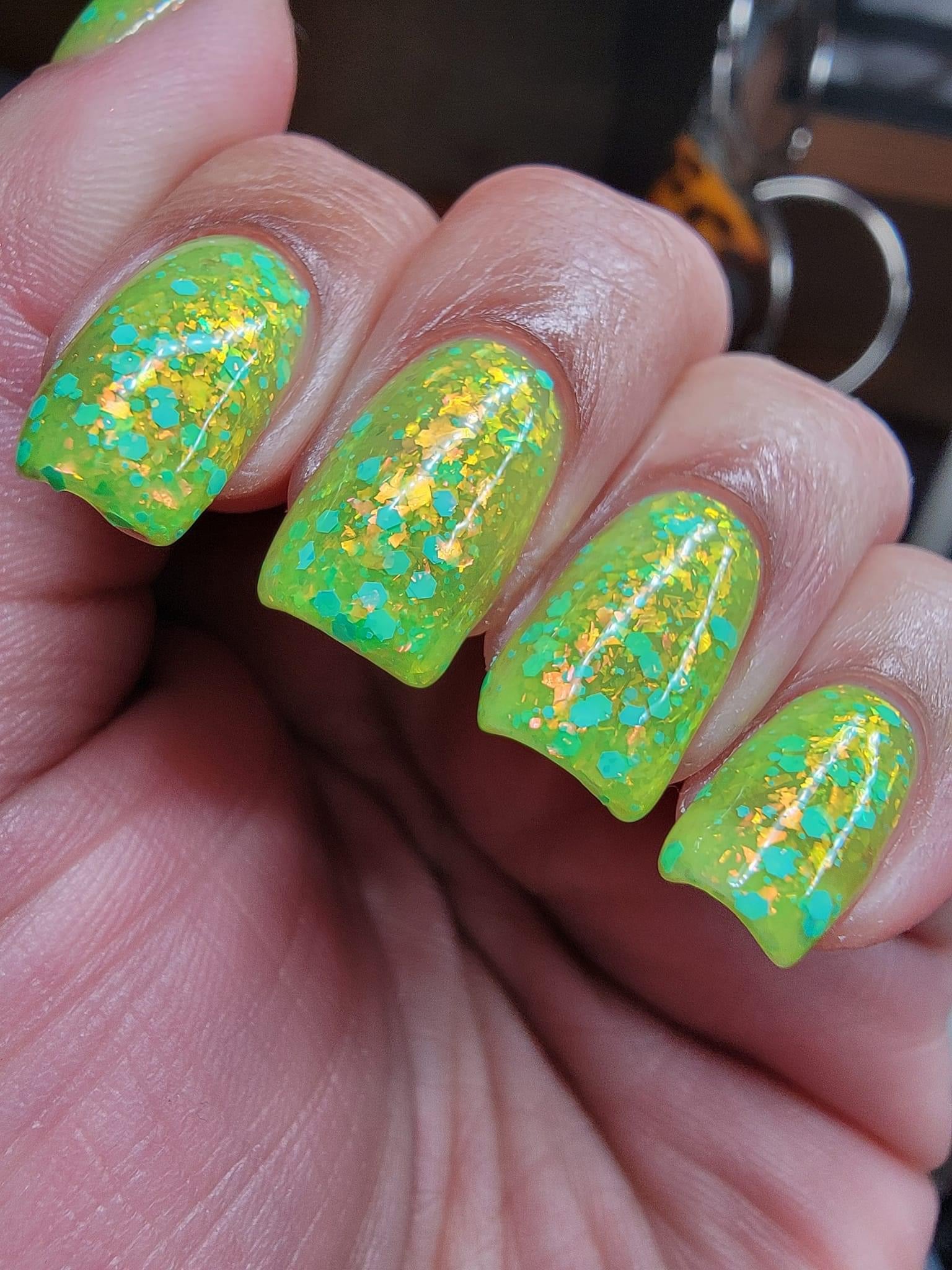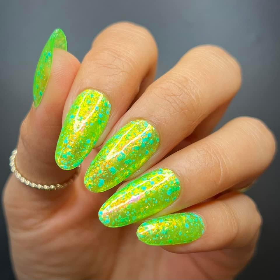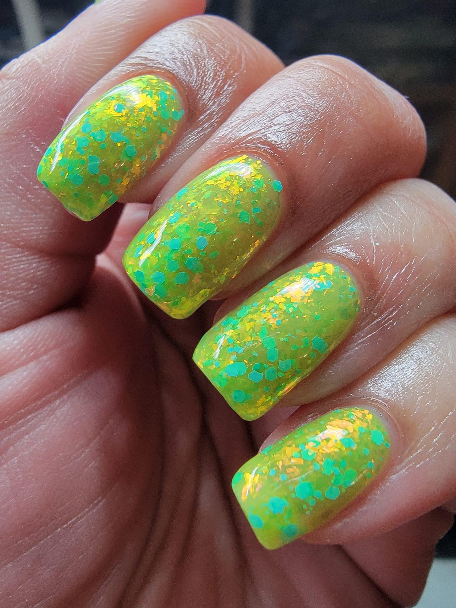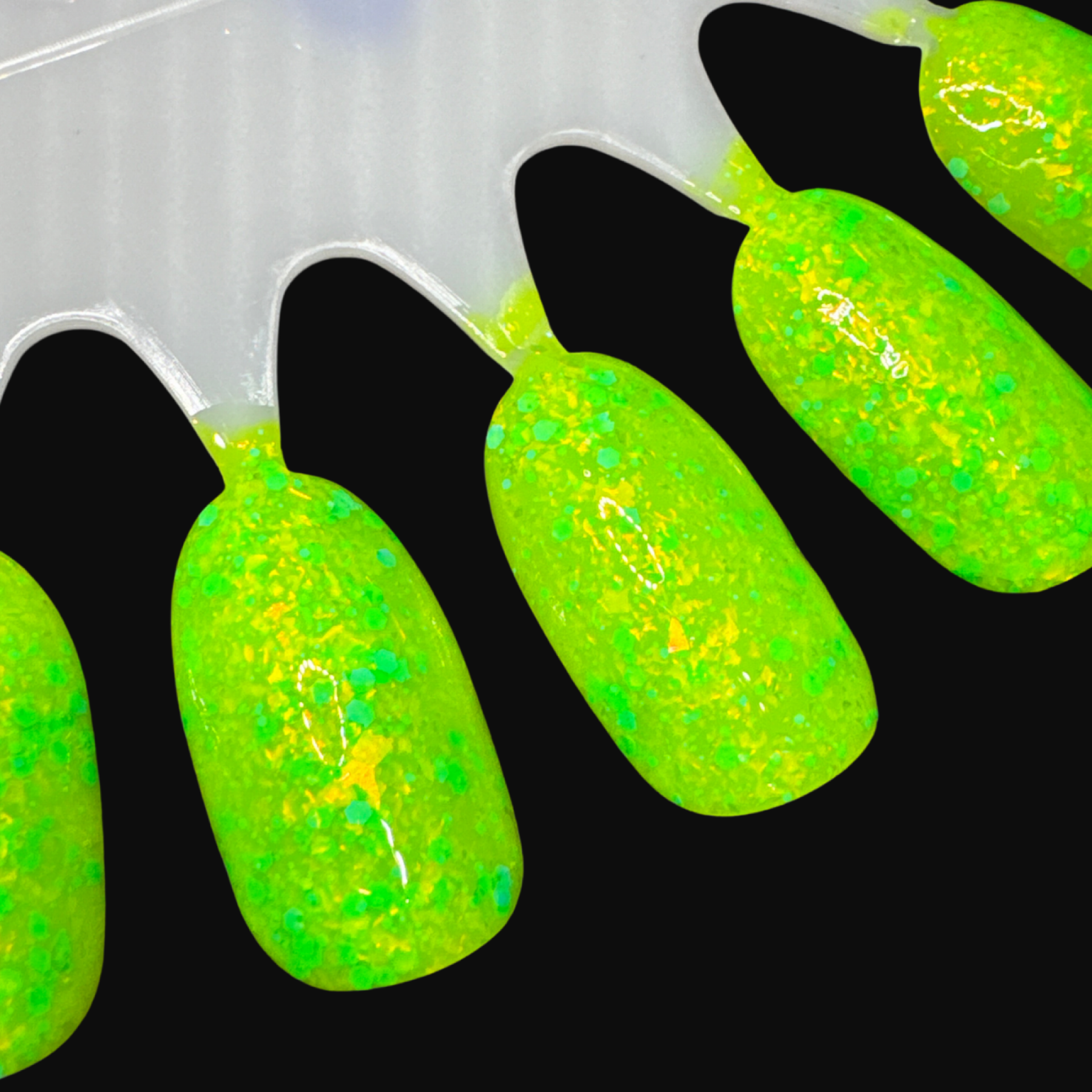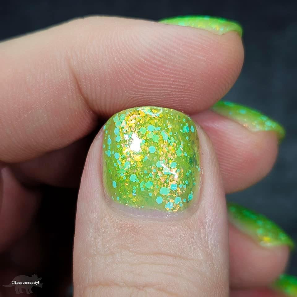 Neon yellow base with matte hexes and iridescent shifting flakes