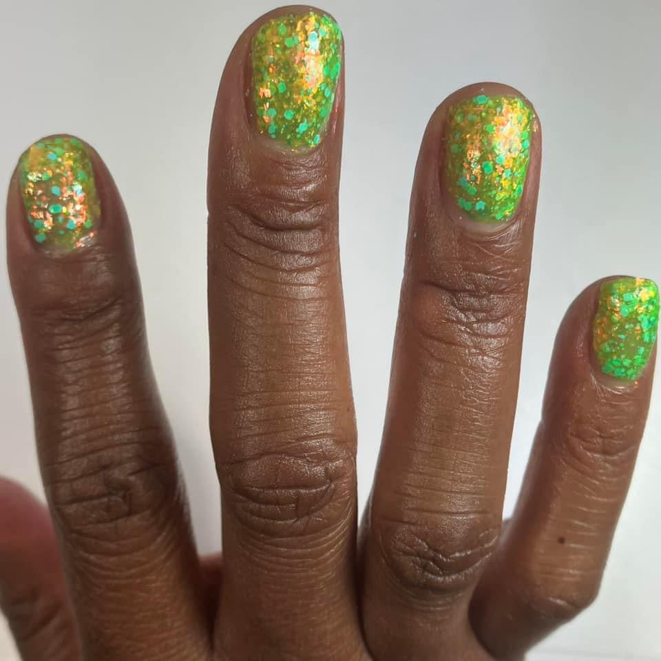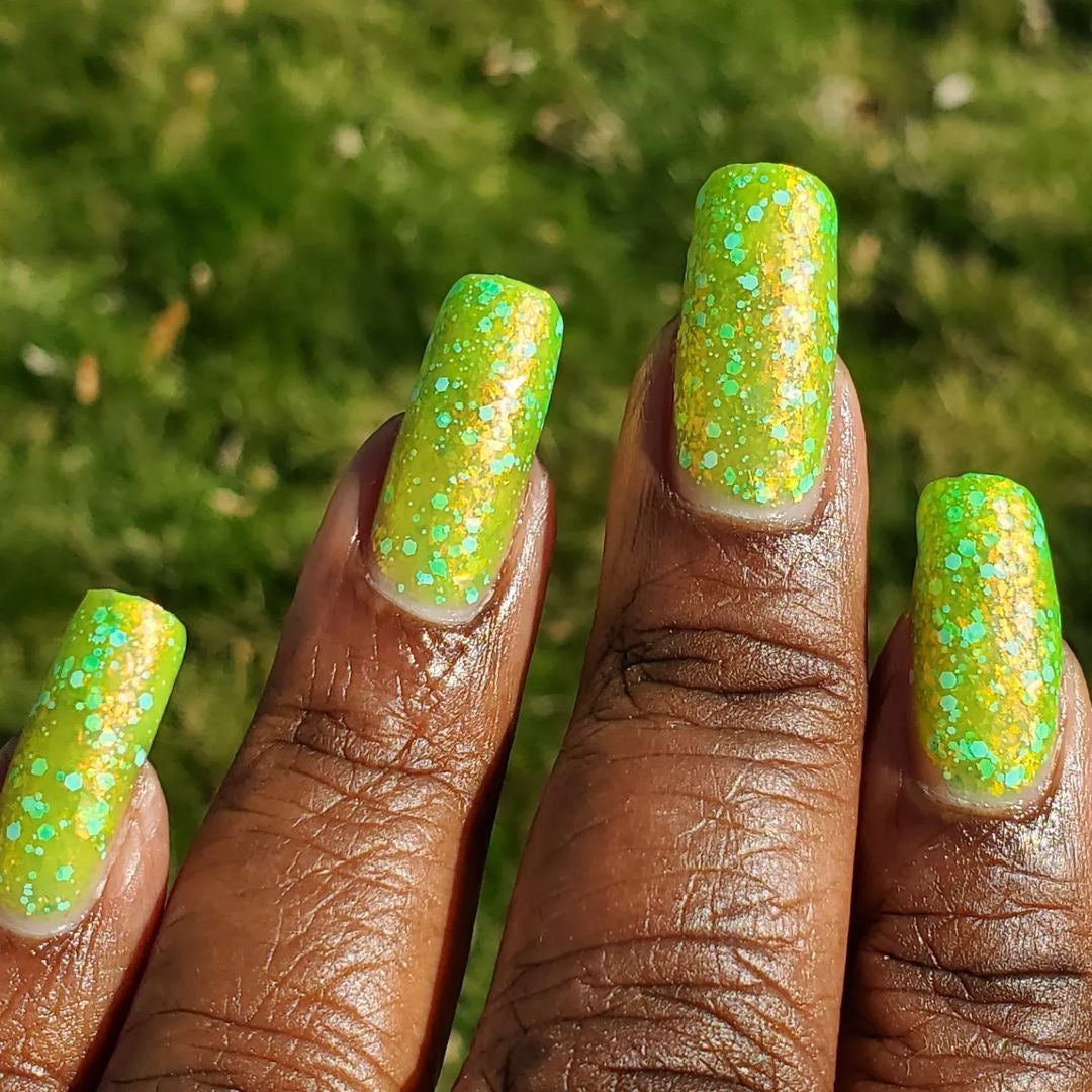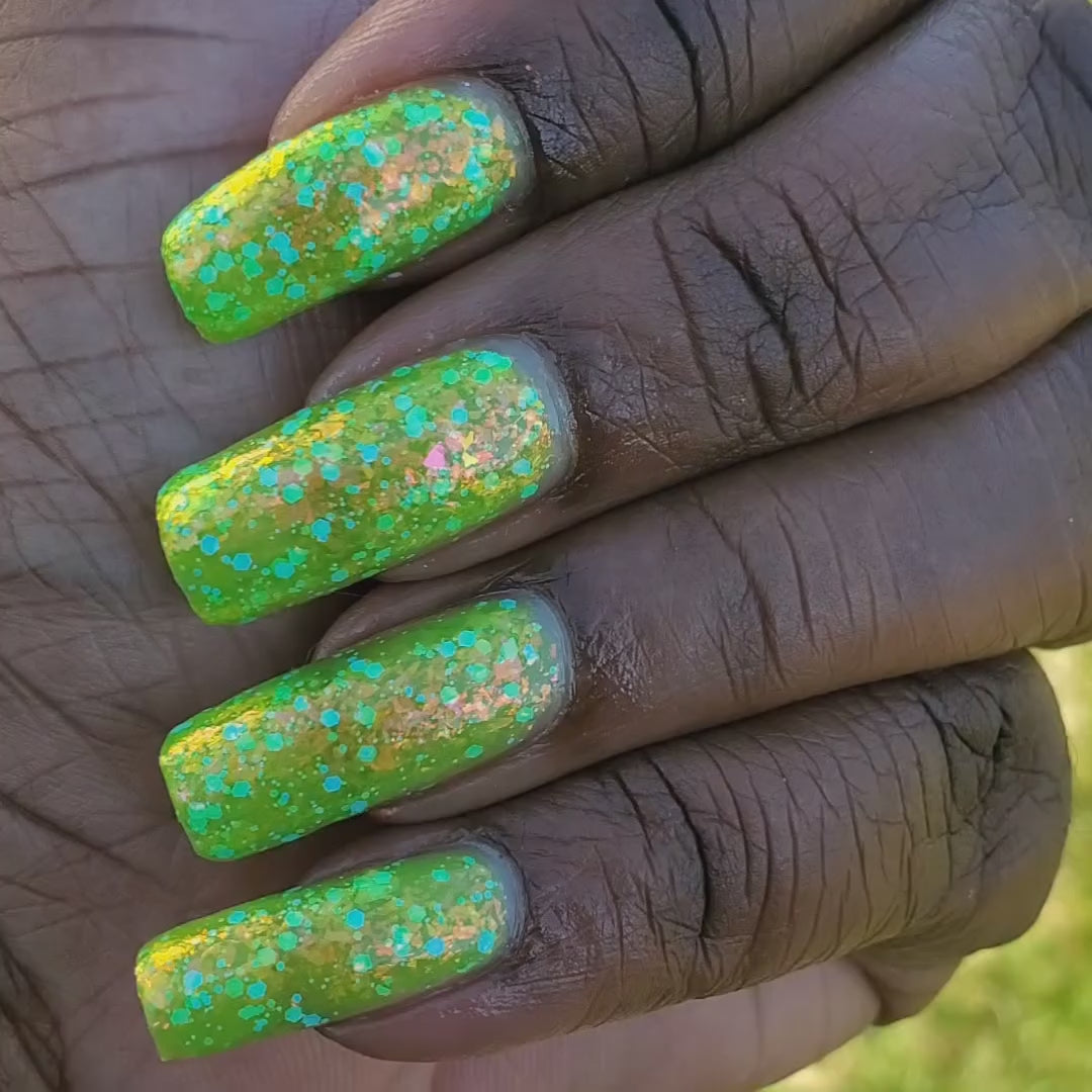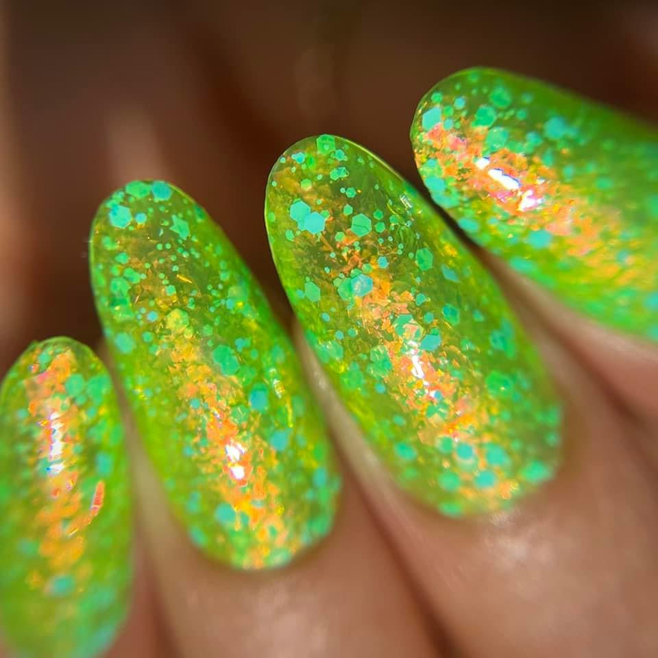 Neon yellow base with matte hexes and iridescent shifting flakes