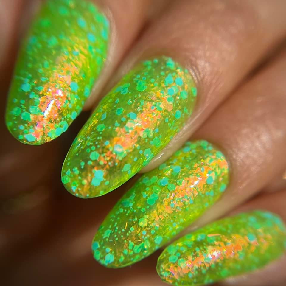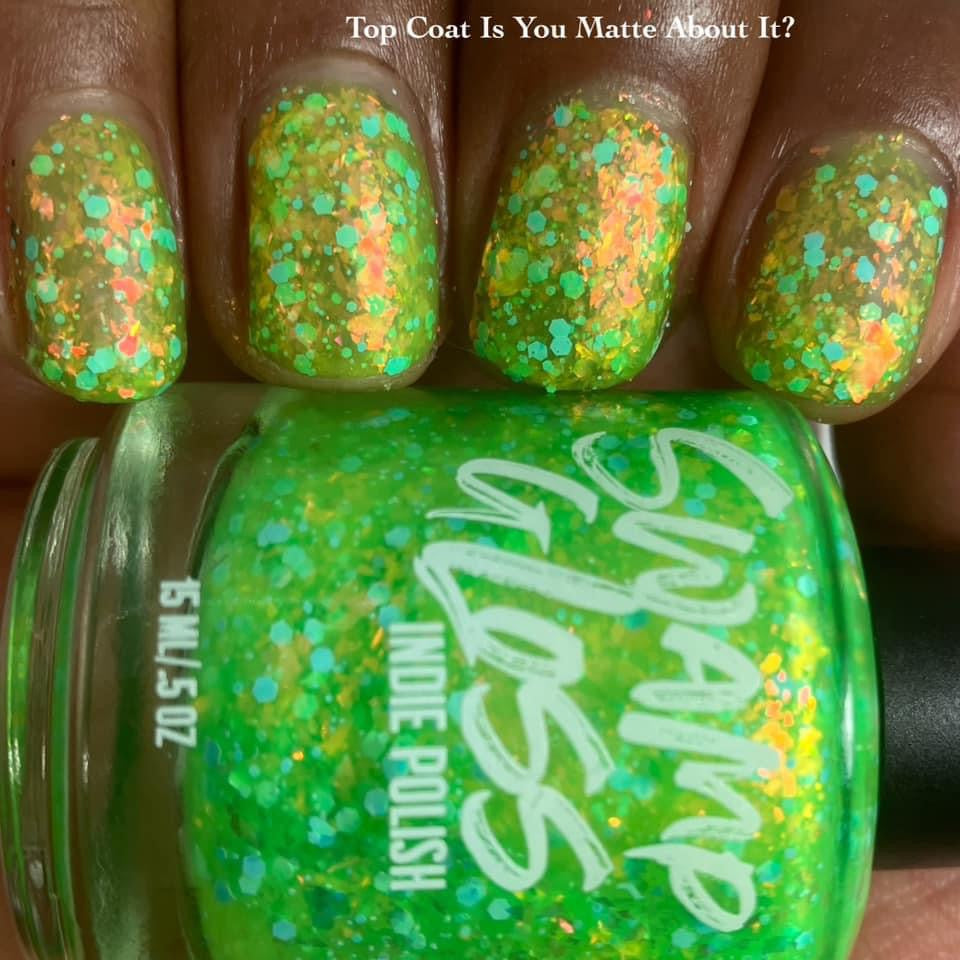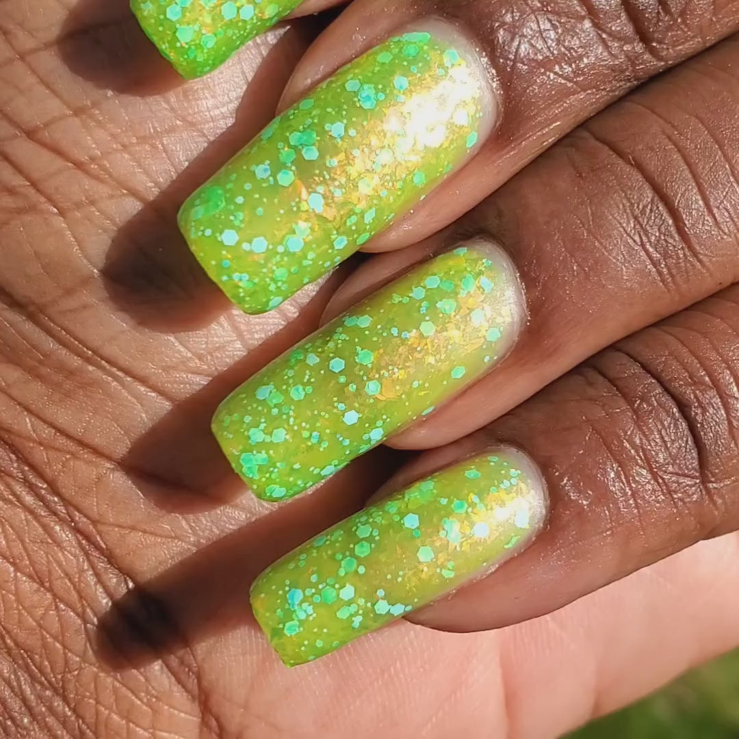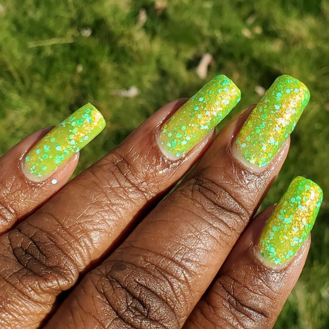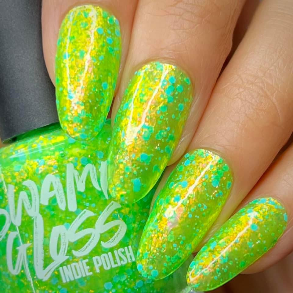 Neon yellow base with matte hexes and iridescent shifting flakes