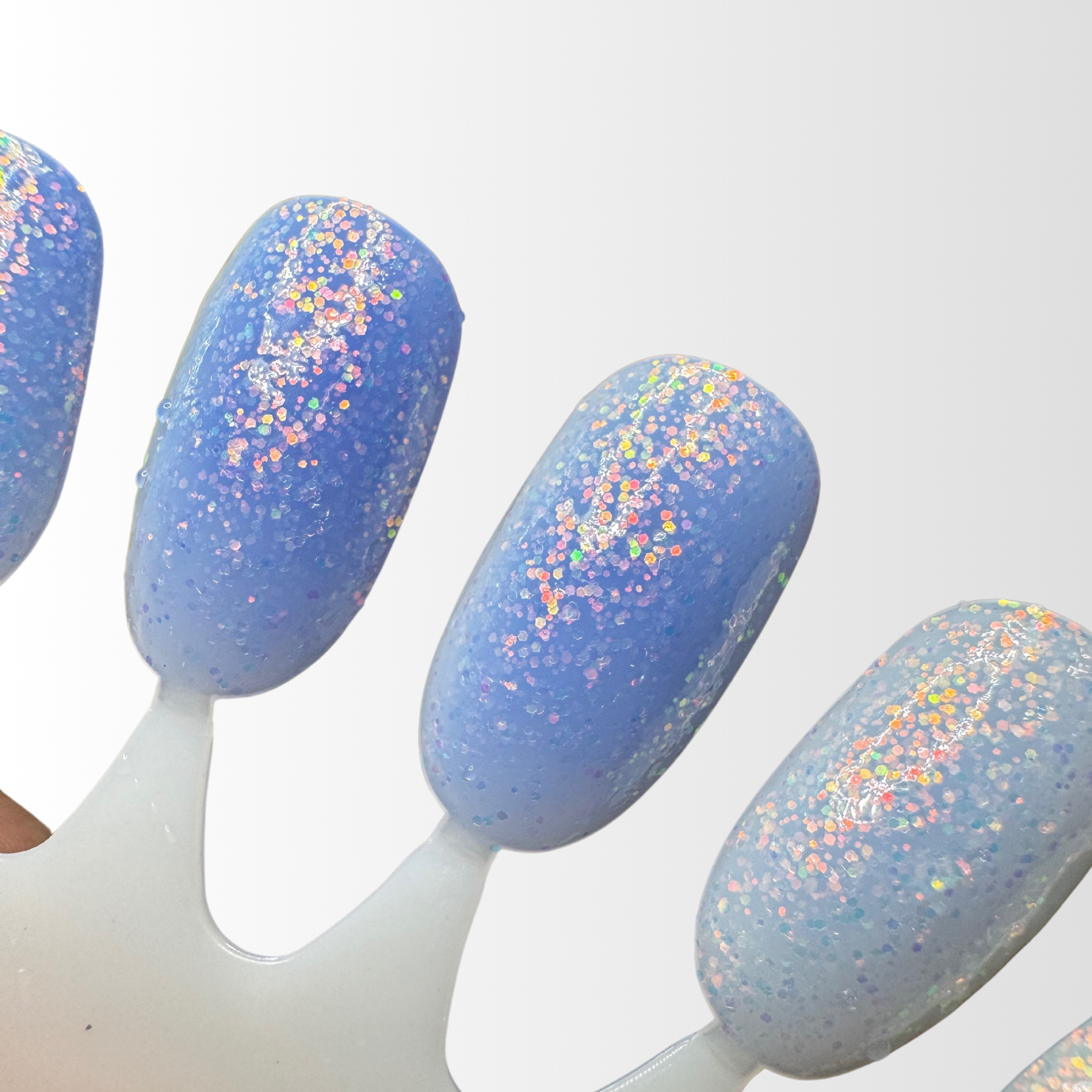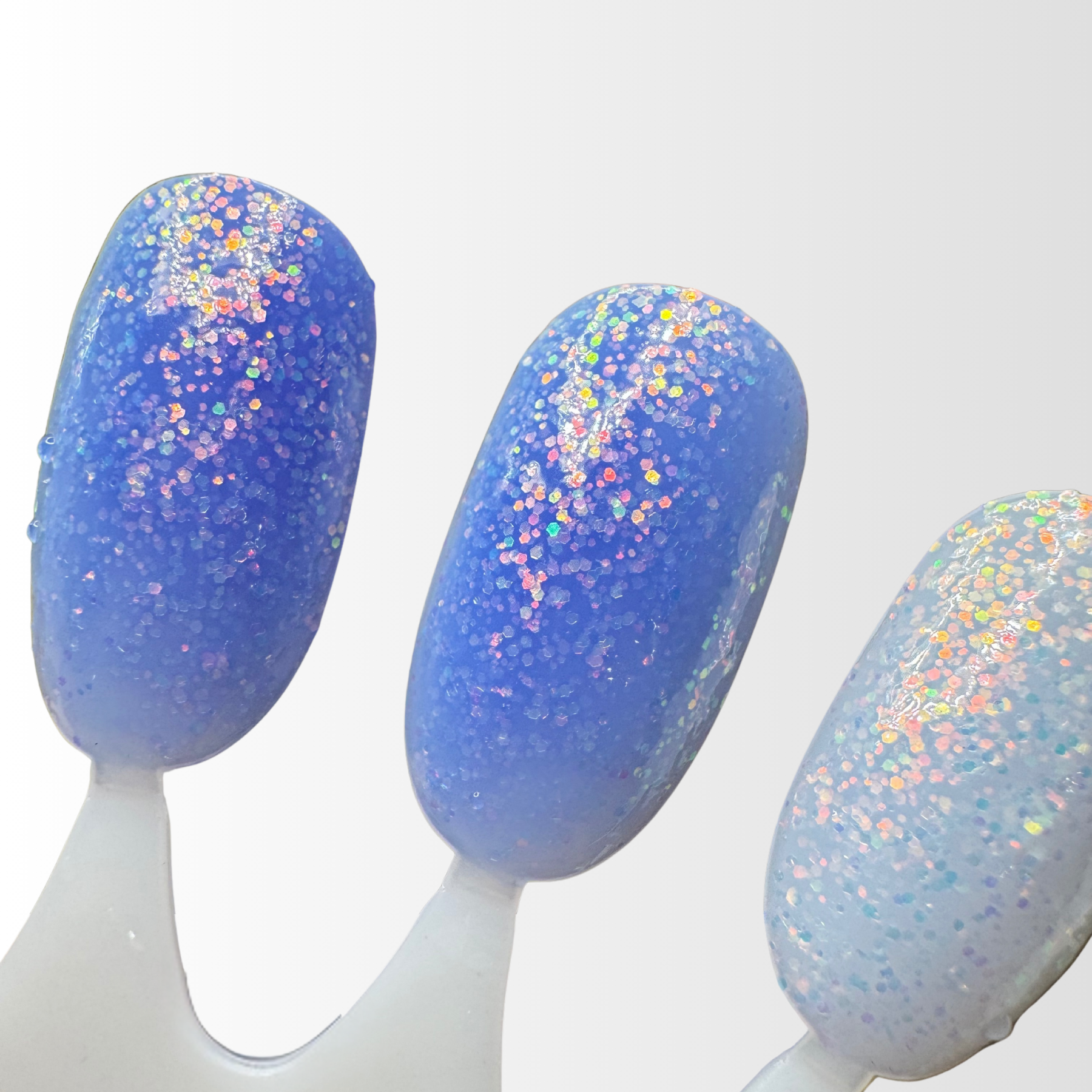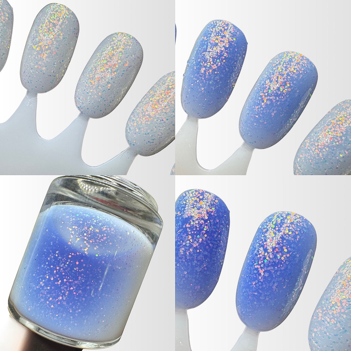 A soft sheer white to indigo solar polish with iridescent glitters that flash red/gold/green. The glitters in this polish are thirsty, in most cases two layers of top coat or a glitter top coat will be necessary to ensure a smooth finish