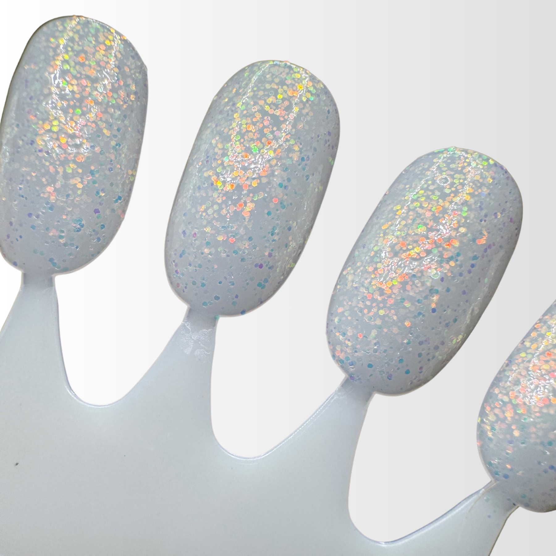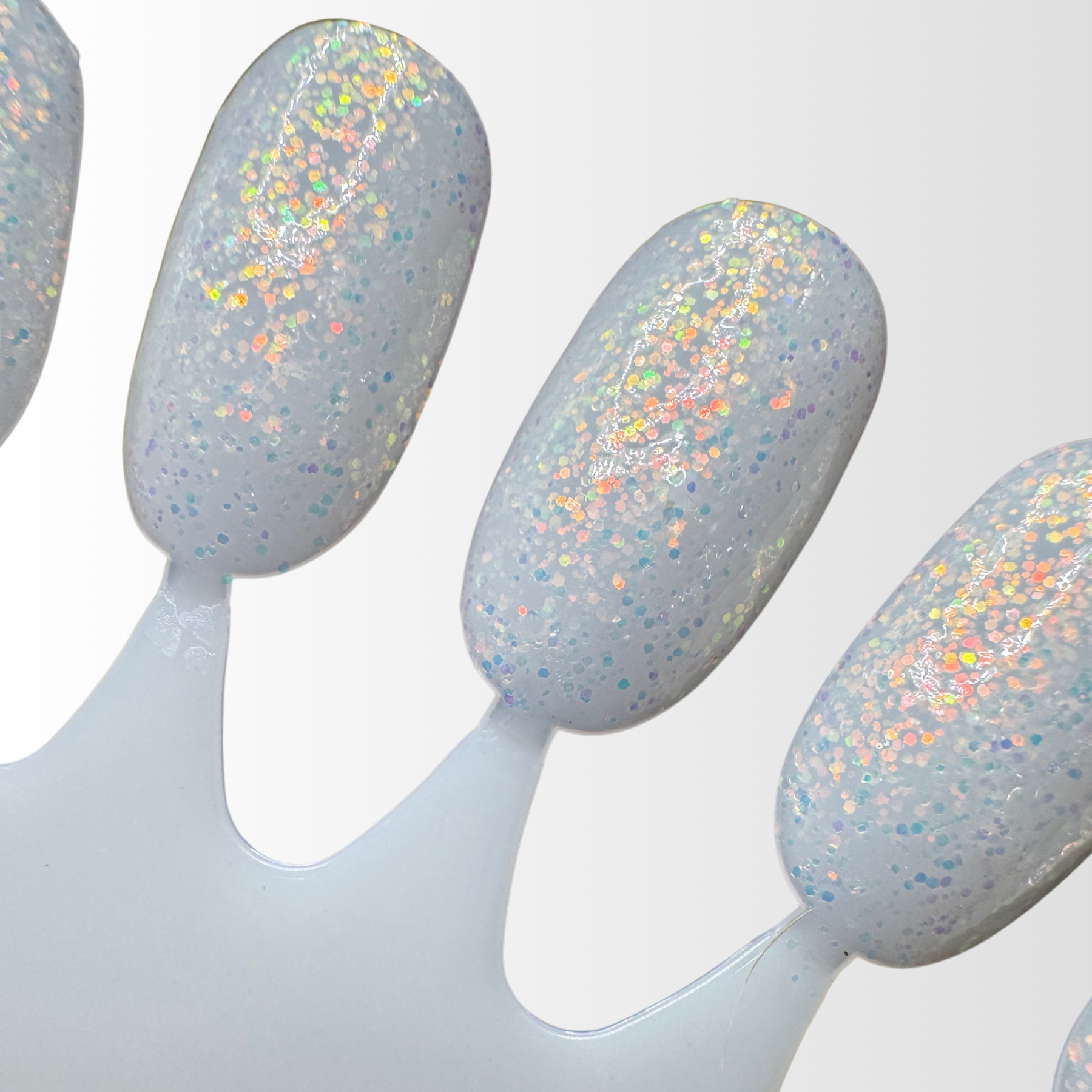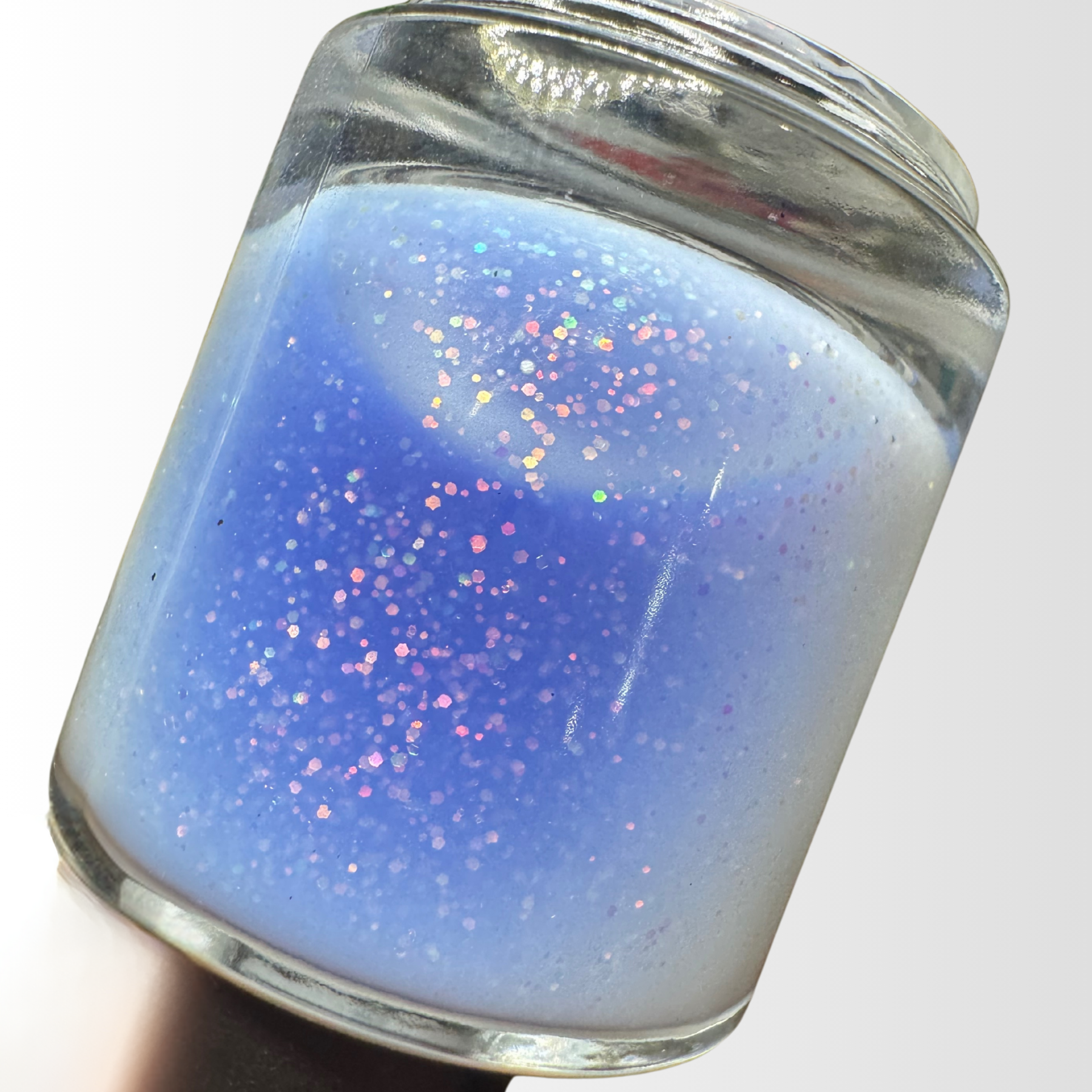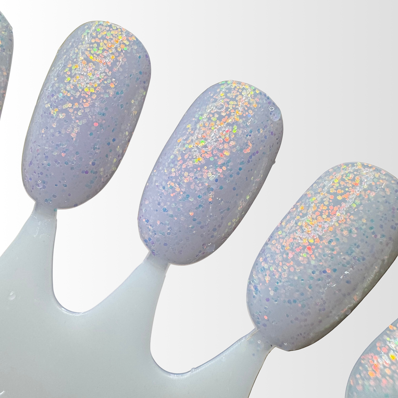 A soft sheer white to indigo solar polish with iridescent glitters that flash red/gold/green. The glitters in this polish are thirsty, in most cases two layers of top coat or a glitter top coat will be necessary to ensure a smooth finish