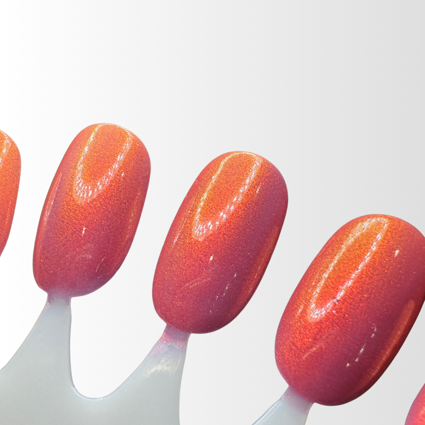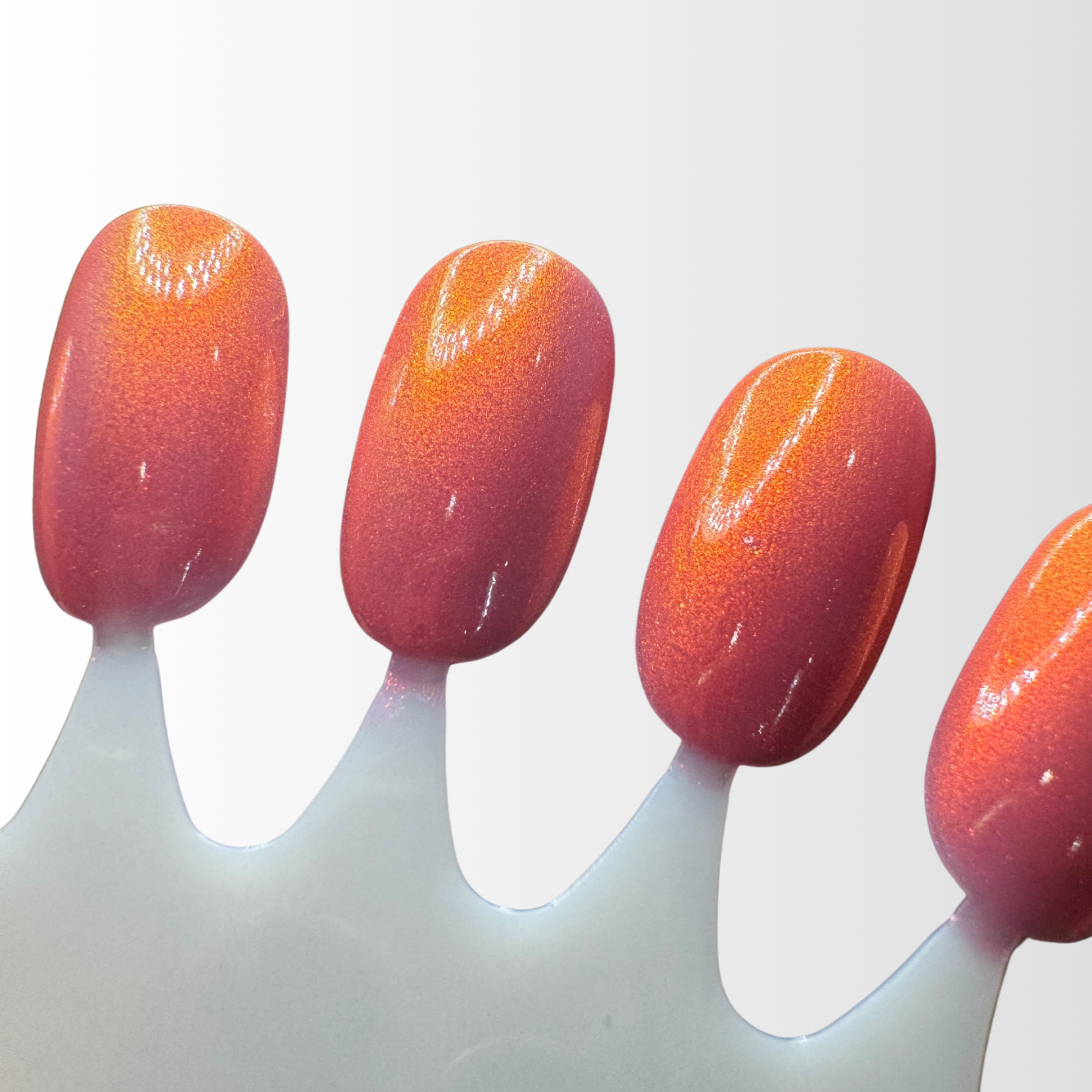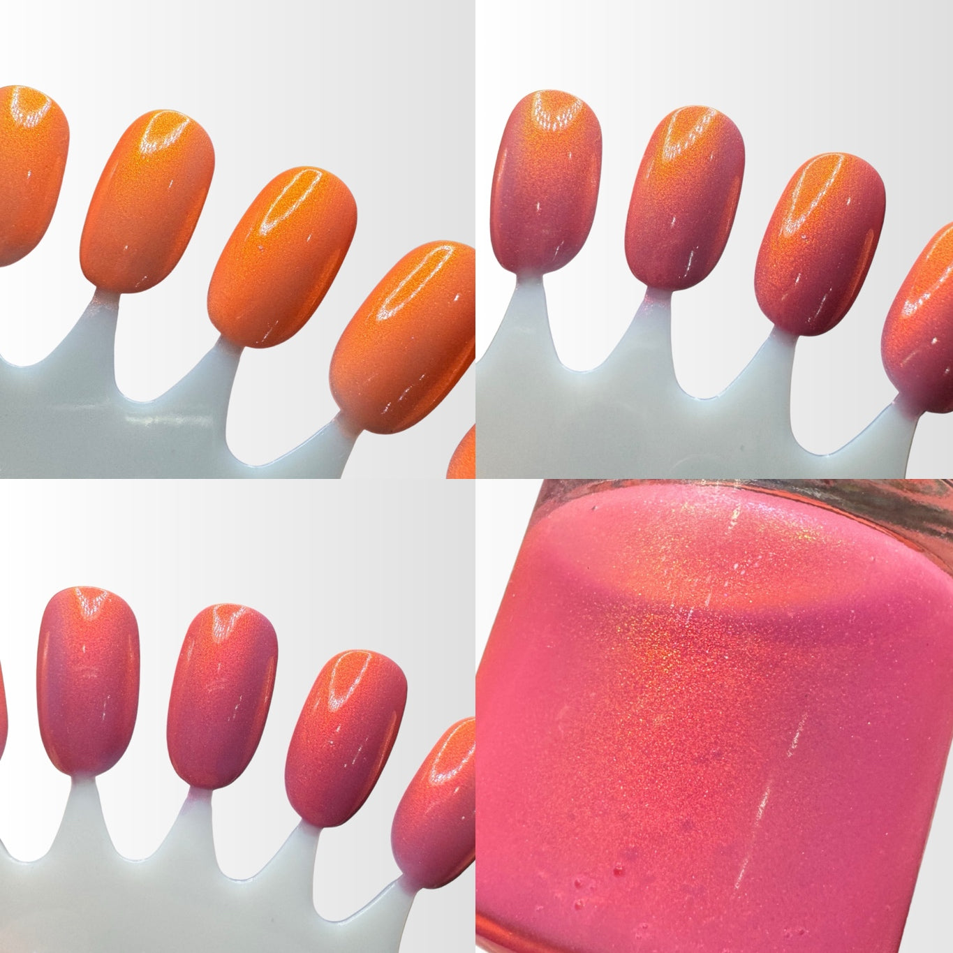 A neon coral-orange to dusty purple solar polish packed with iridescent shifting shimmer.