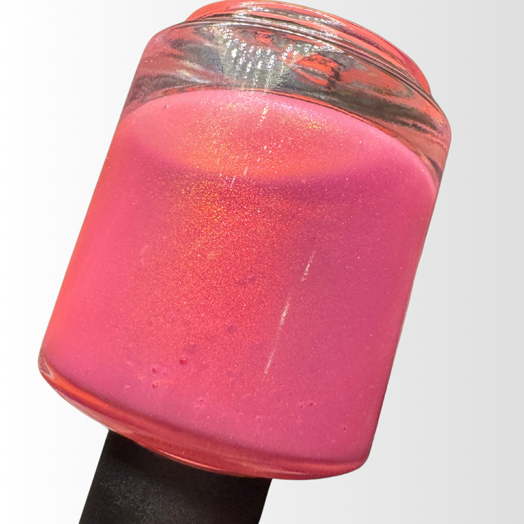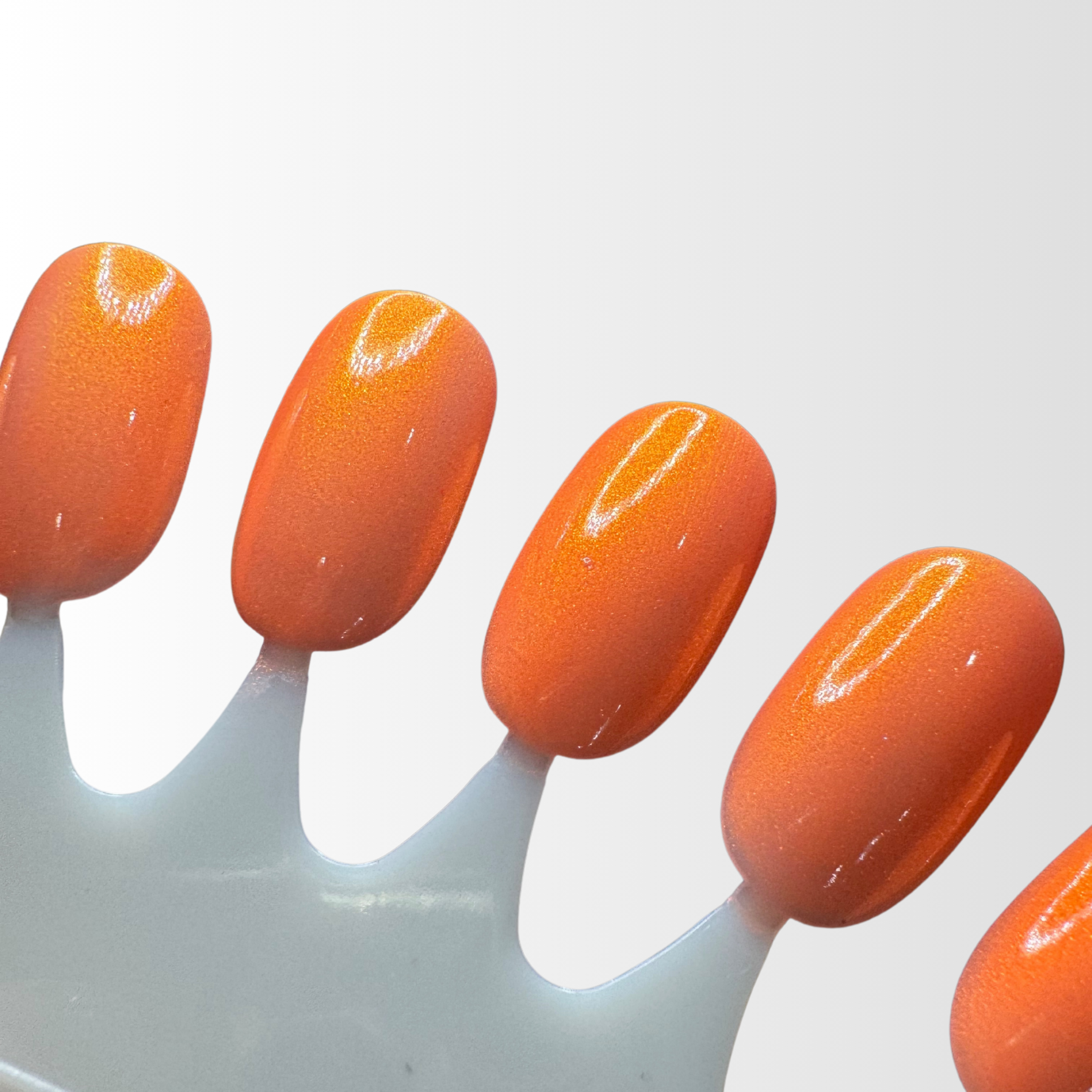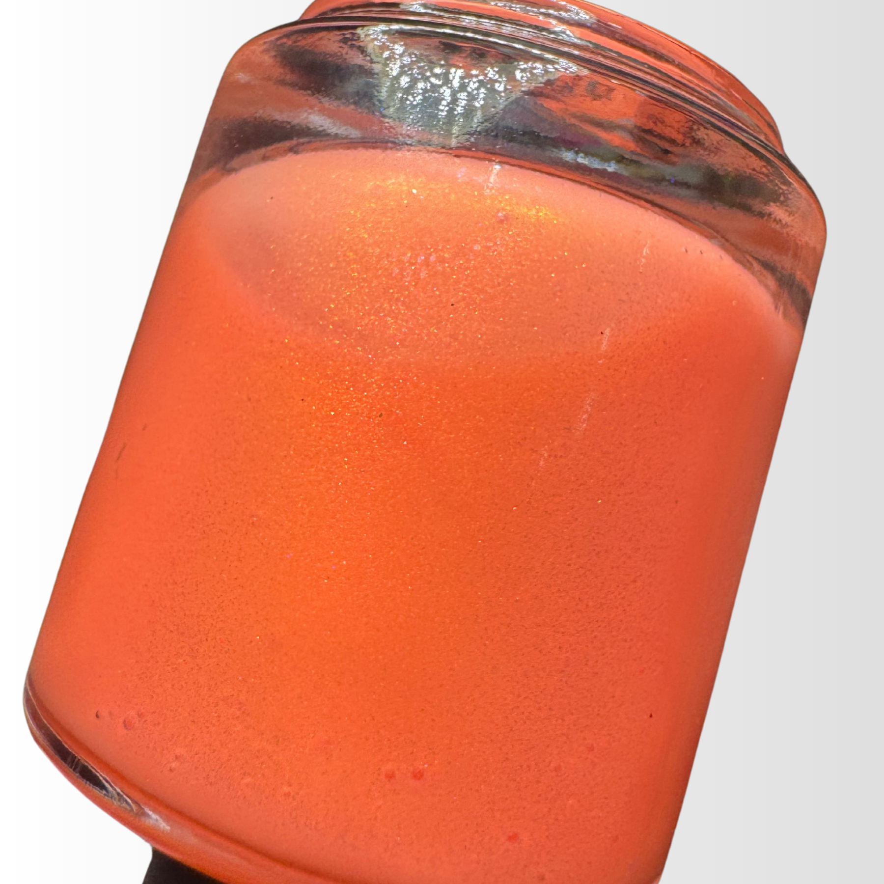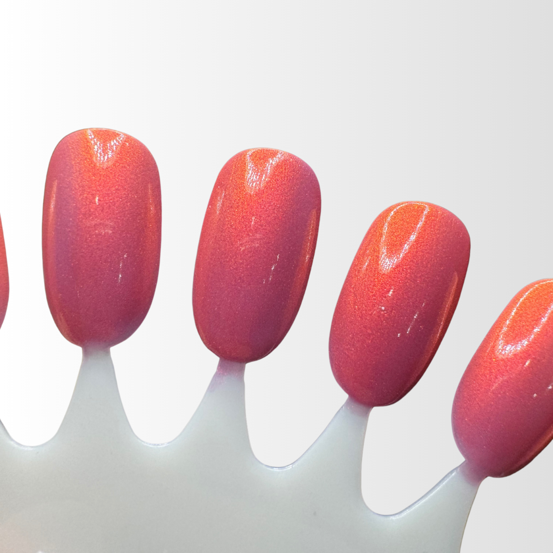 A neon coral-orange to dusty purple solar polish packed with iridescent shifting shimmer.
