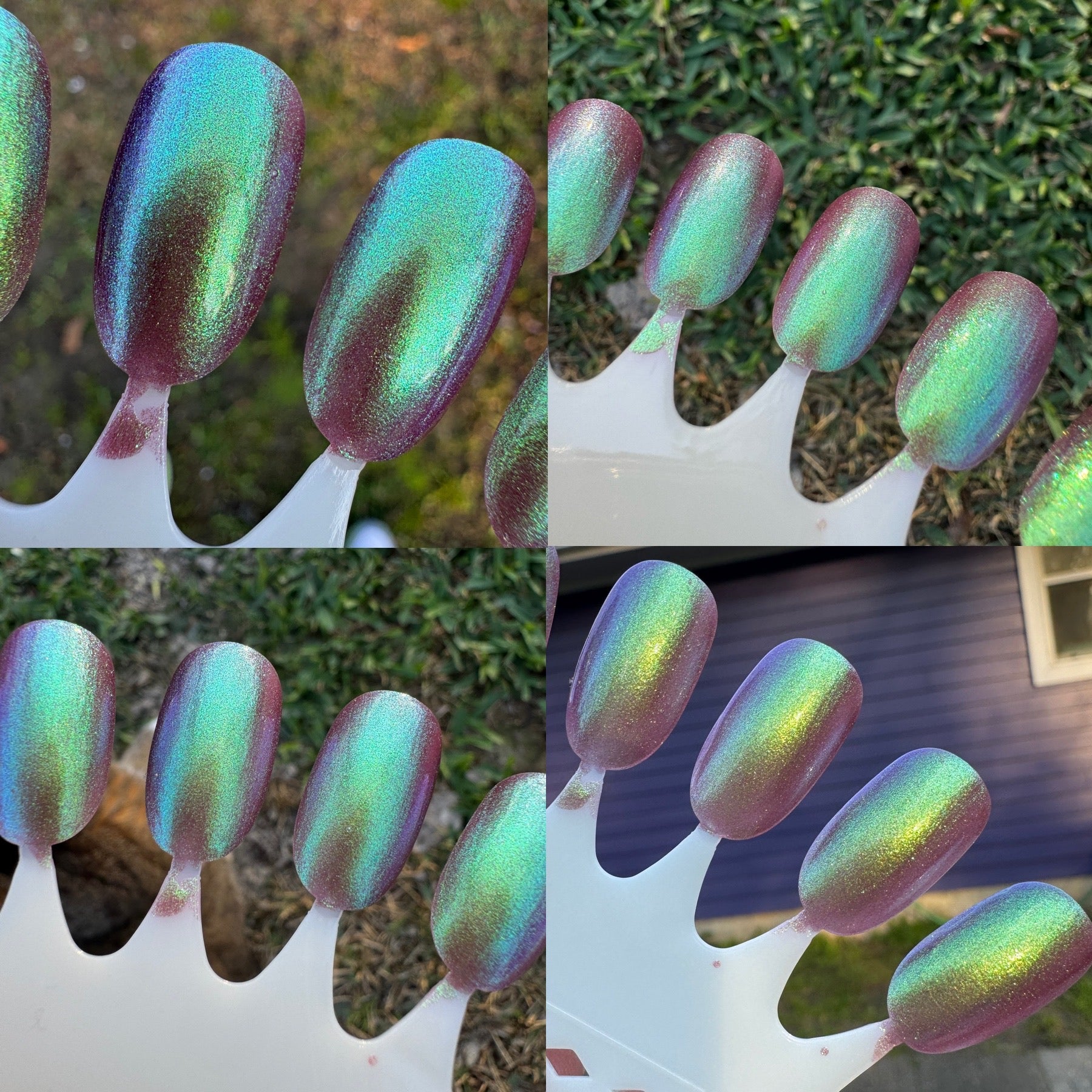 A sparkly, shifting shimmer of green gold blue purple in a grape jelly base.