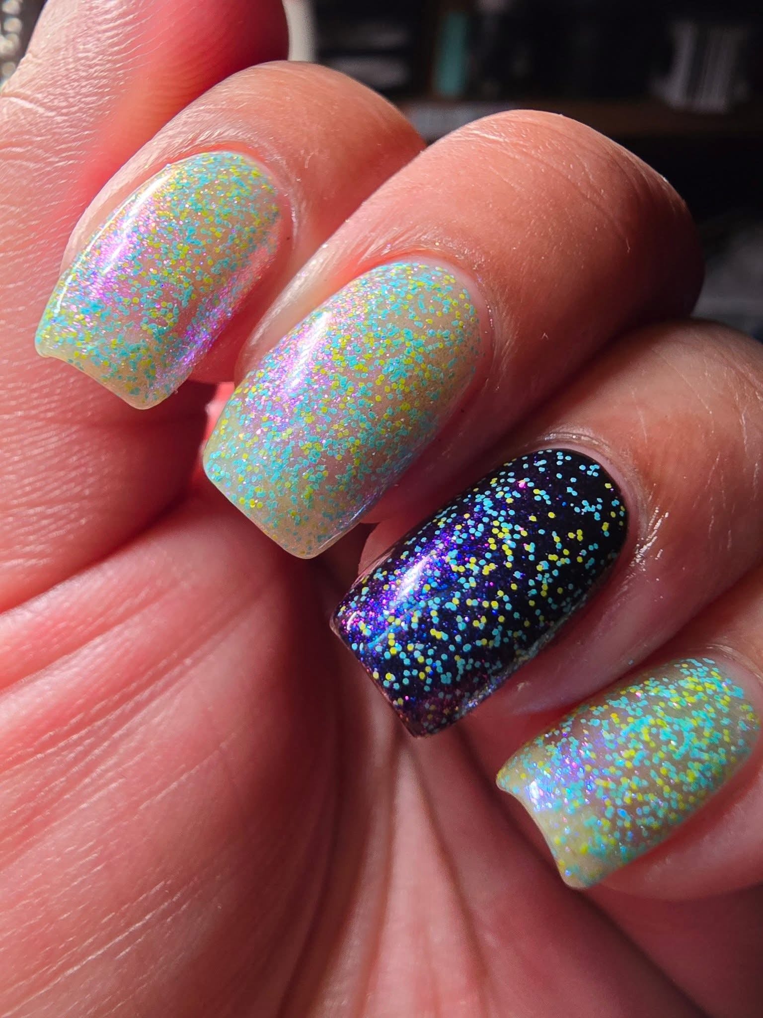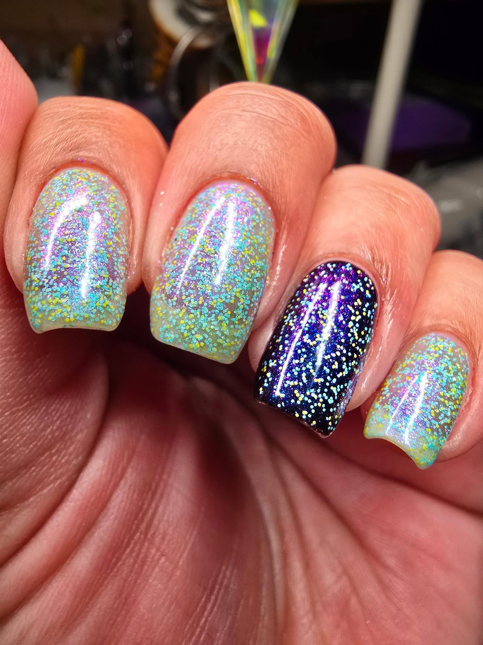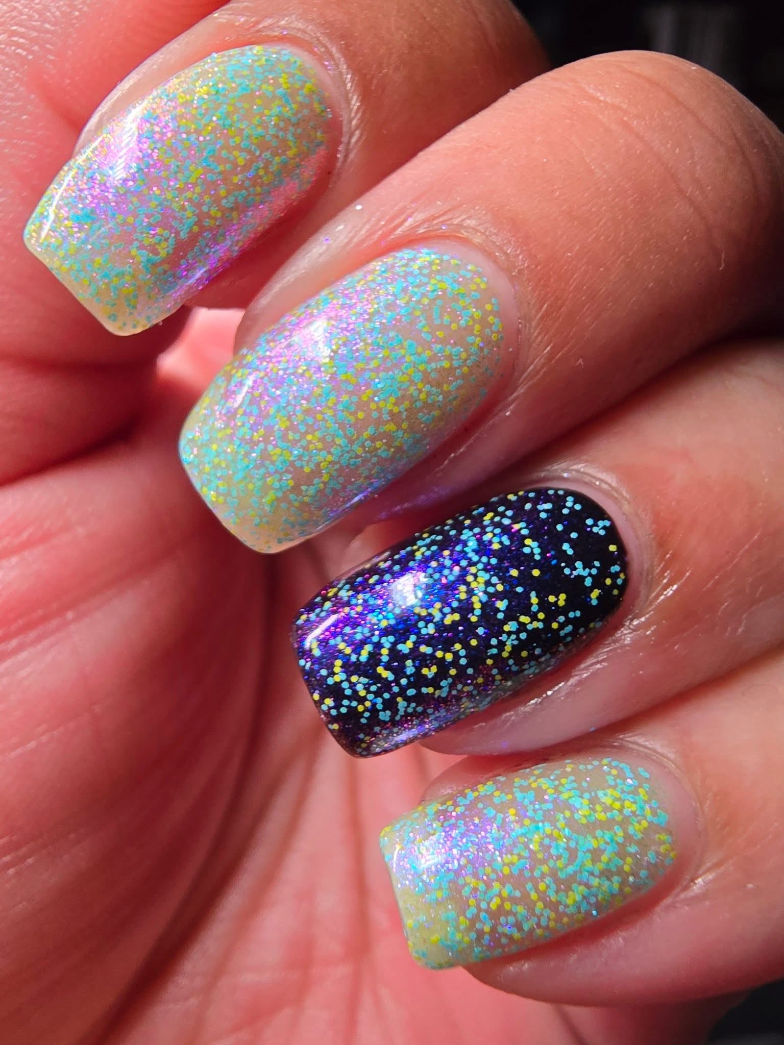 It’s a blast - multichrome shifting blue/purple/pink  and red galaxy glitter