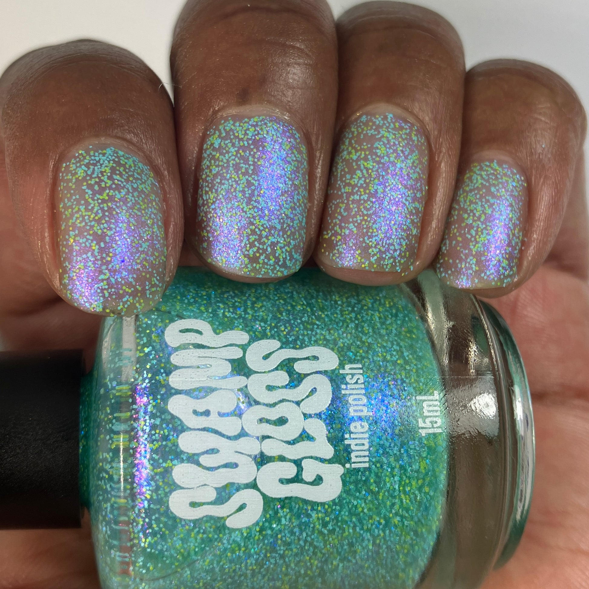 Golden Rule Mother Fucker - very pale grey blue base with golden shifting iridescent flakes, holo flakes and holo pigment