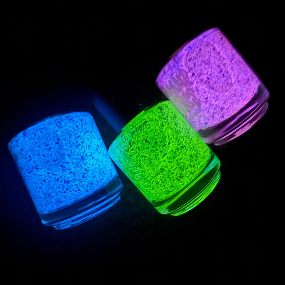 A clear base packed with Aurora shimmer, micro matte hexes, multichrome flakes and pink glow in the dark pigment