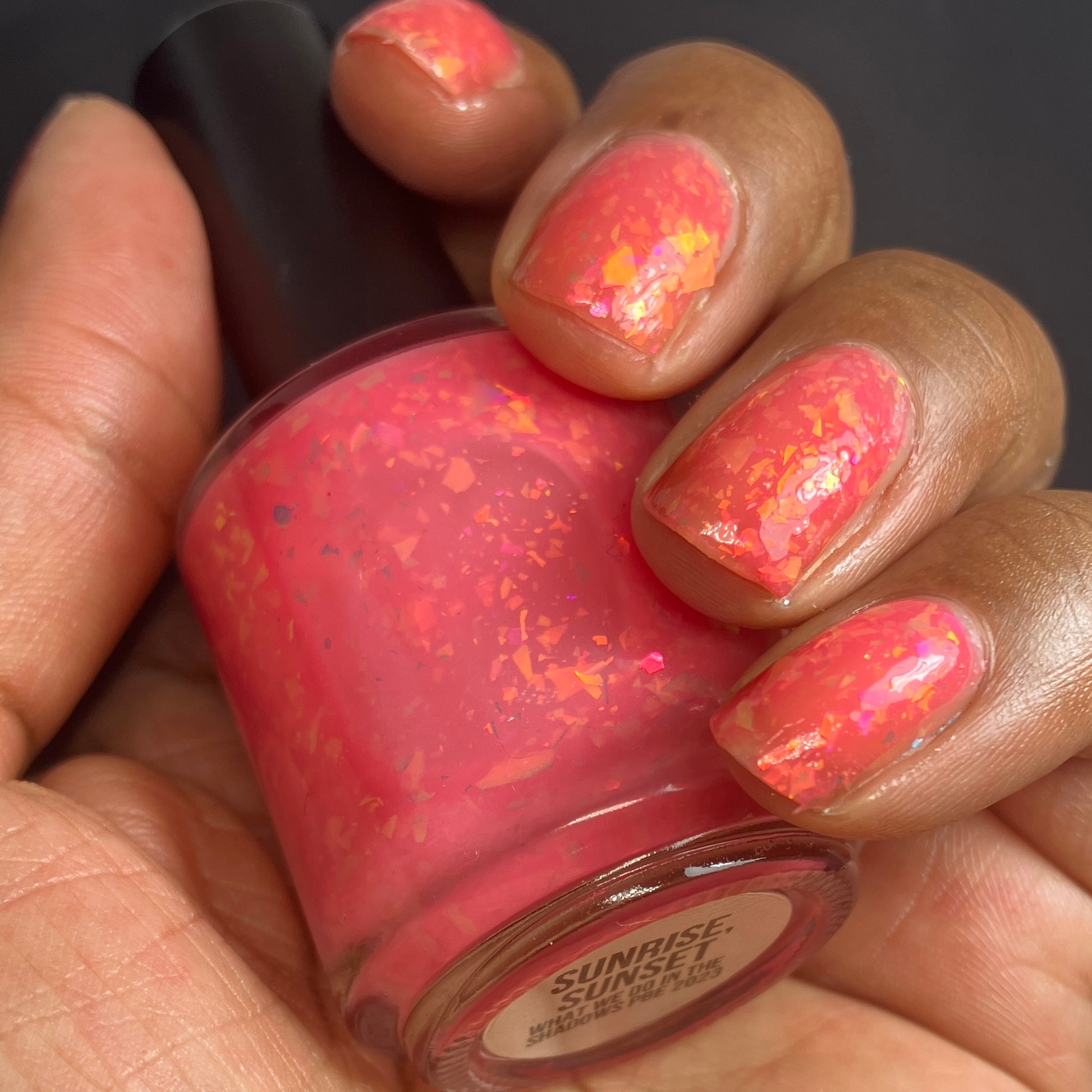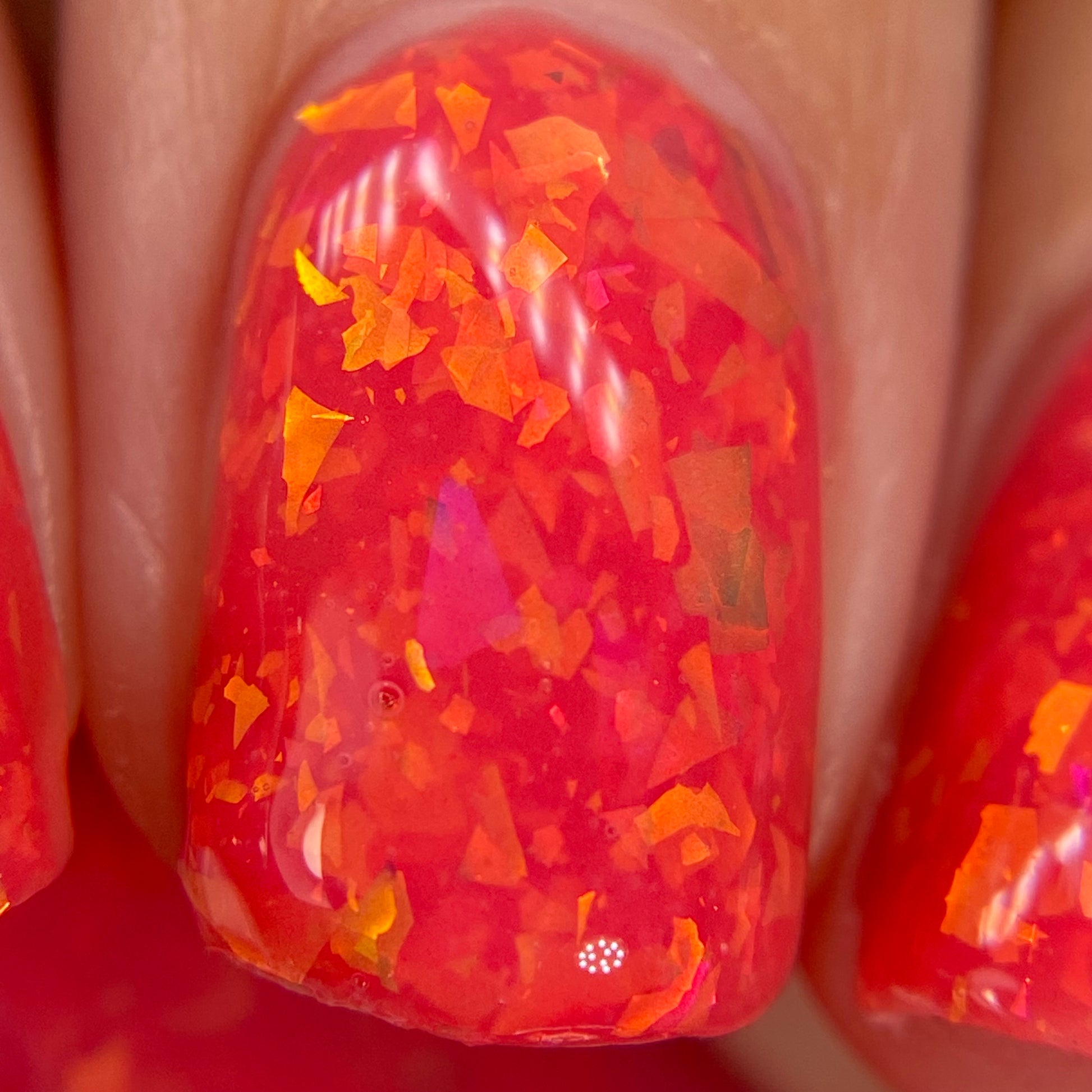 Sunrise, Sunset - a light, peachy red to dark violet maroon solar, packed with violet, red, orange, gold, green iridescent flakes