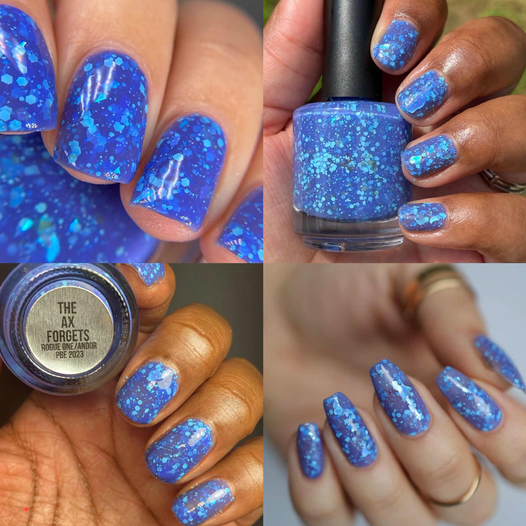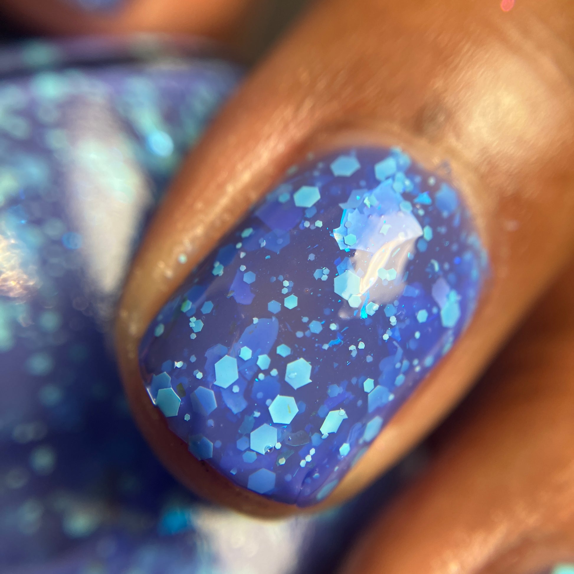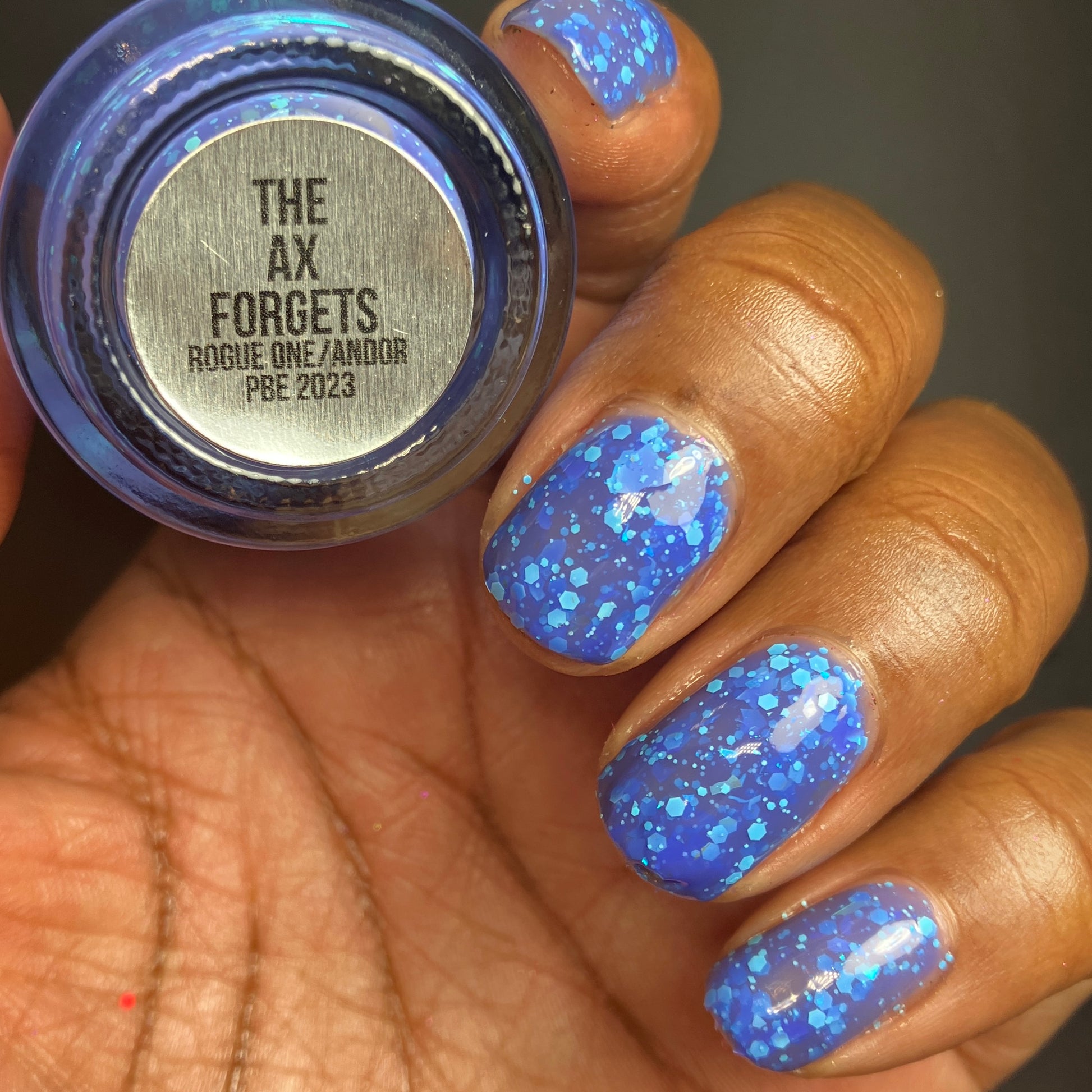 The Ax Forgets - a lightened indigo with large silver, teal, blue iridescent flakes and aqua matte hexes