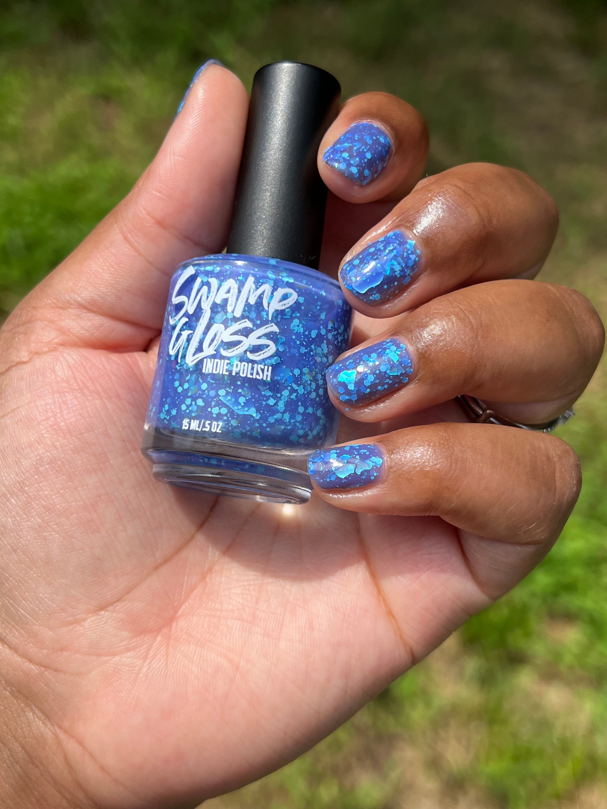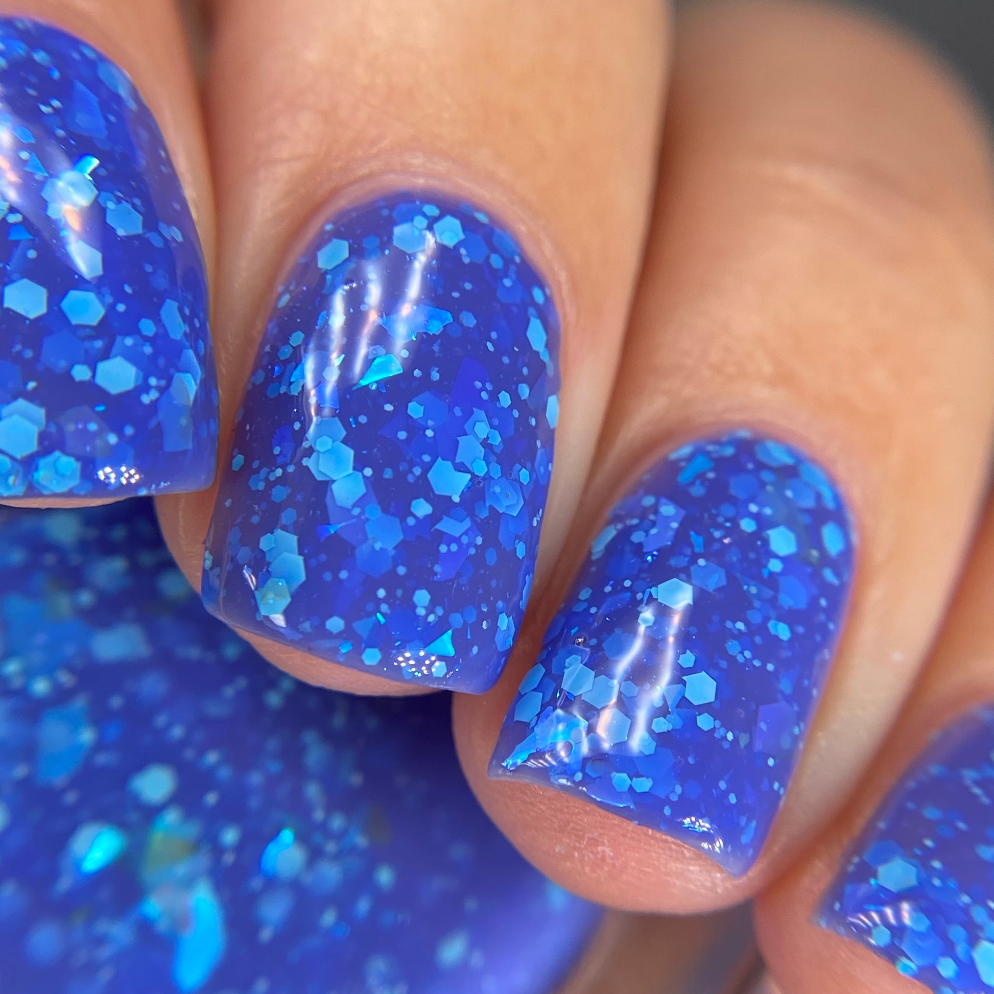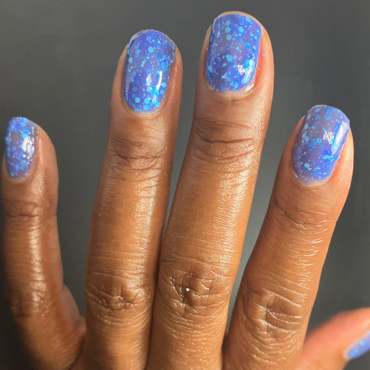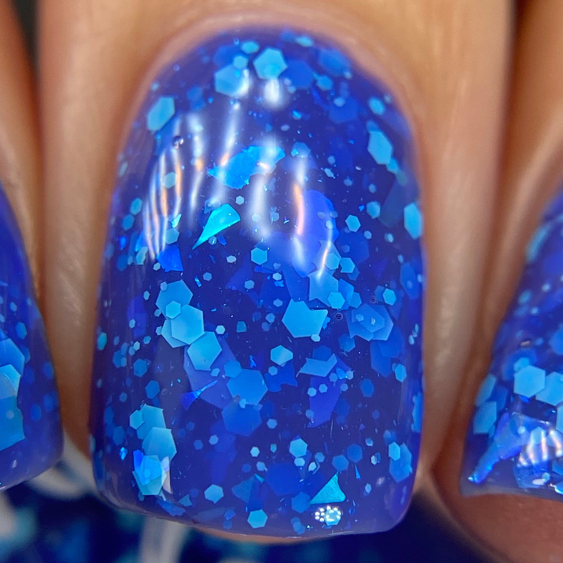 The Ax Forgets - a lightened indigo with large silver, teal, blue iridescent flakes and aqua matte hexes