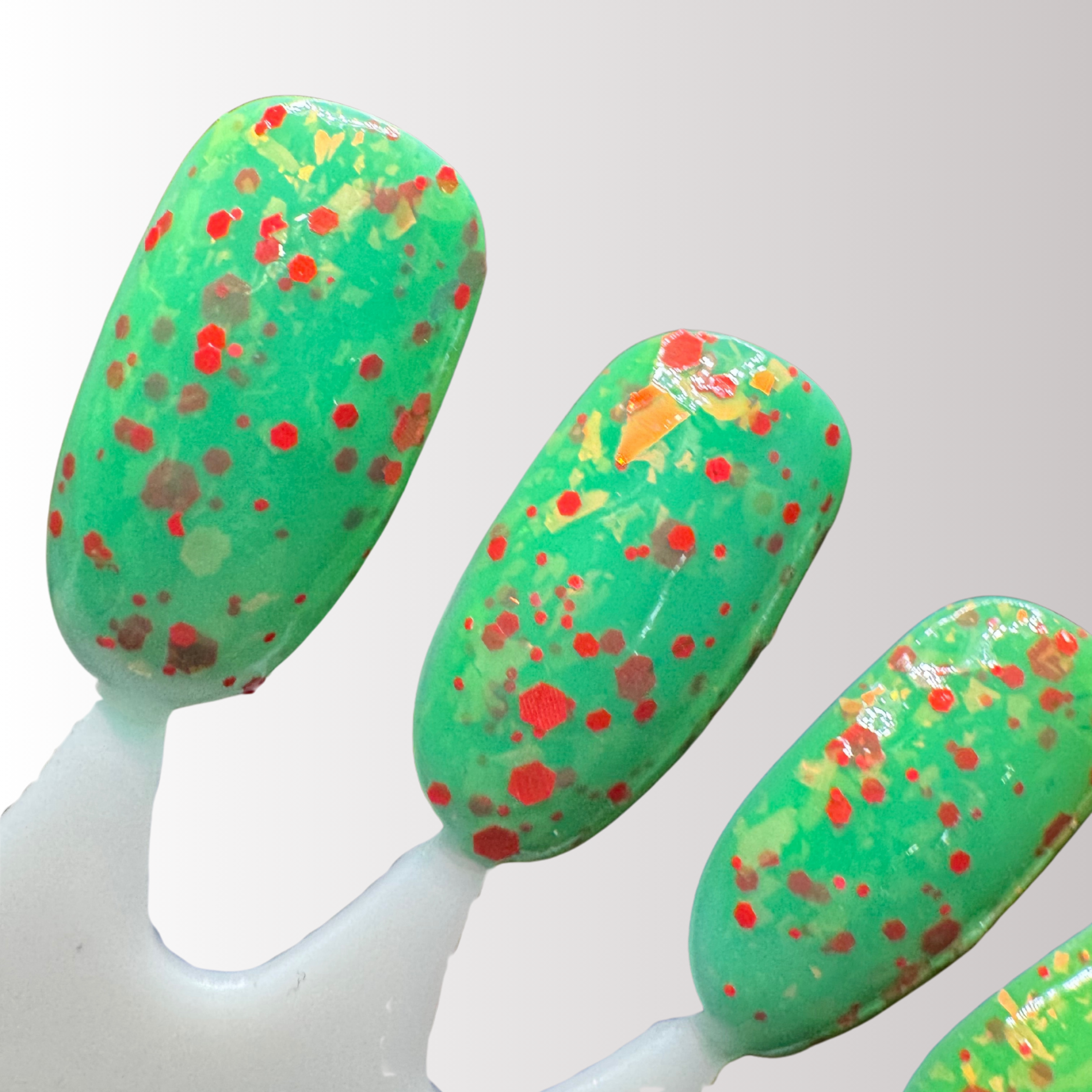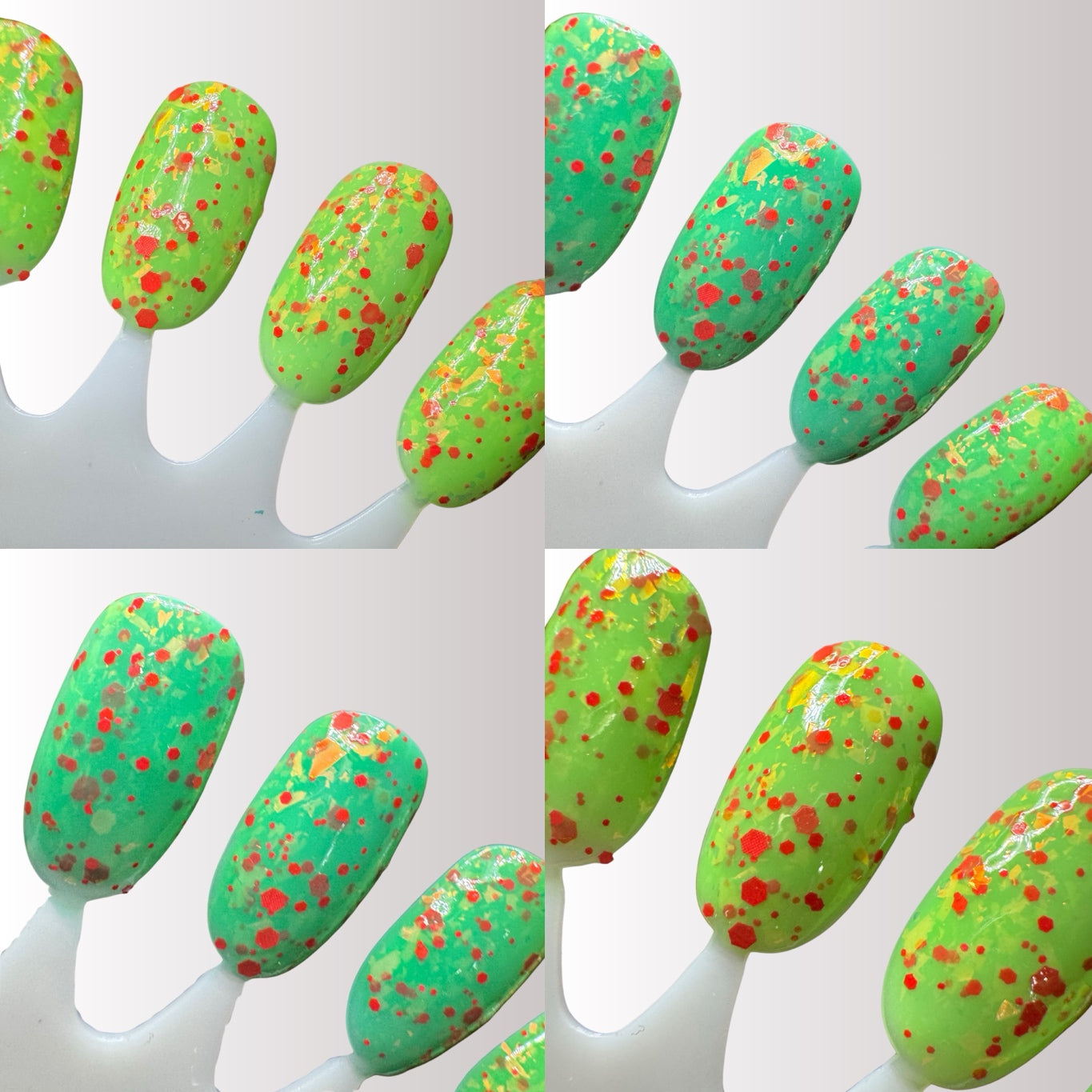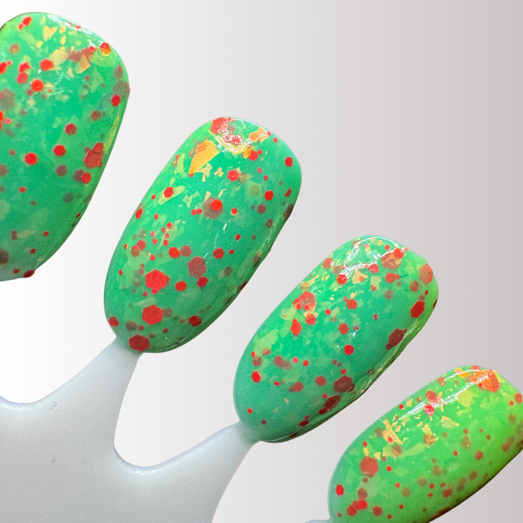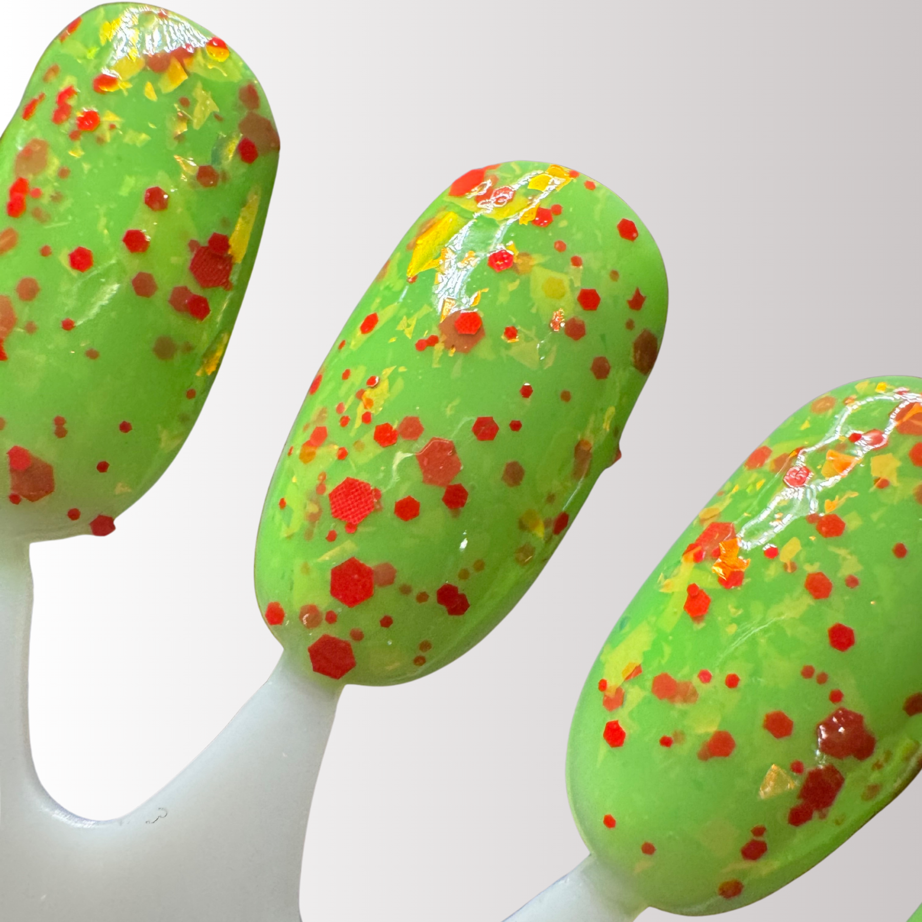 A bright neon green to darker teal spring green solar polish with red hexes in various sizes and iridescent shifting flakes.  This polish is very UV Sensitive and will revert to its resting color, neon green, when exposure to UV rays is removed.