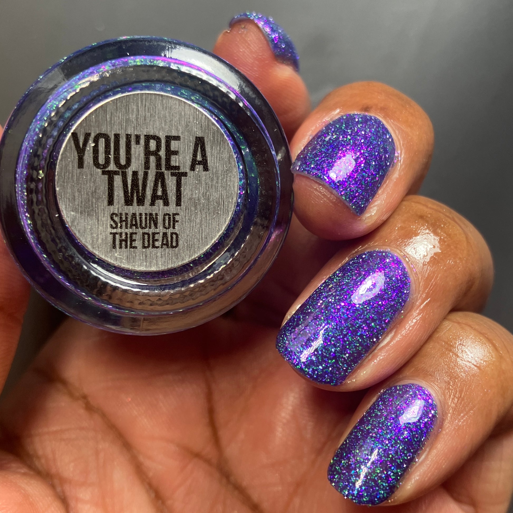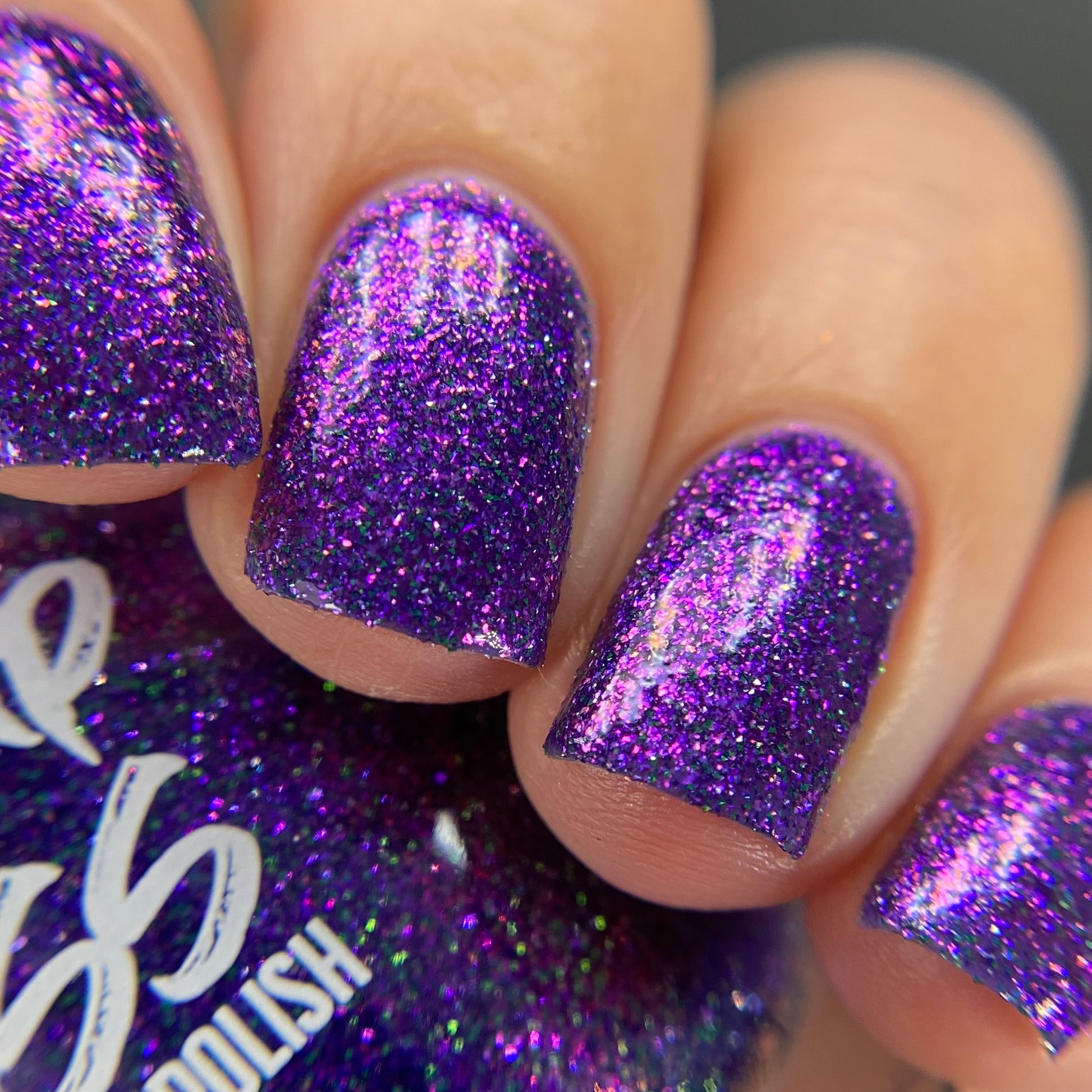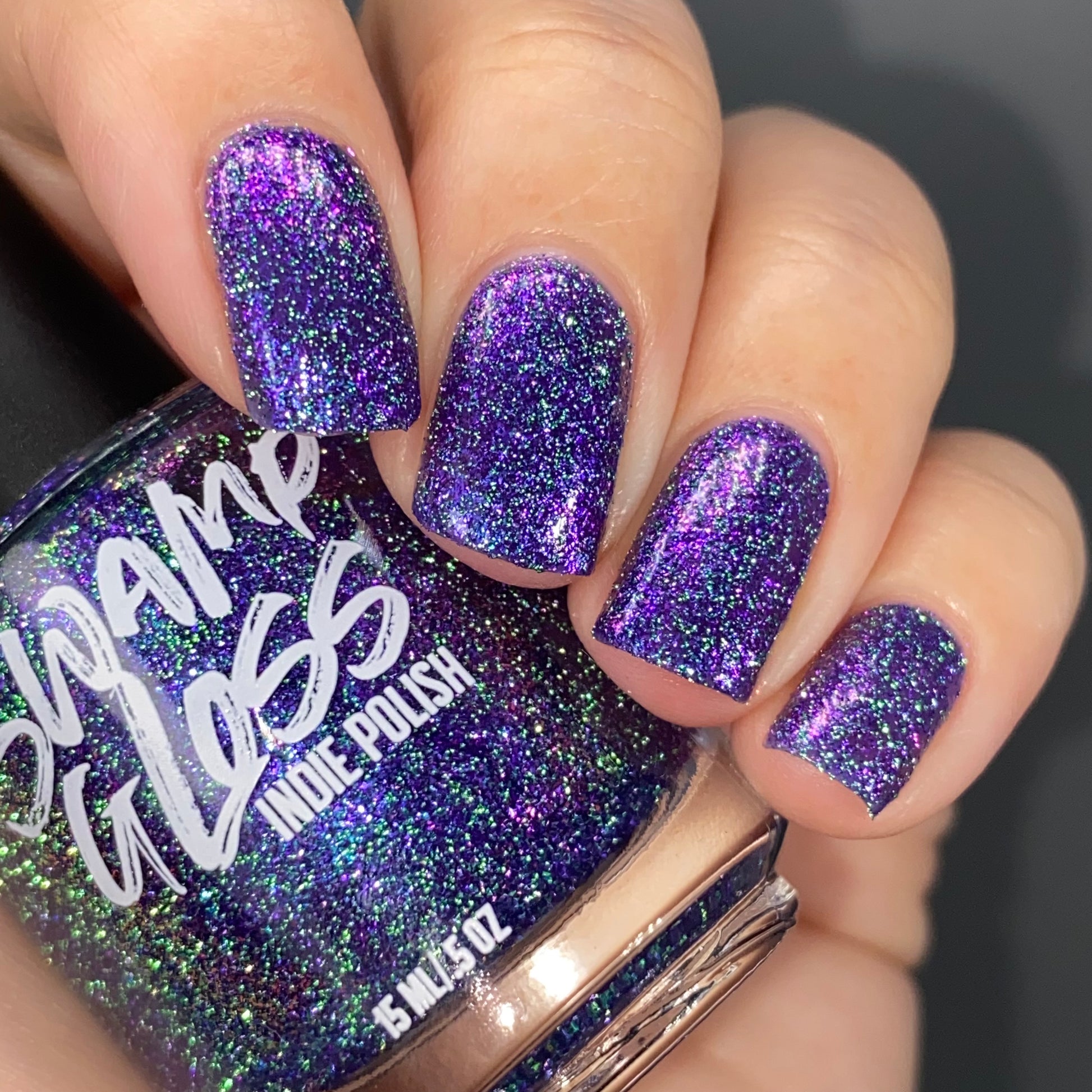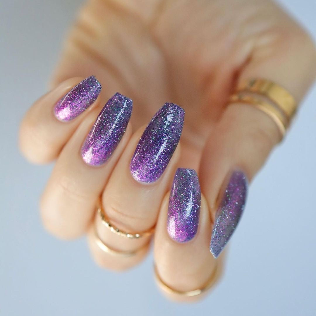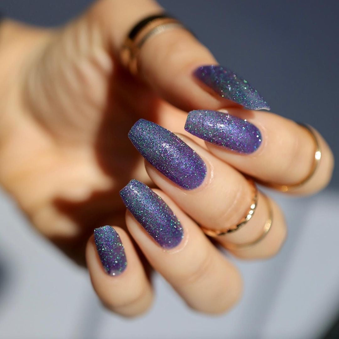 A dusty purple base with vibrant shifting shimmer and reflective glitters